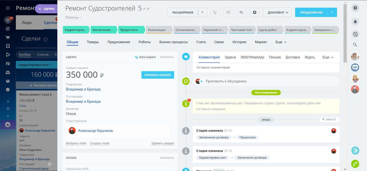 Если направление «Ремонты», то на первом этапе он должен скорректировать сметы с клиентом, а дальше заключить договор и запустить проект в работу.