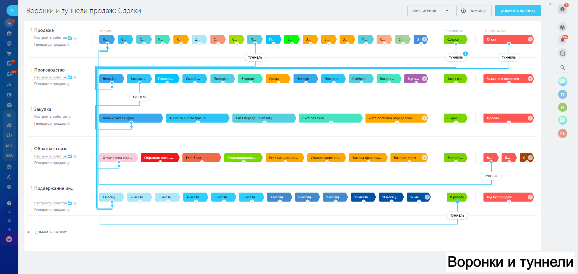 Содержит процессы лидогенерации, продажа товара с производства, производственная воронка, процесс закупки.