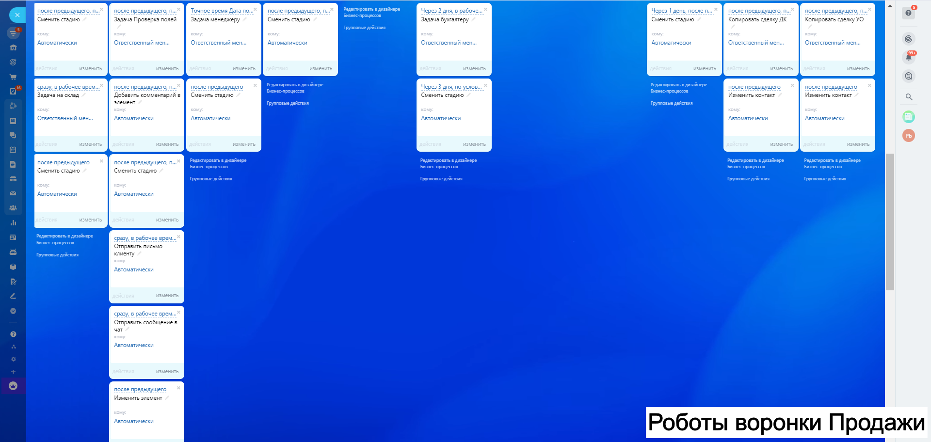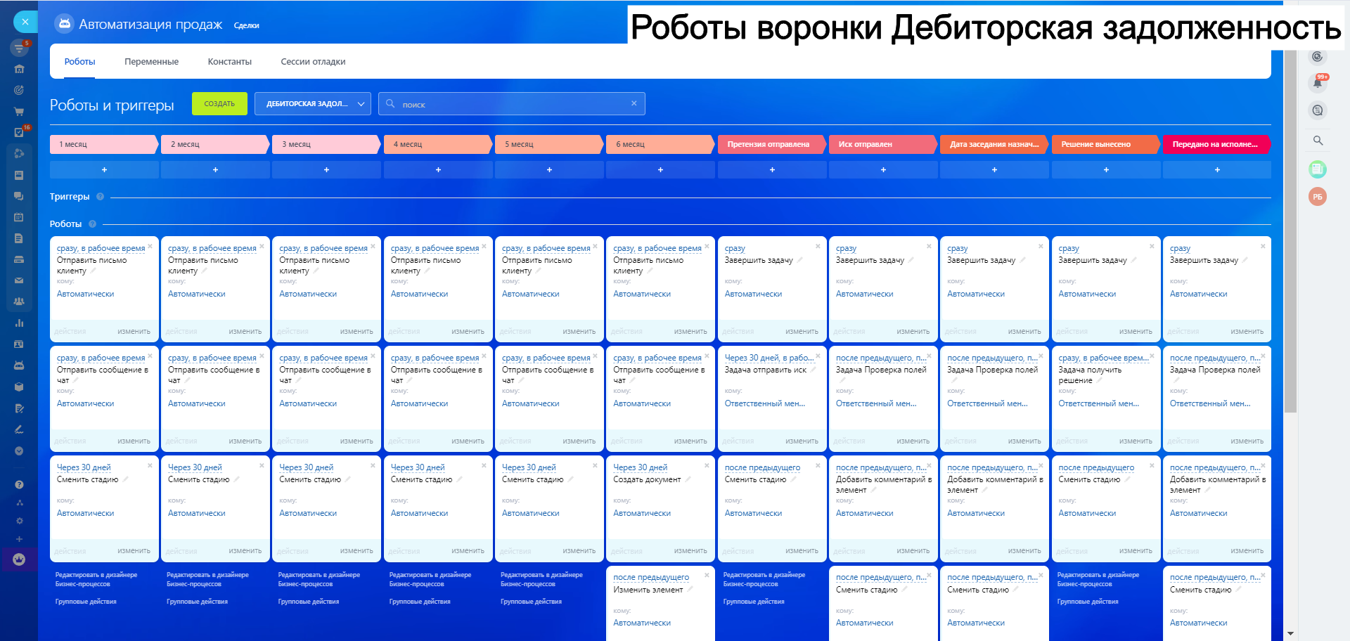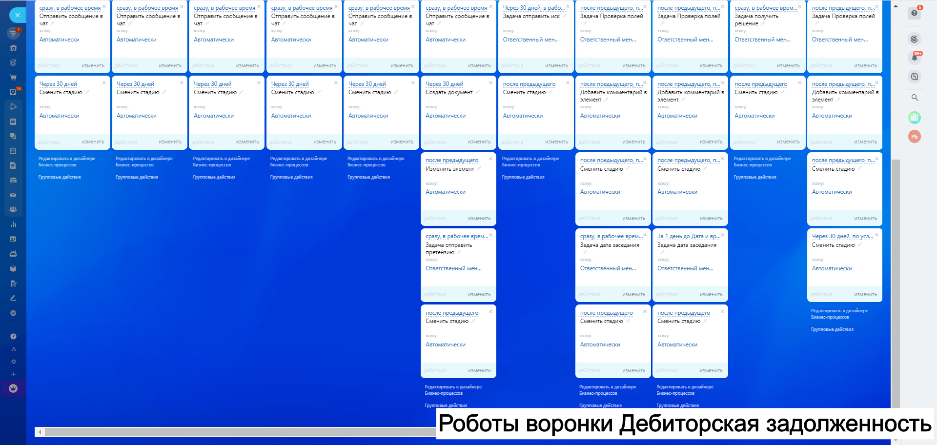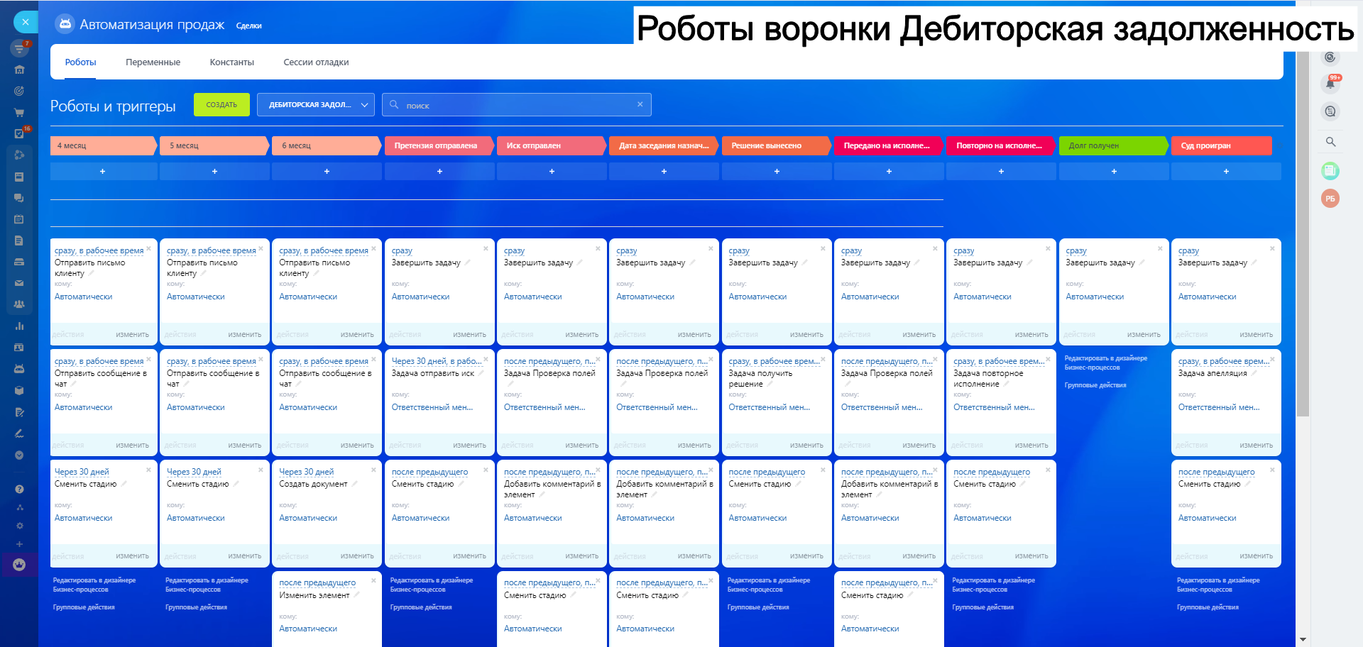 8. Автоворонку Дебиторская задолженность - для работы с клиентами по отсрочке и взысканий задолженности как финансовой так и закрывающих документов