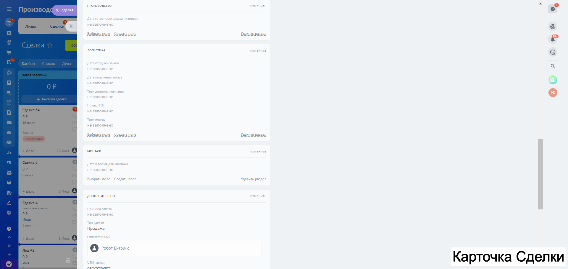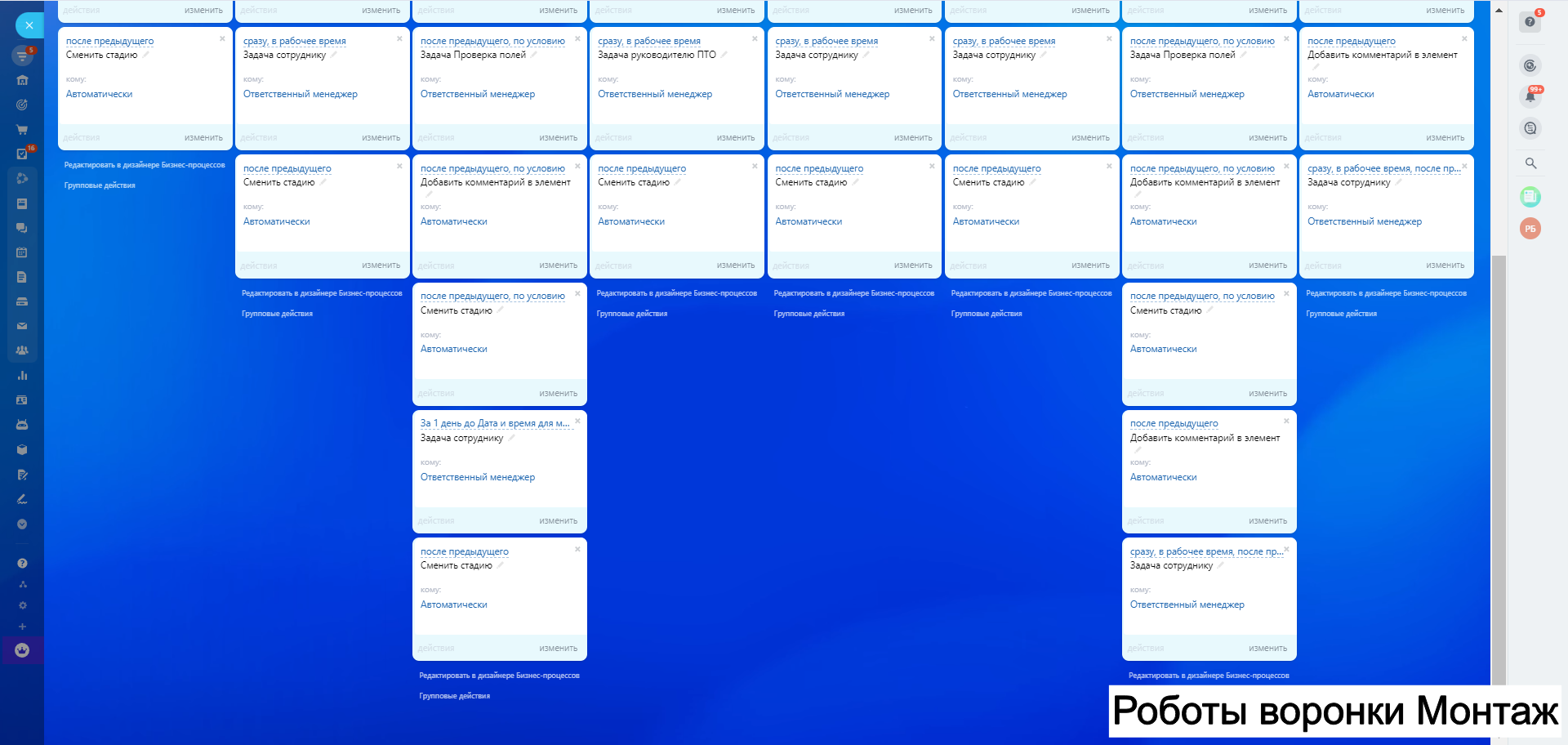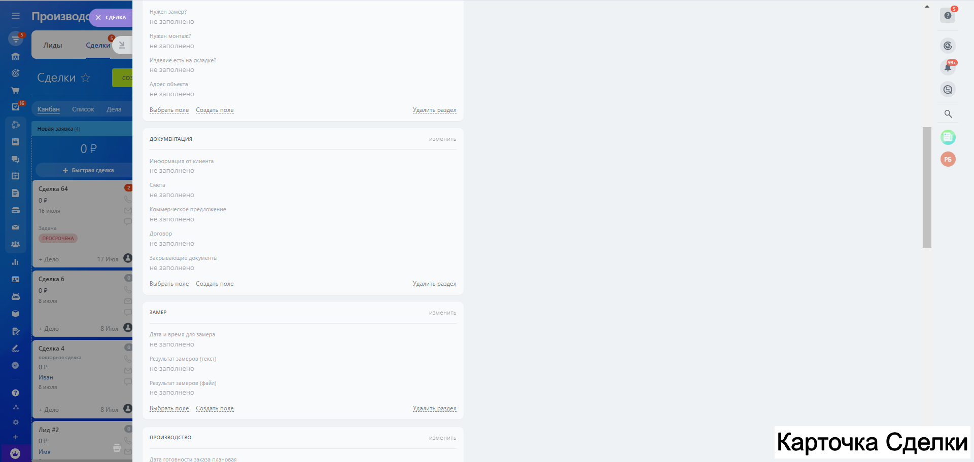 Содержит процессы лидогенерации, продажа товара с производства, производственная воронка, монтаж, процесс закупки, процесс подрядного производства.