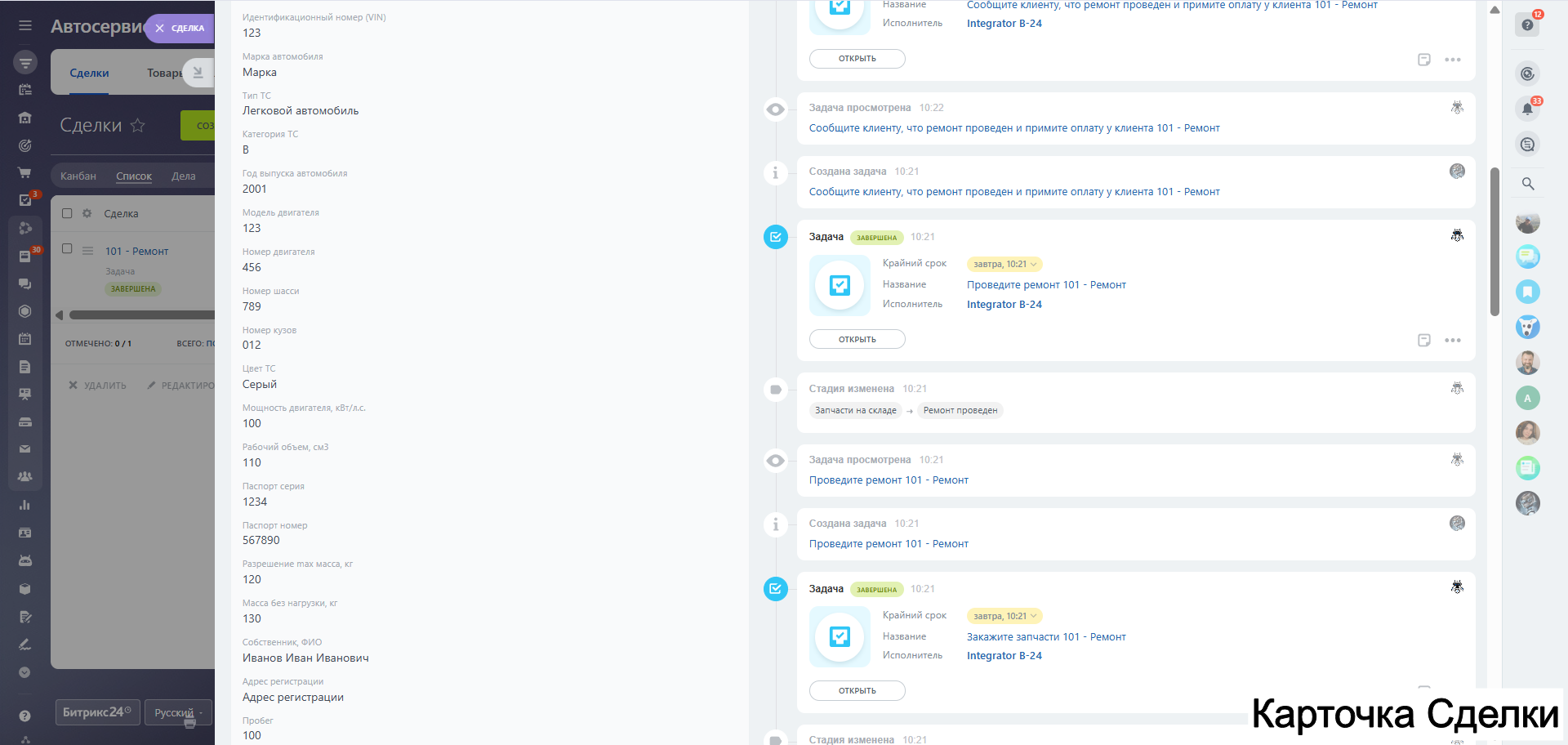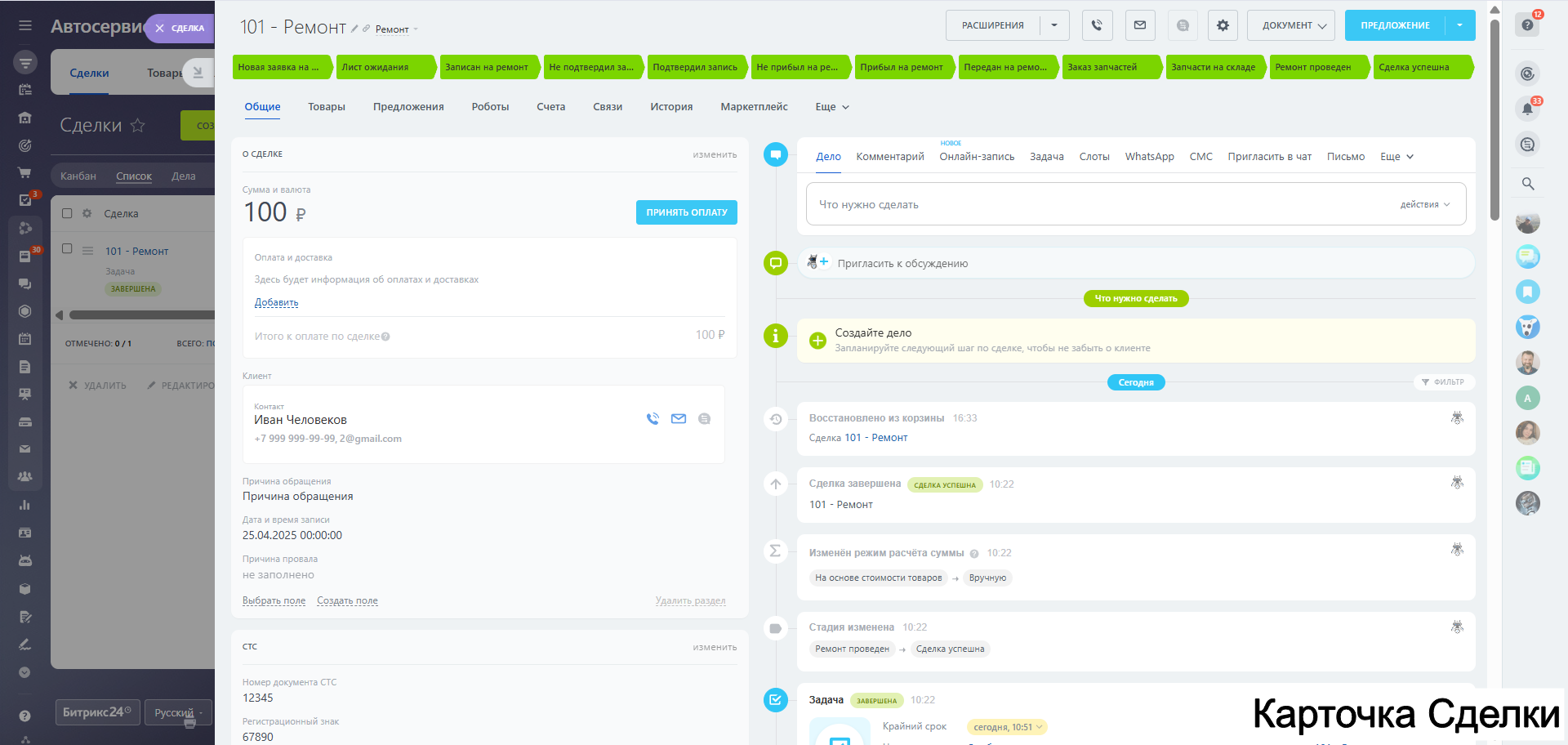 Наше готовое CRM-решение для автосервиса на базе Битрикс24 заменит хаотичные записи в блокнотах и Excel, избавит от «неявок» и поможет систематизировать все процессы: от записи до выдачи автомобиля.