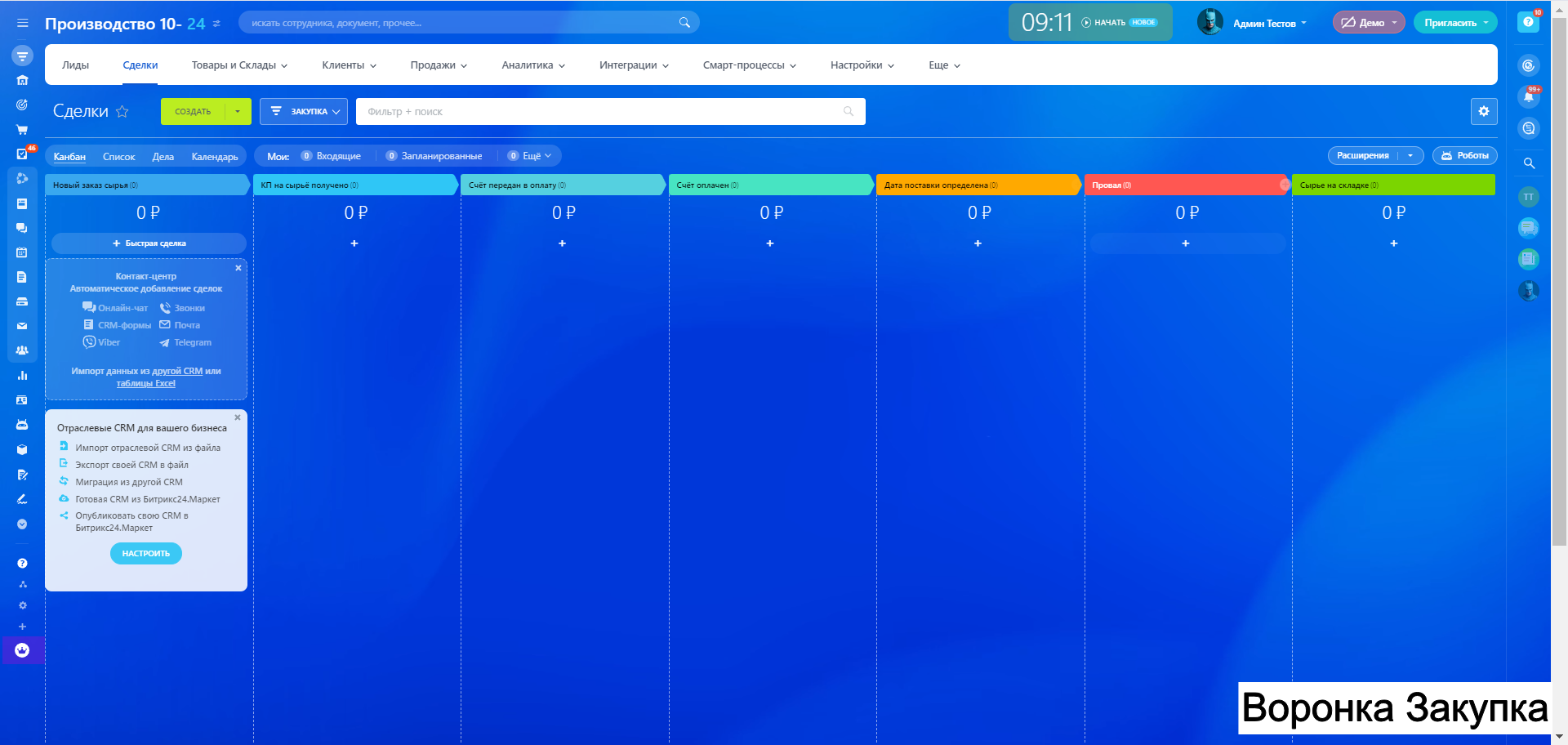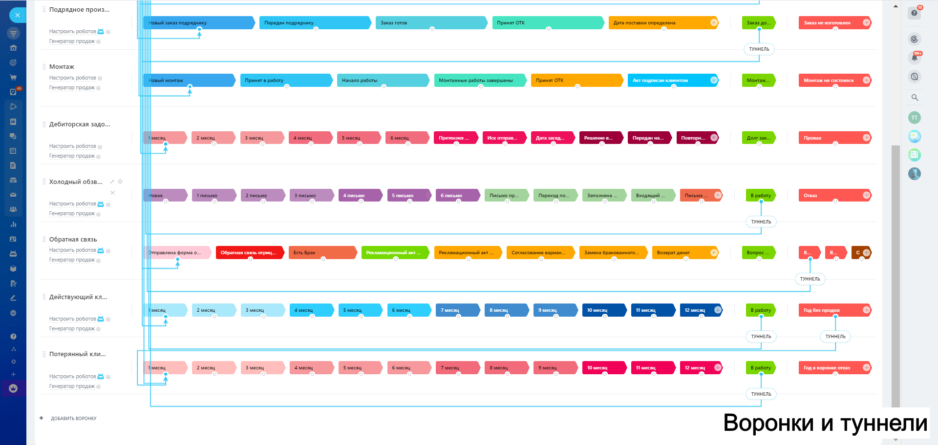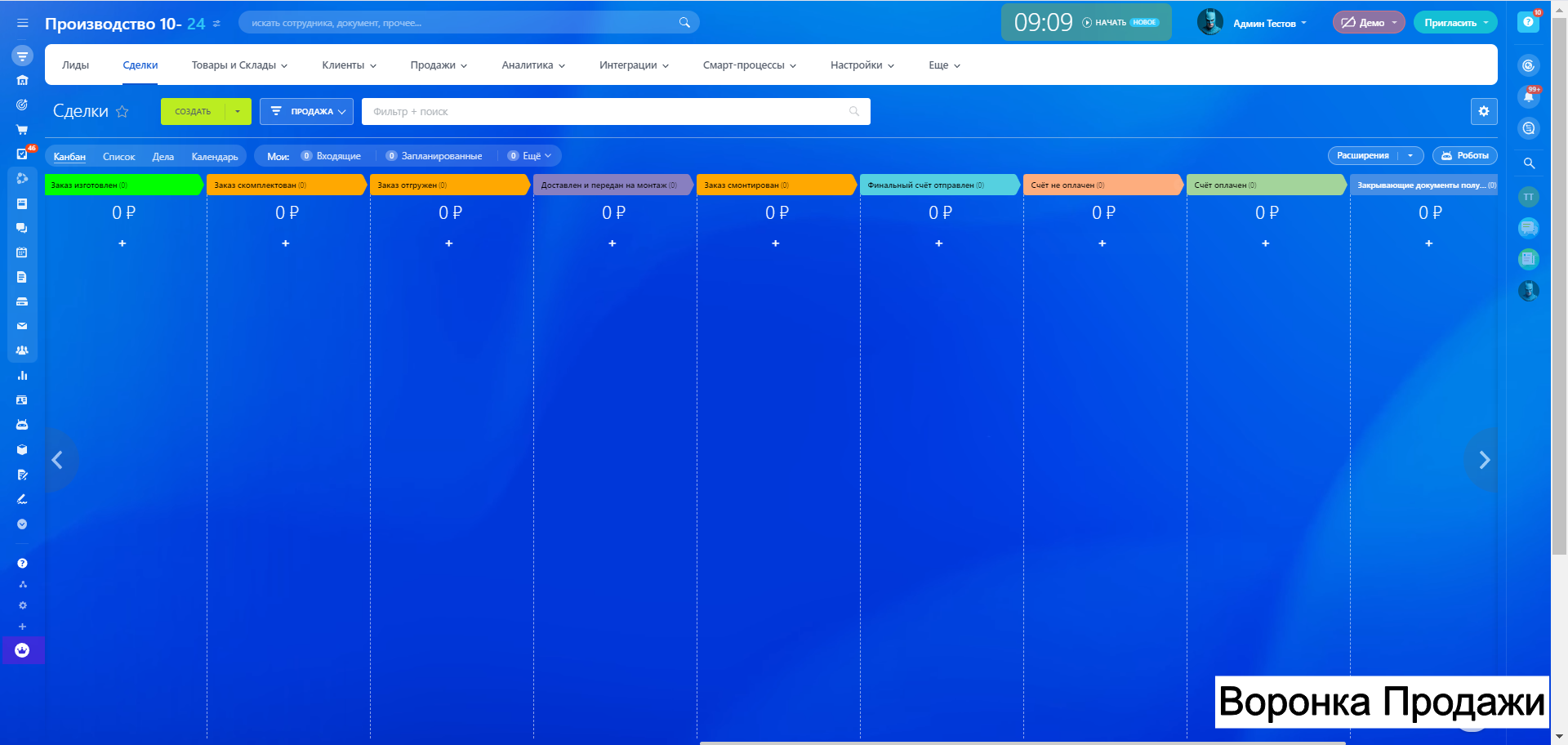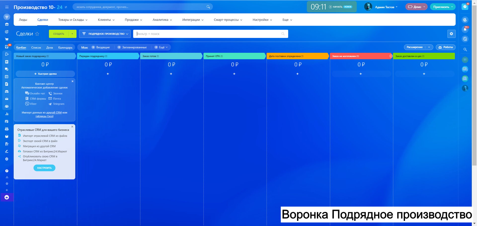 Содержит процессы лидогенерации, продажа товара с производства, производственная воронка, монтаж, процесс закупки, процесс подрядного производства.