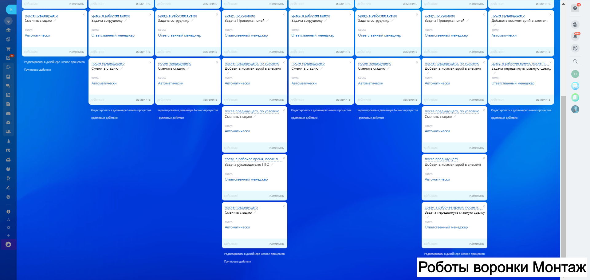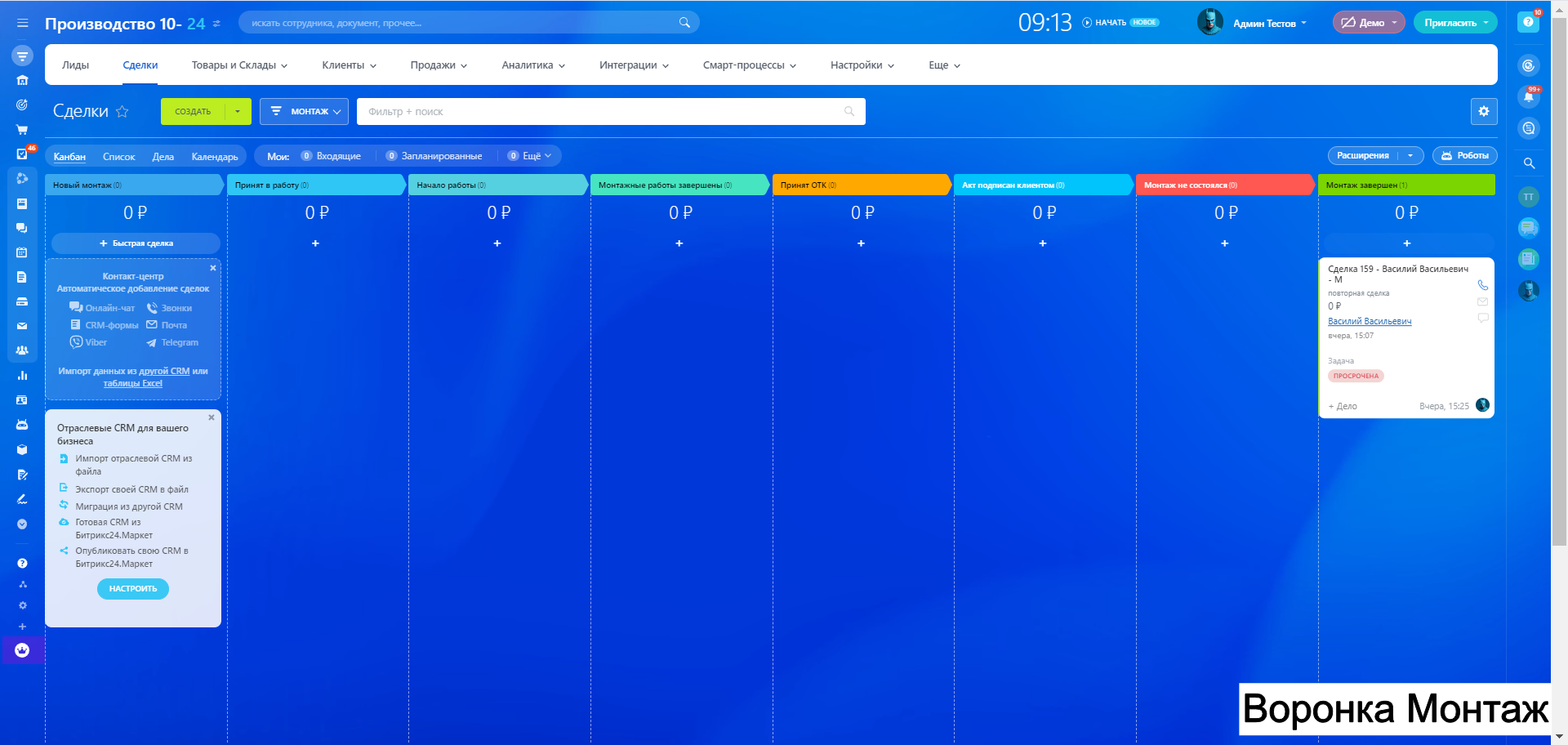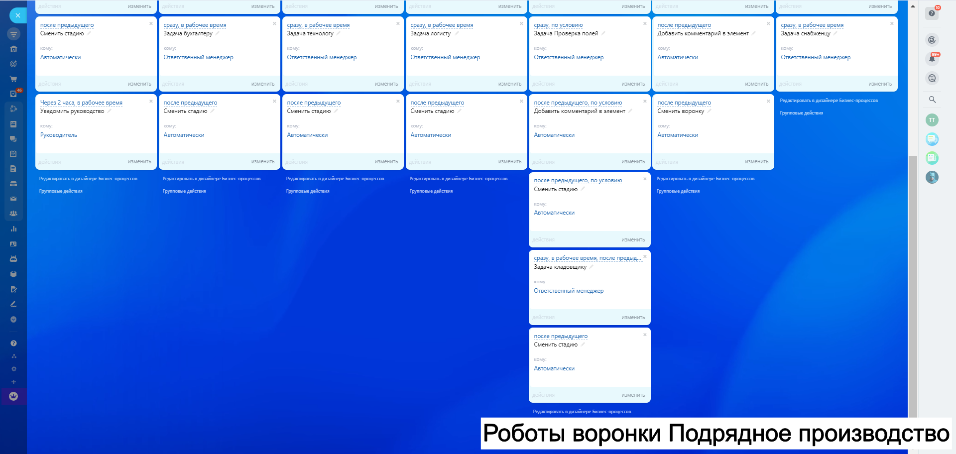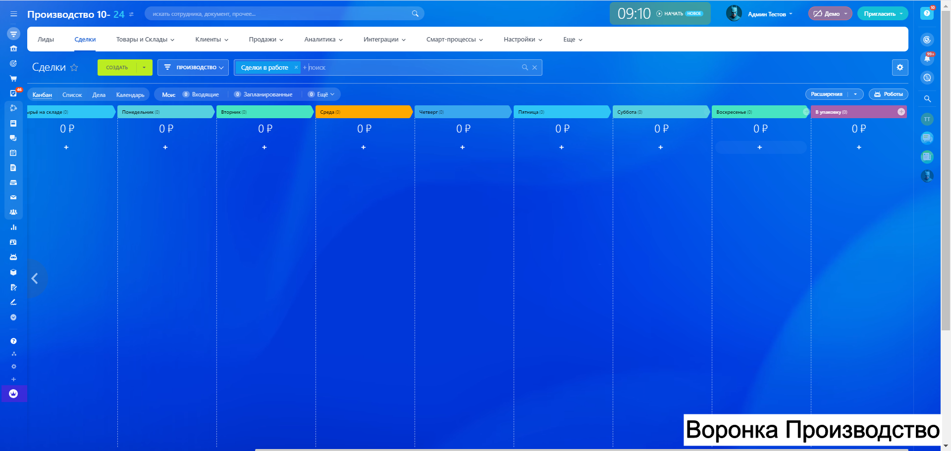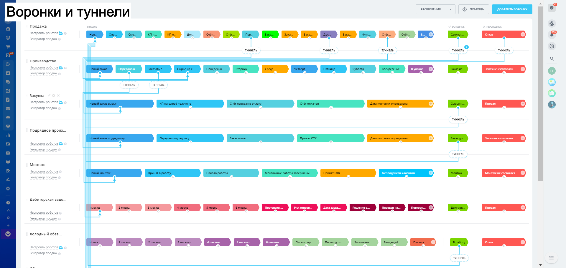 Содержит процессы лидогенерации, продажа товара с производства, производственная воронка, монтаж, процесс закупки, процесс подрядного производства.