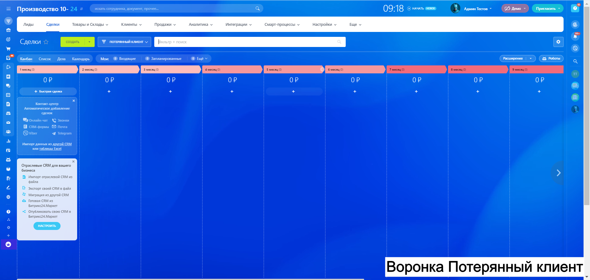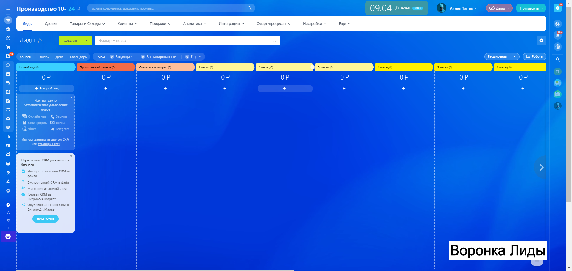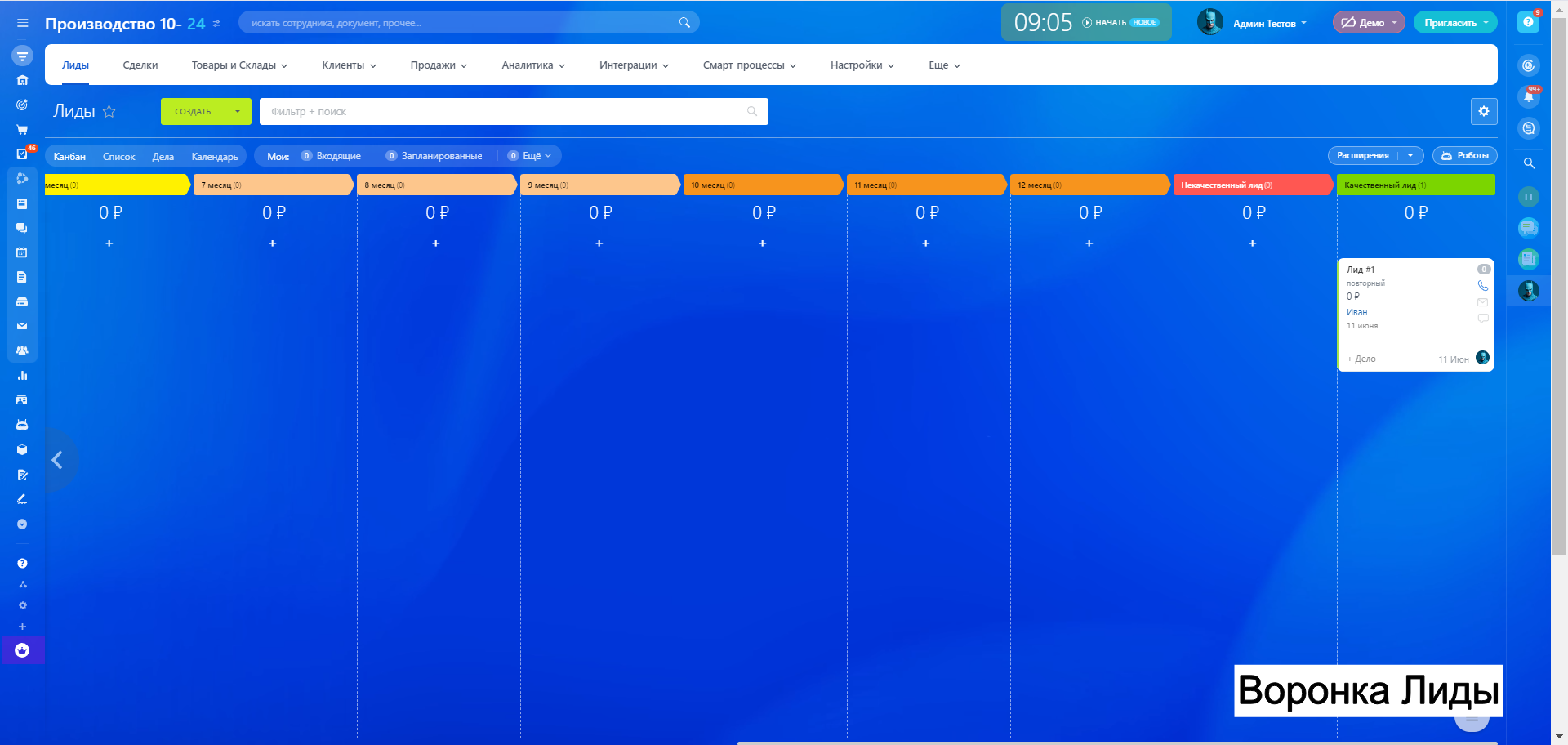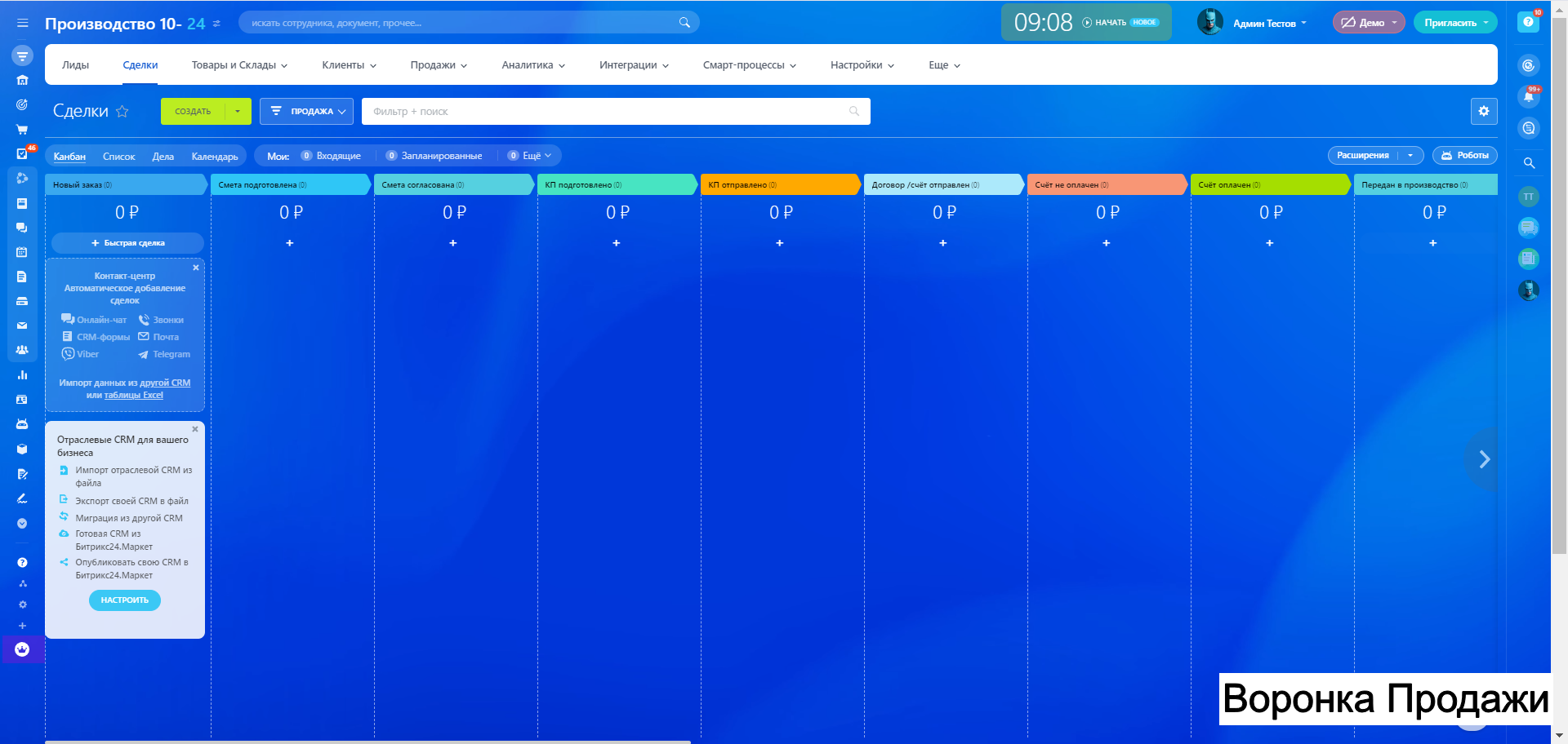 Содержит процессы лидогенерации, продажа товара с производства, производственная воронка, монтаж, процесс закупки, процесс подрядного производства.
