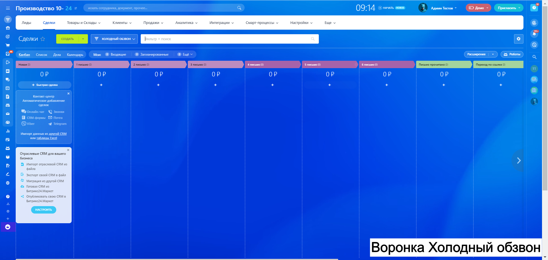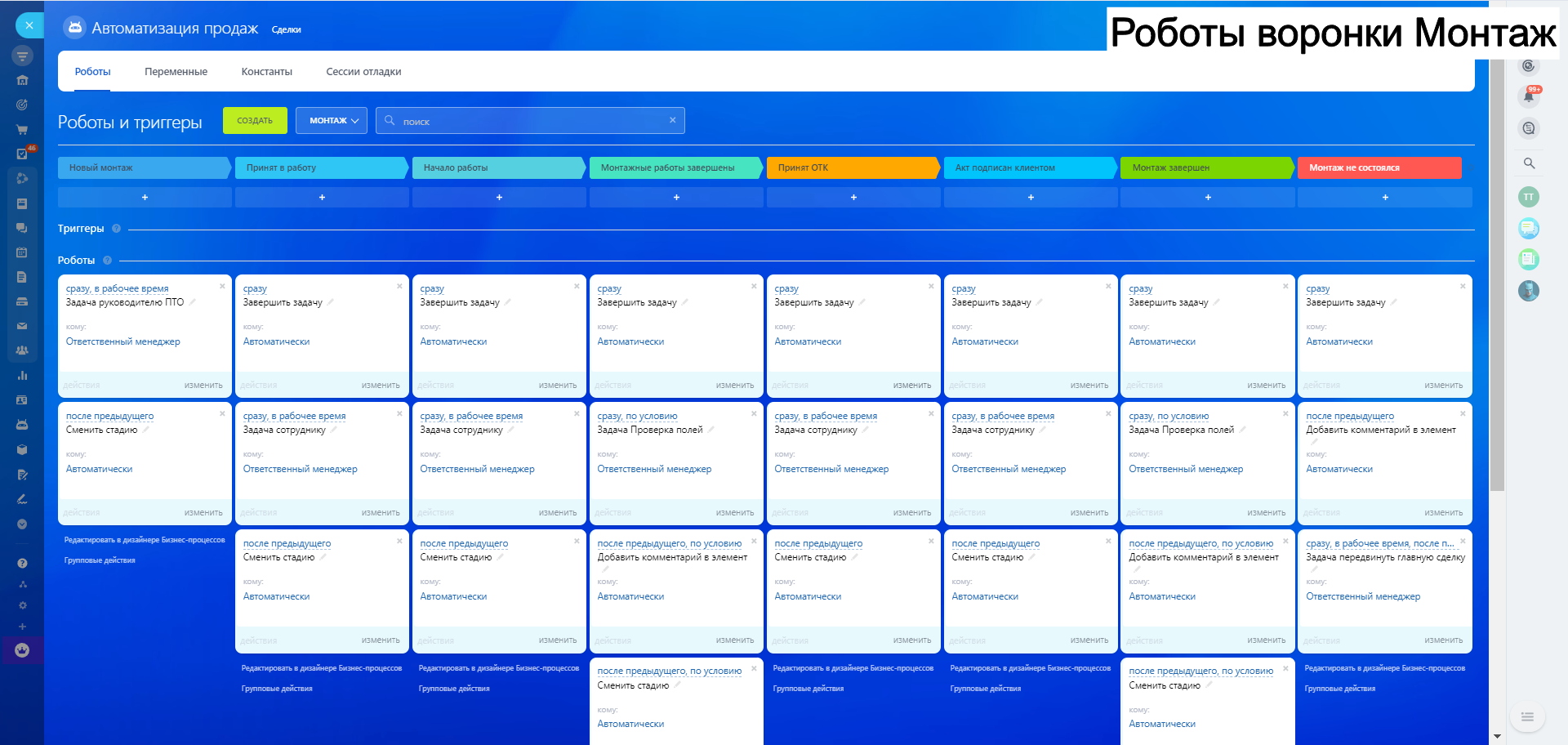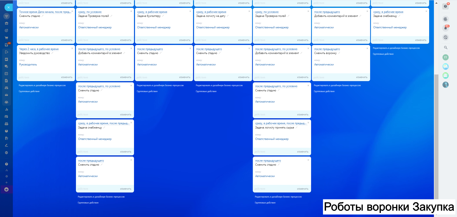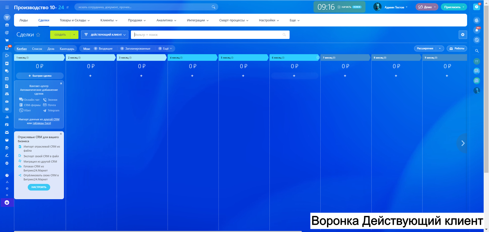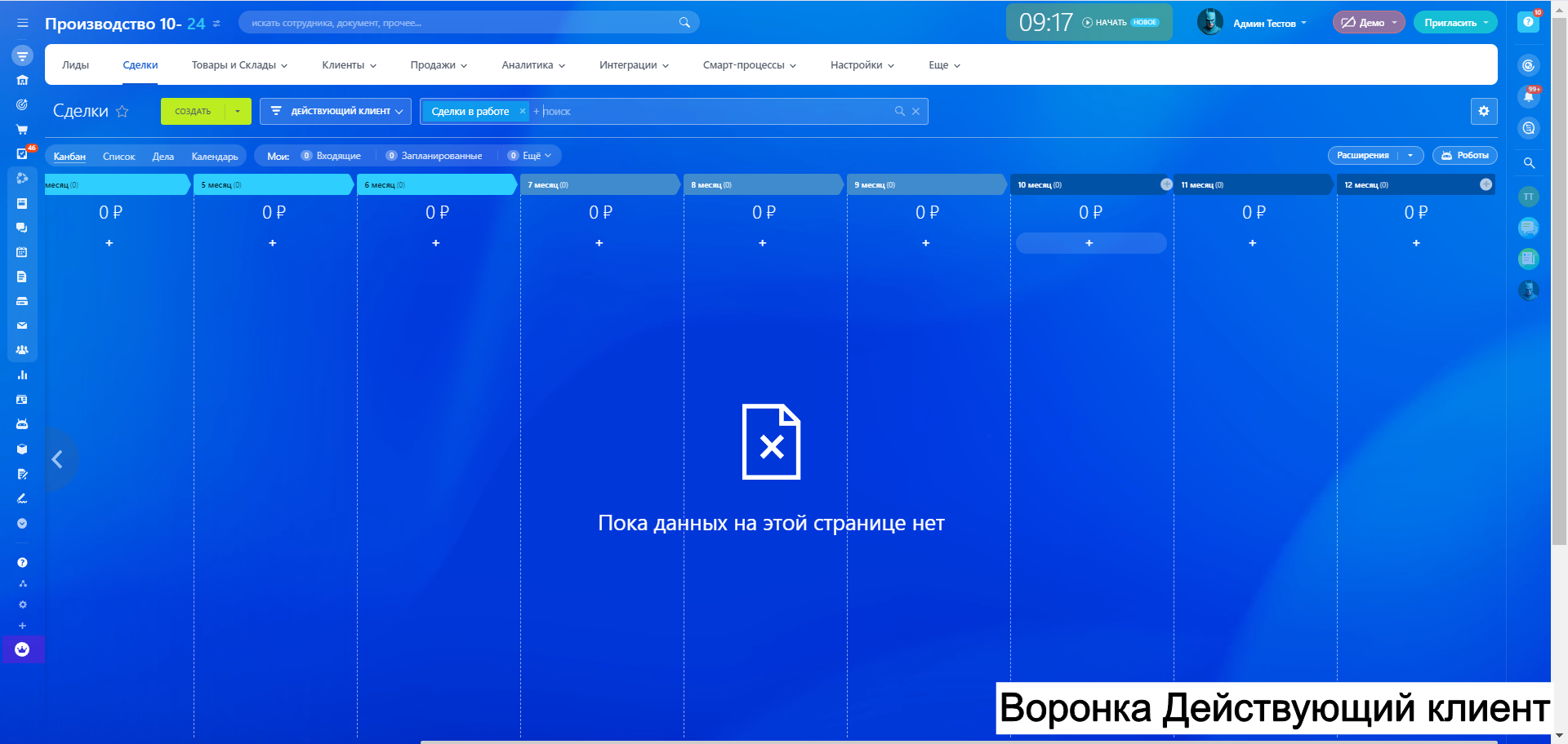 Содержит процессы лидогенерации, продажа товара с производства, производственная воронка, монтаж, процесс закупки, процесс подрядного производства.