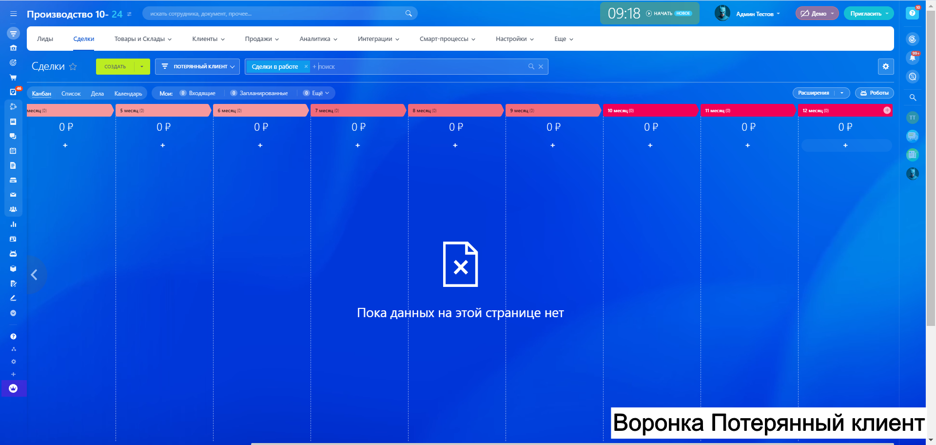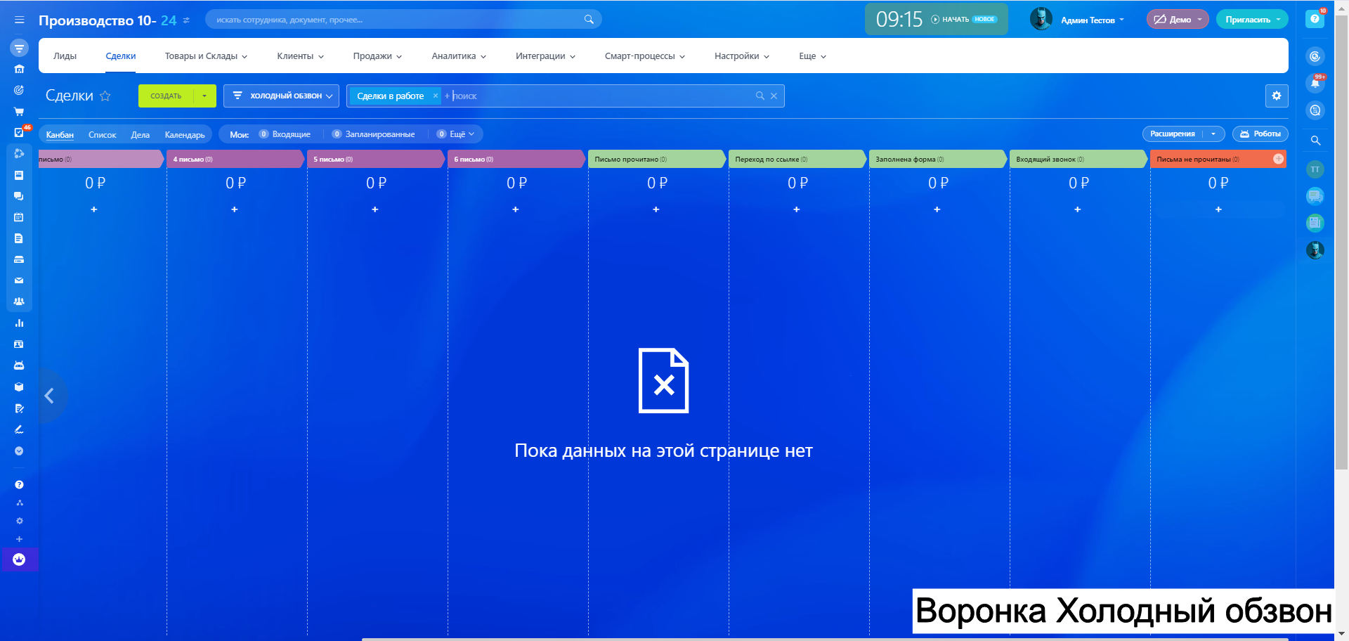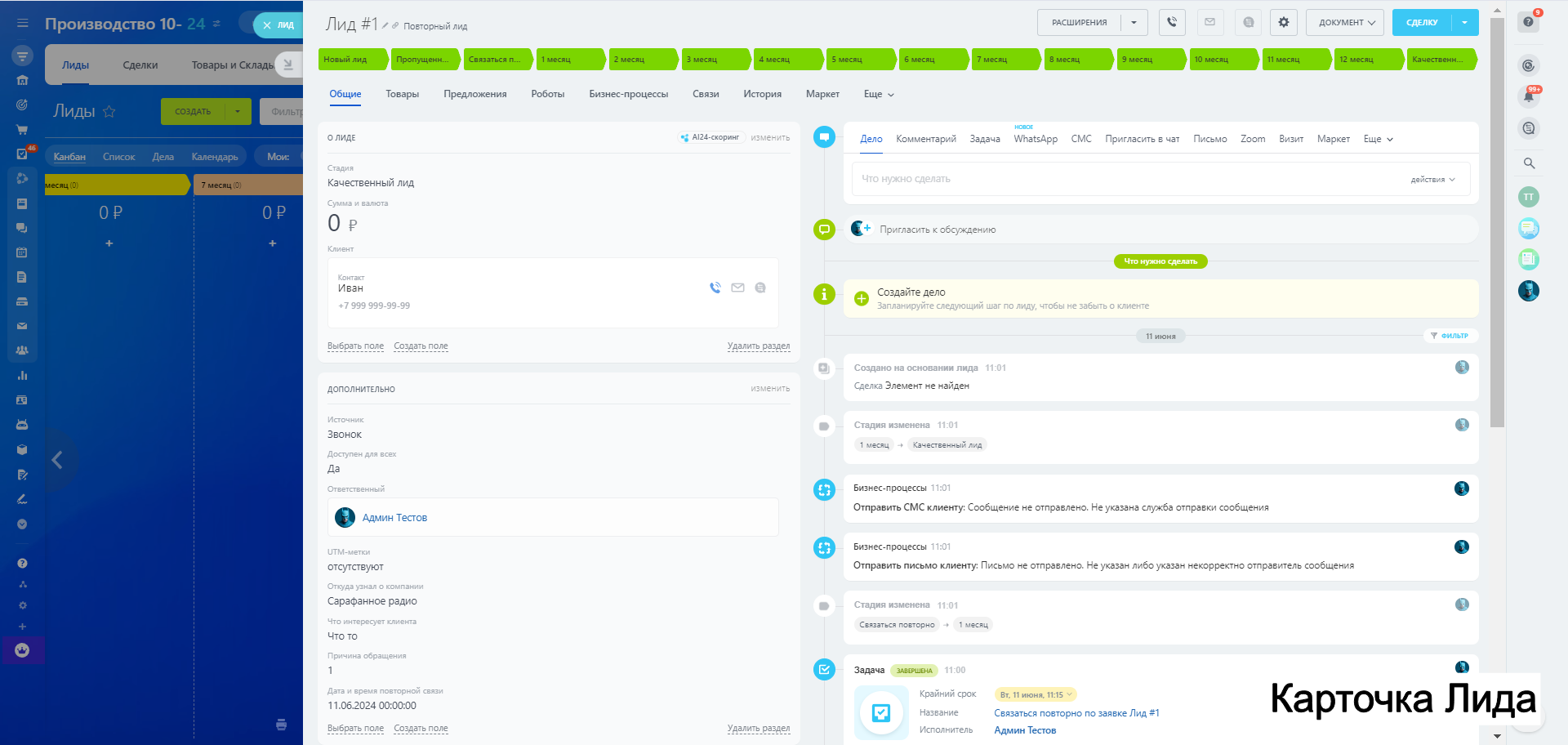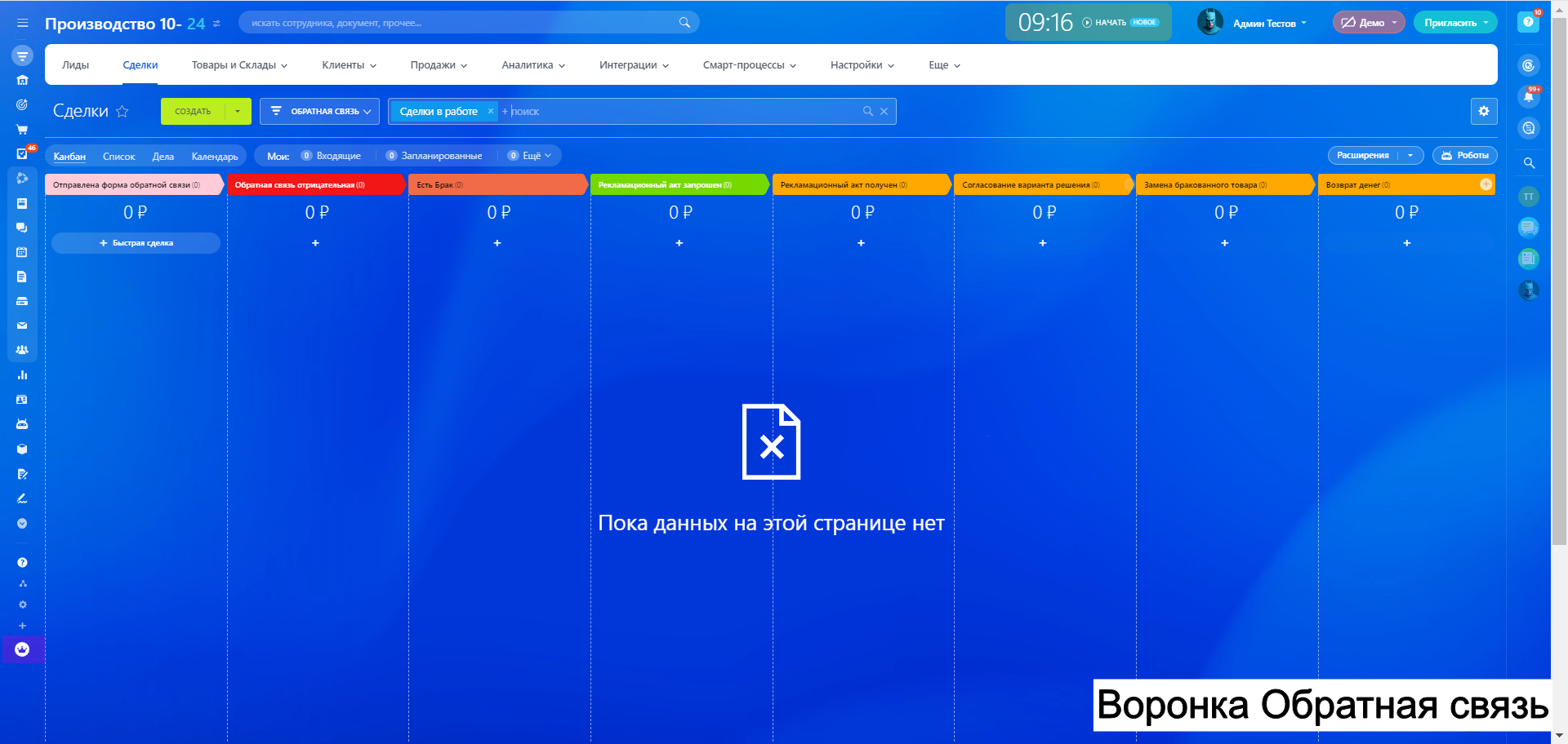 Содержит процессы лидогенерации, продажа товара с производства, производственная воронка, монтаж, процесс закупки, процесс подрядного производства.