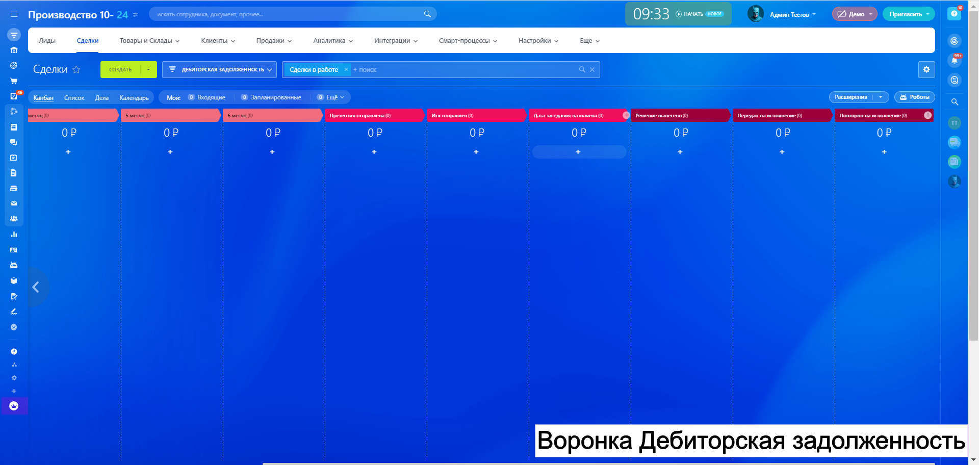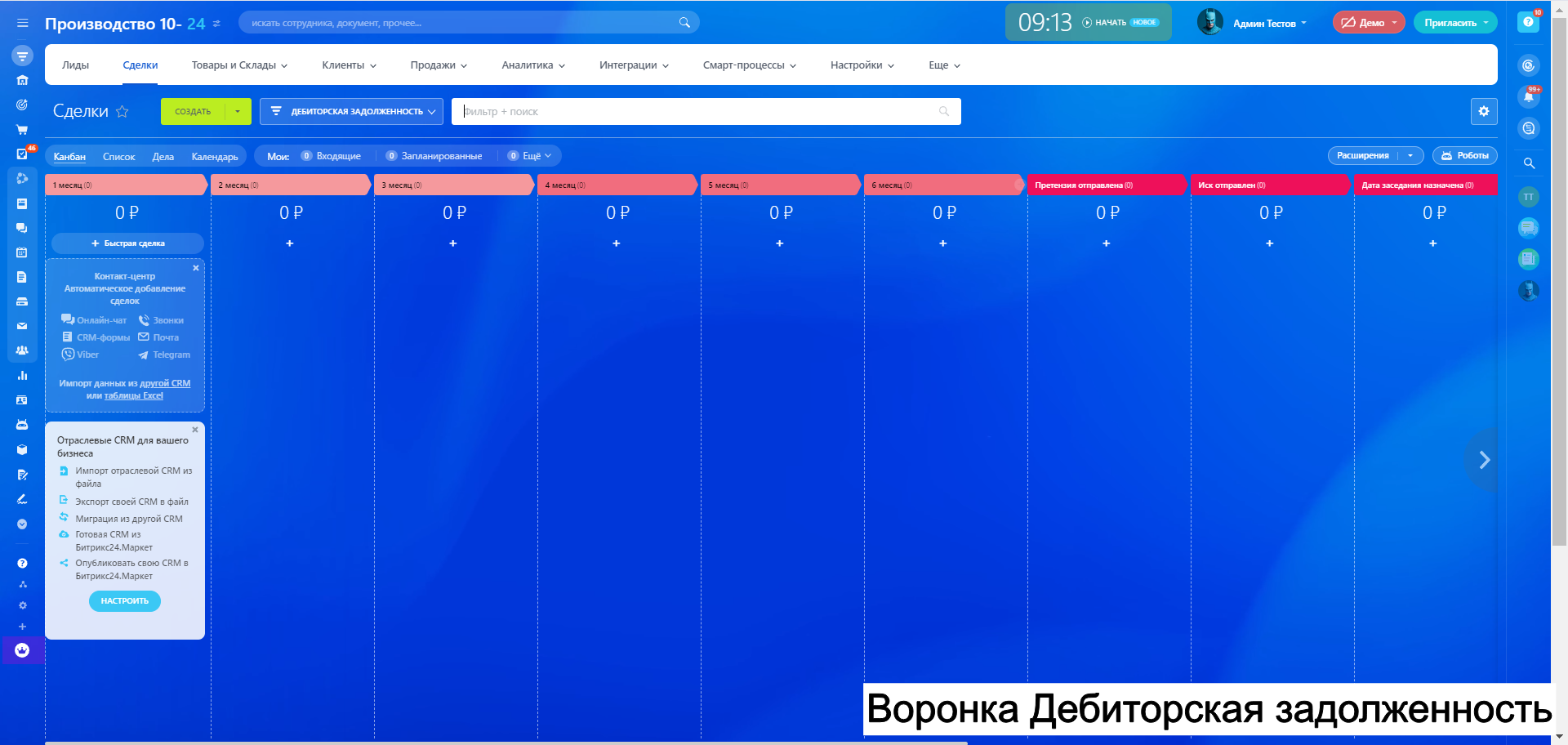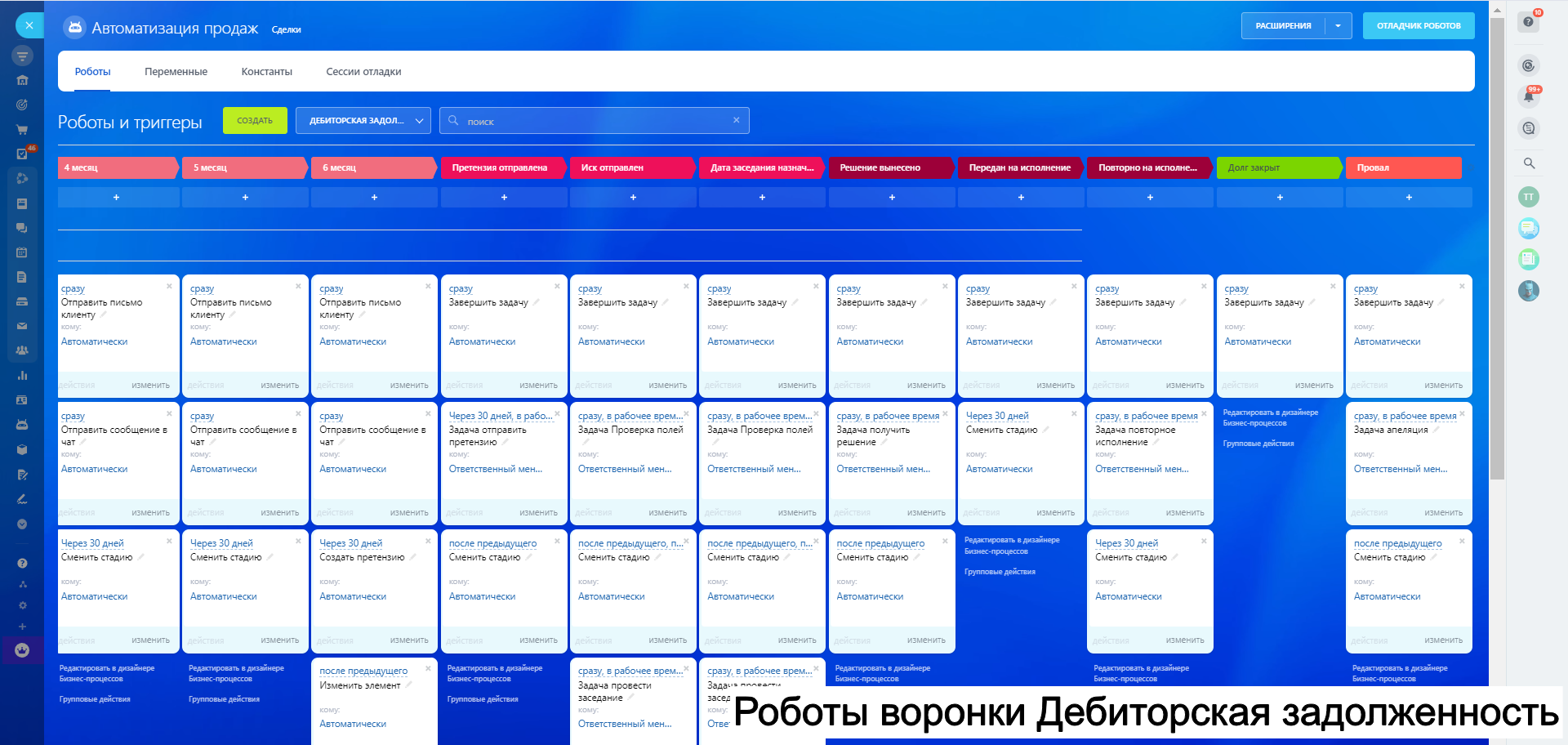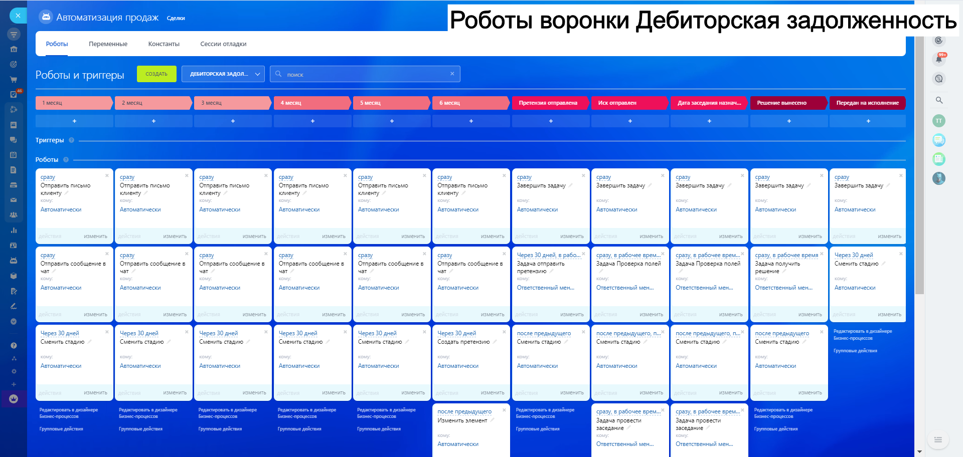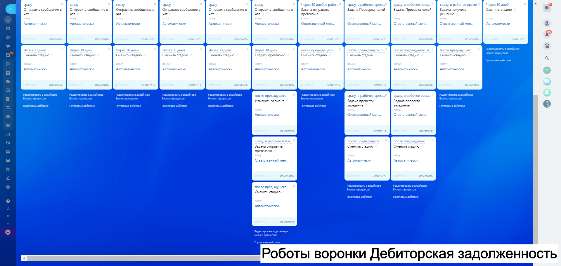 8. Автоворонку Дебиторская задолженность - для работы с клиентами по отсрочке и взысканий задолженности как финансовой так и закрывающих документов