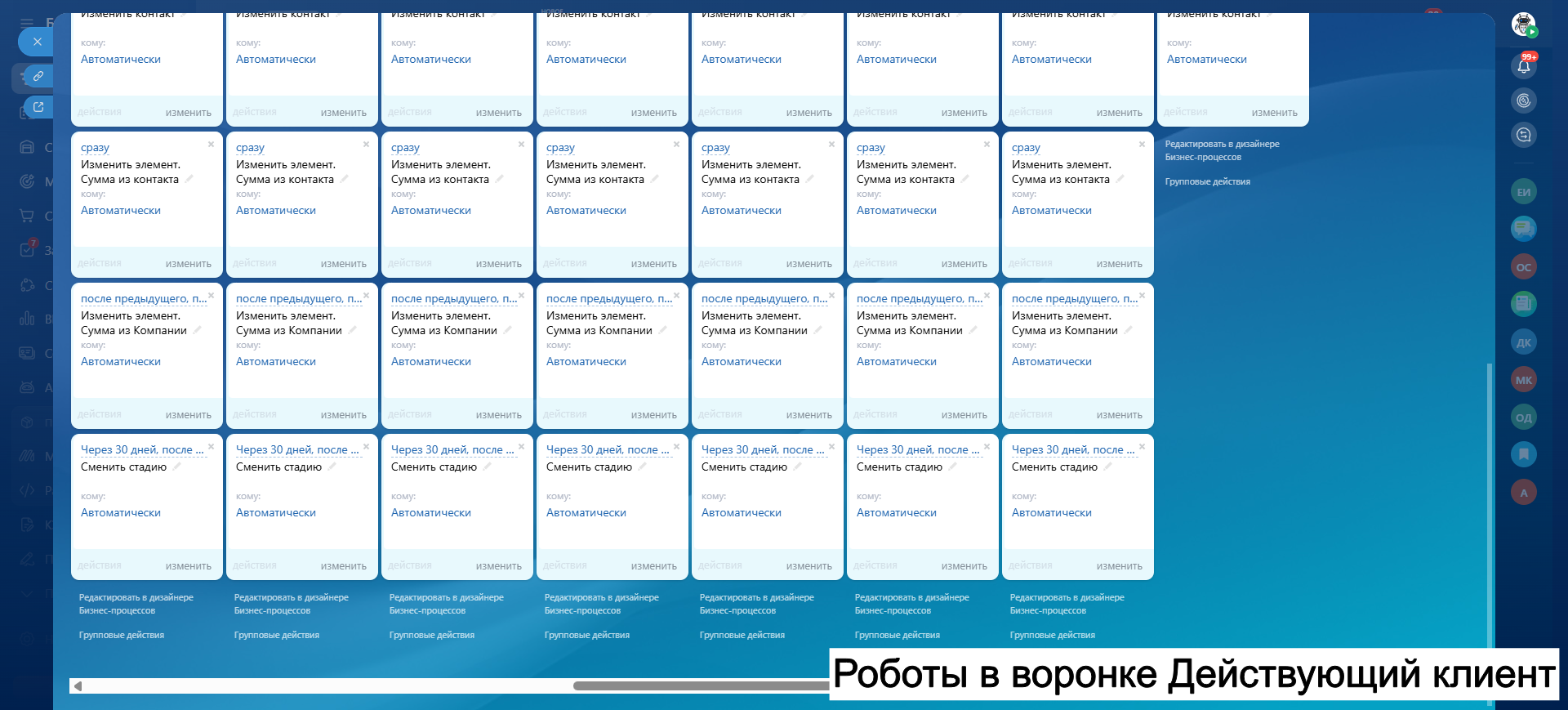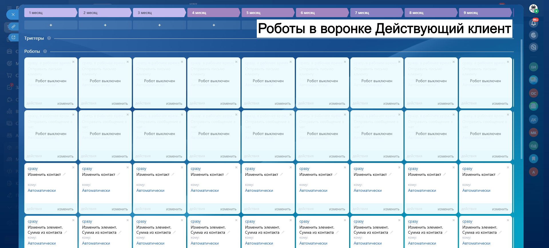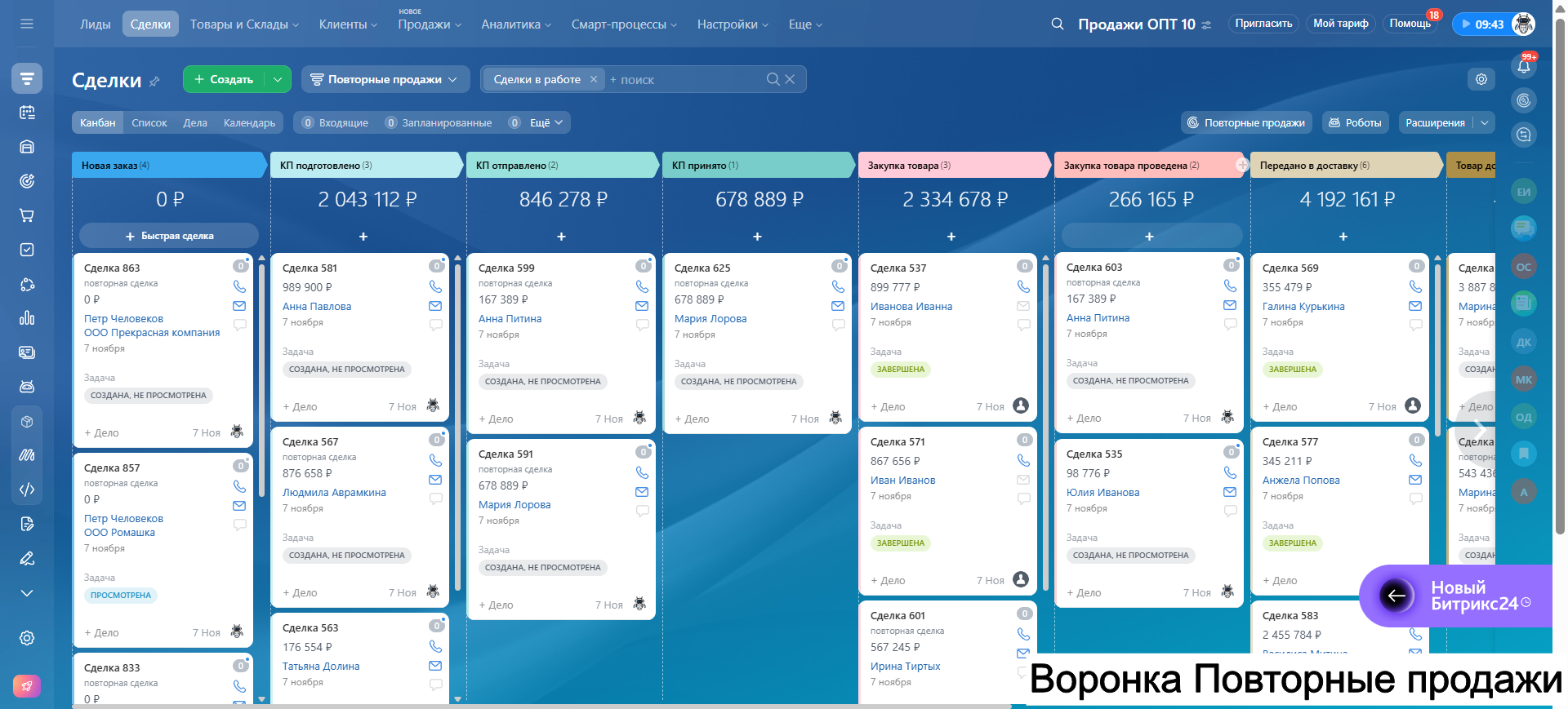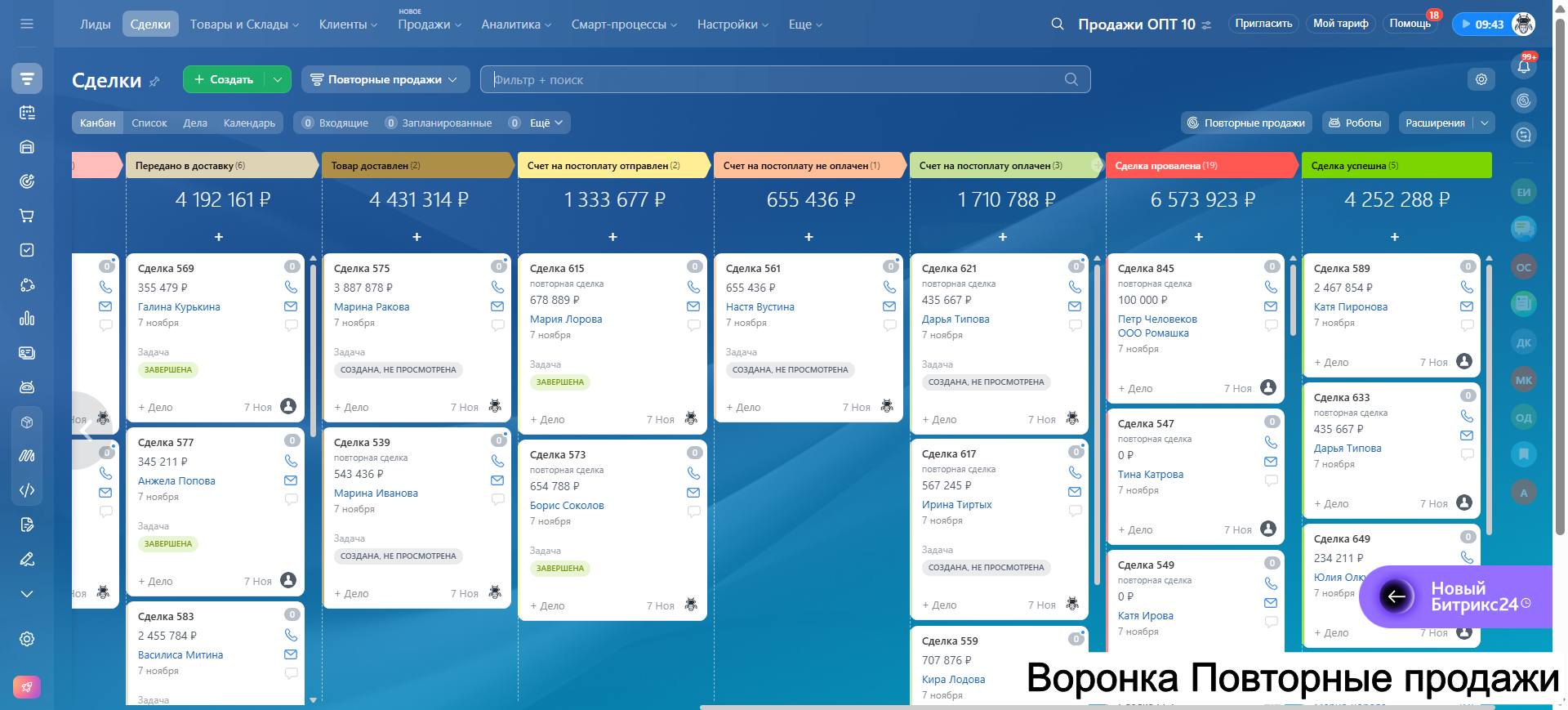 Продажа закрыта → клиент переходит в «Действующие» → повторные заказы фиксируются автоматически.