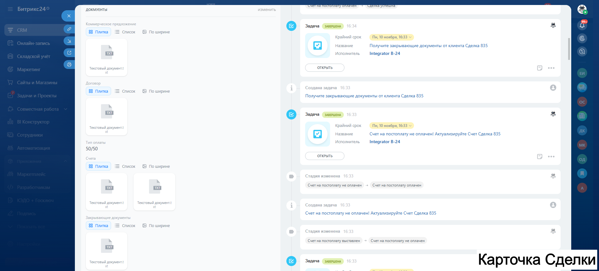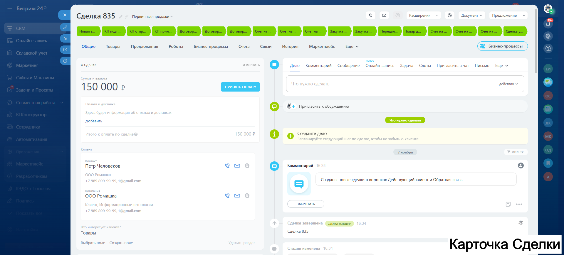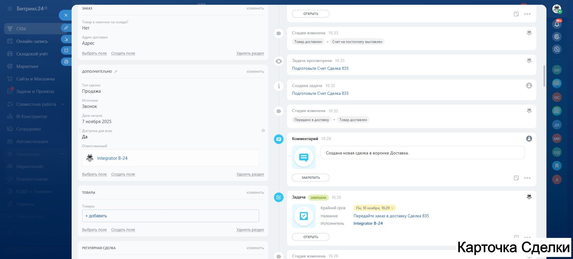 Создаются отдельные сделки по доставке: сборка, упаковка, передача в ТК, отслеживание, контроль недоставки.