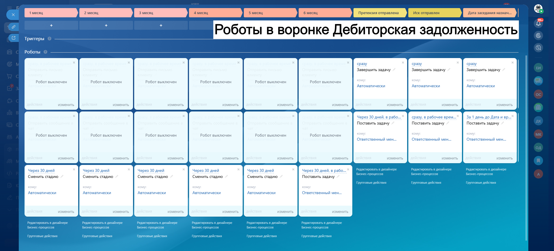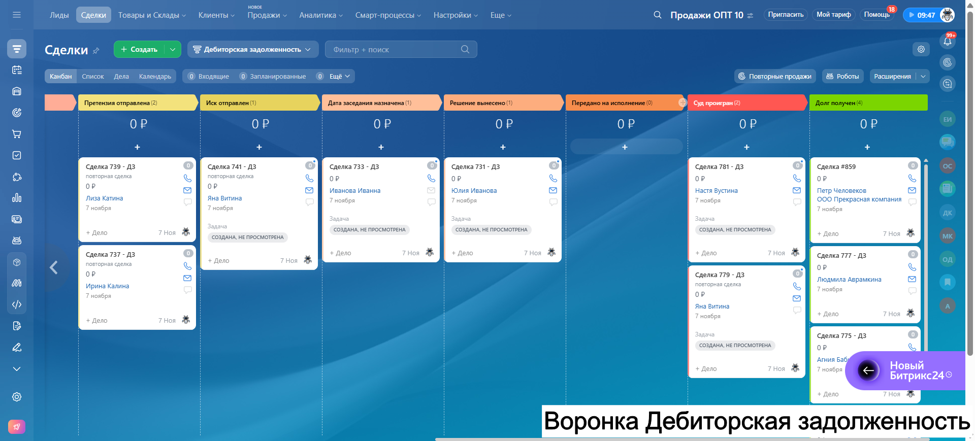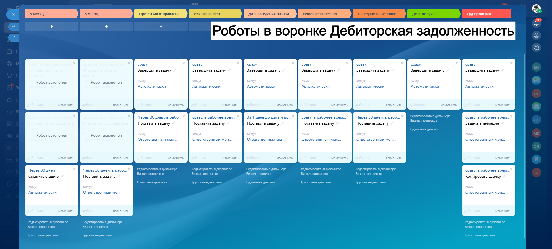 Система напомнит клиенту о долге, создаст задачи на претензию и иск, проведёт по всем стадиям.