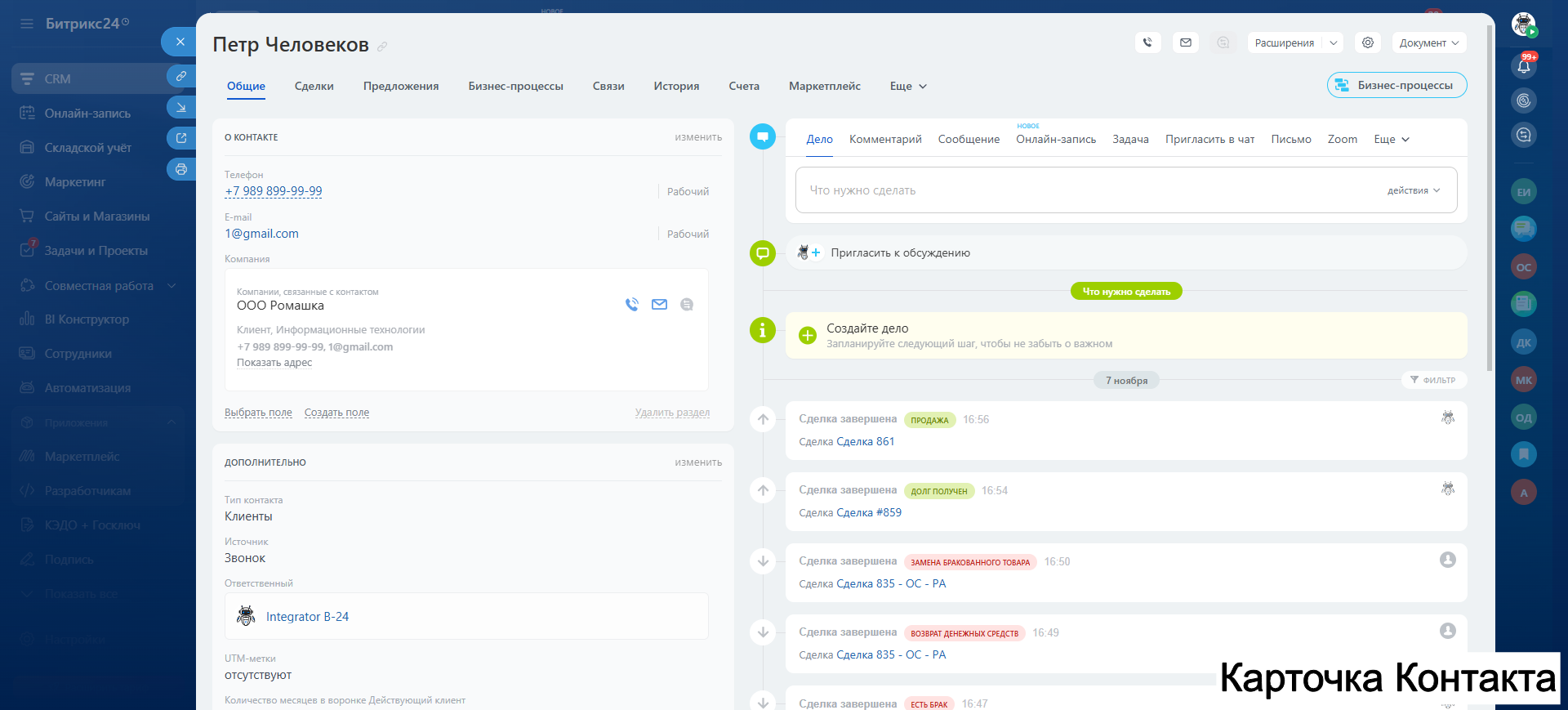 CRM автоматически фиксирует лид из всех каналов и ставит задачу менеджеру.