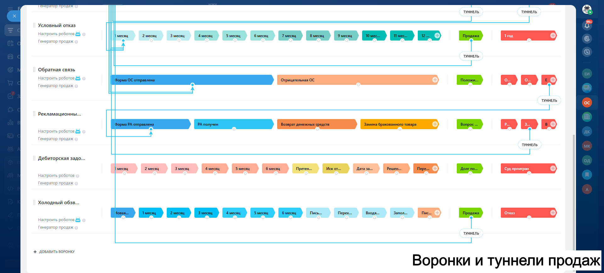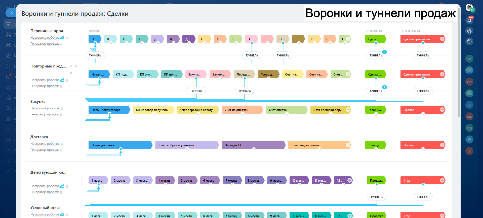 Полный цикл продаж: первичные → повторные → действующие клиенты → отказы