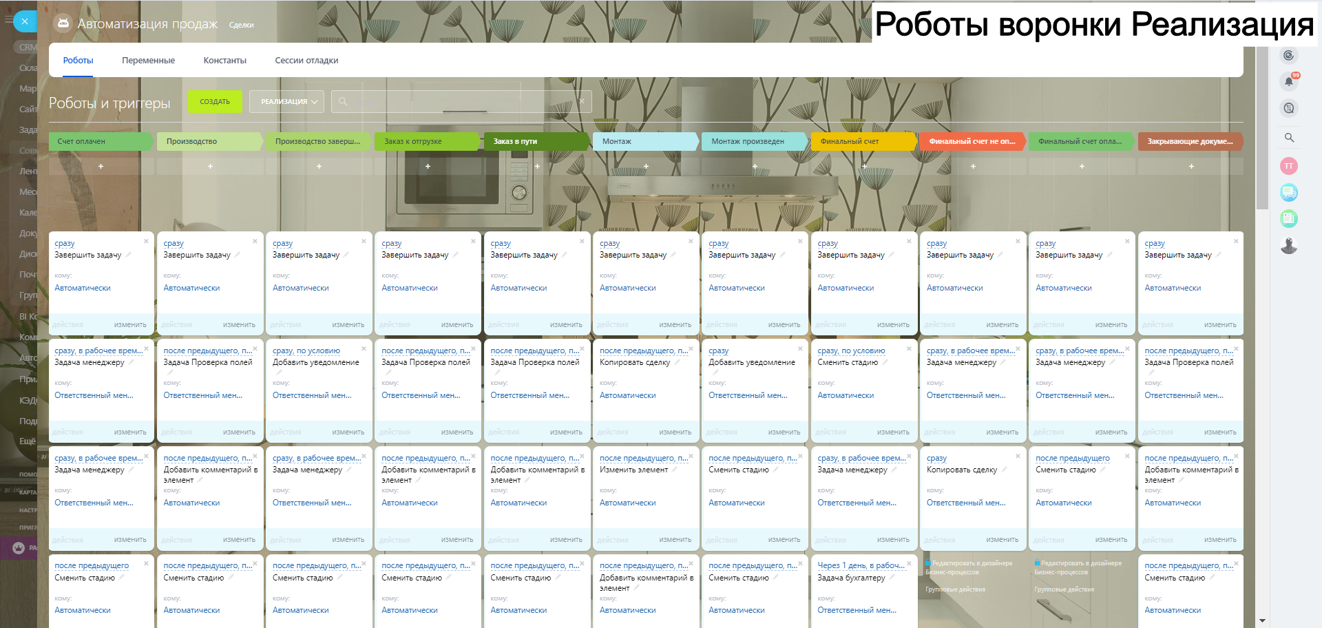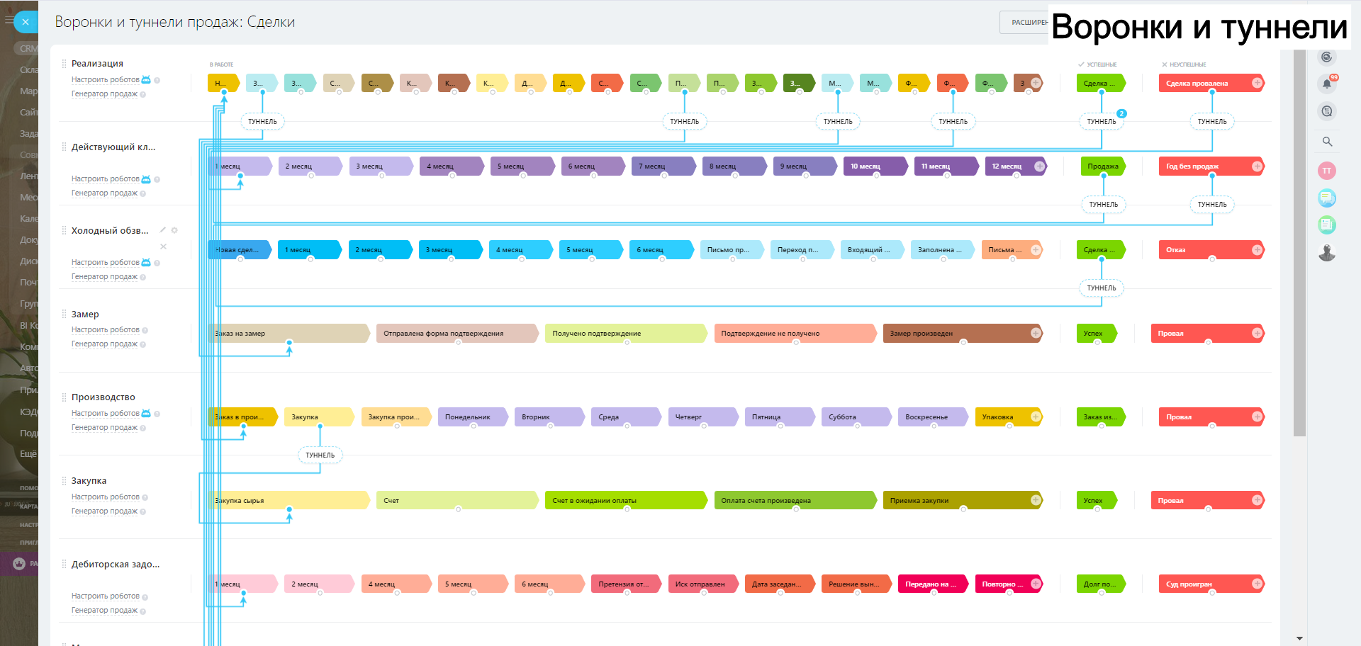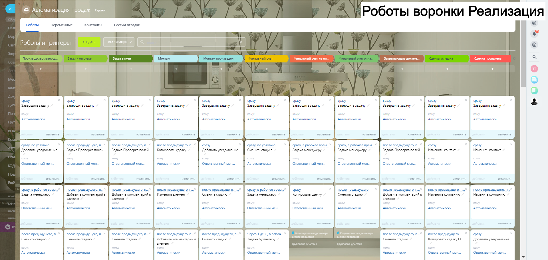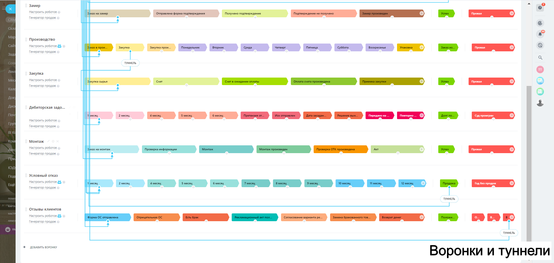 Содержит процессы лидогенерации, продажа товара с производства, производственная воронка, монтаж, процесс закупки, процесс замера