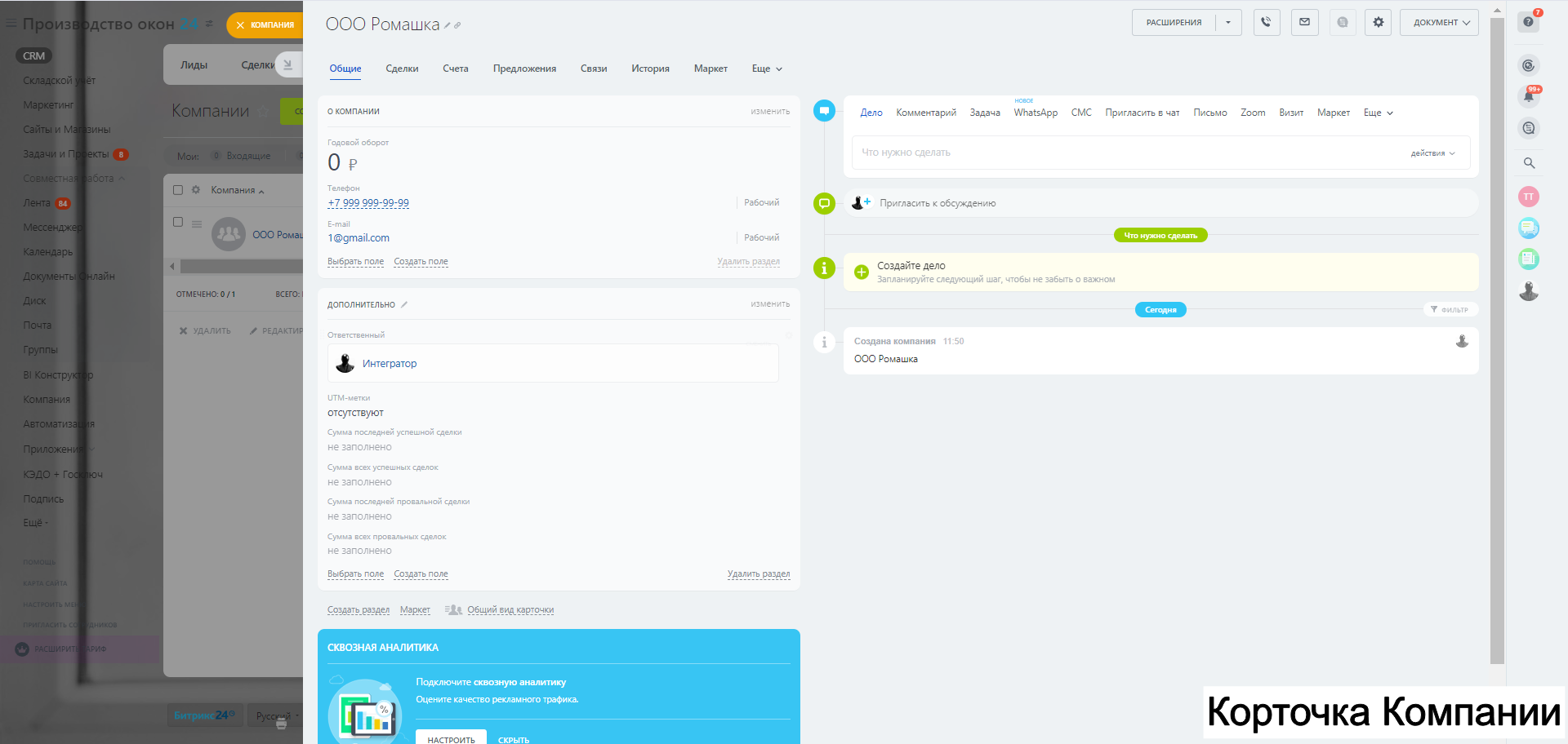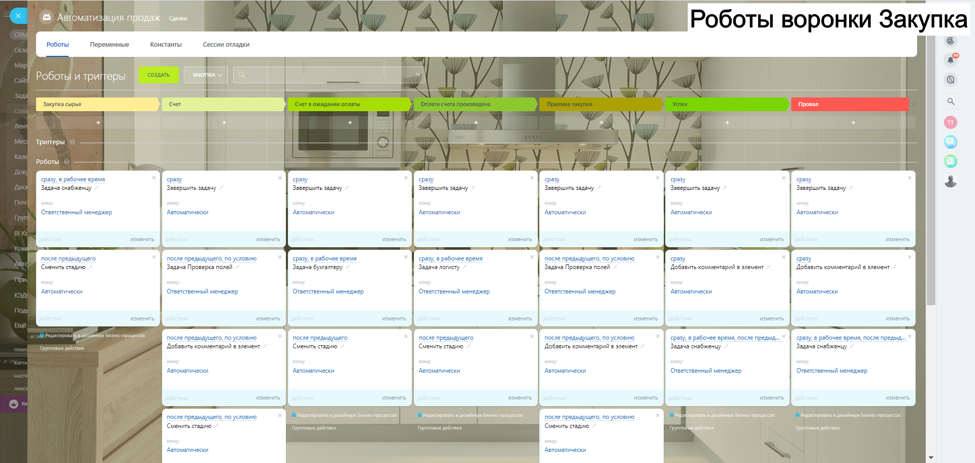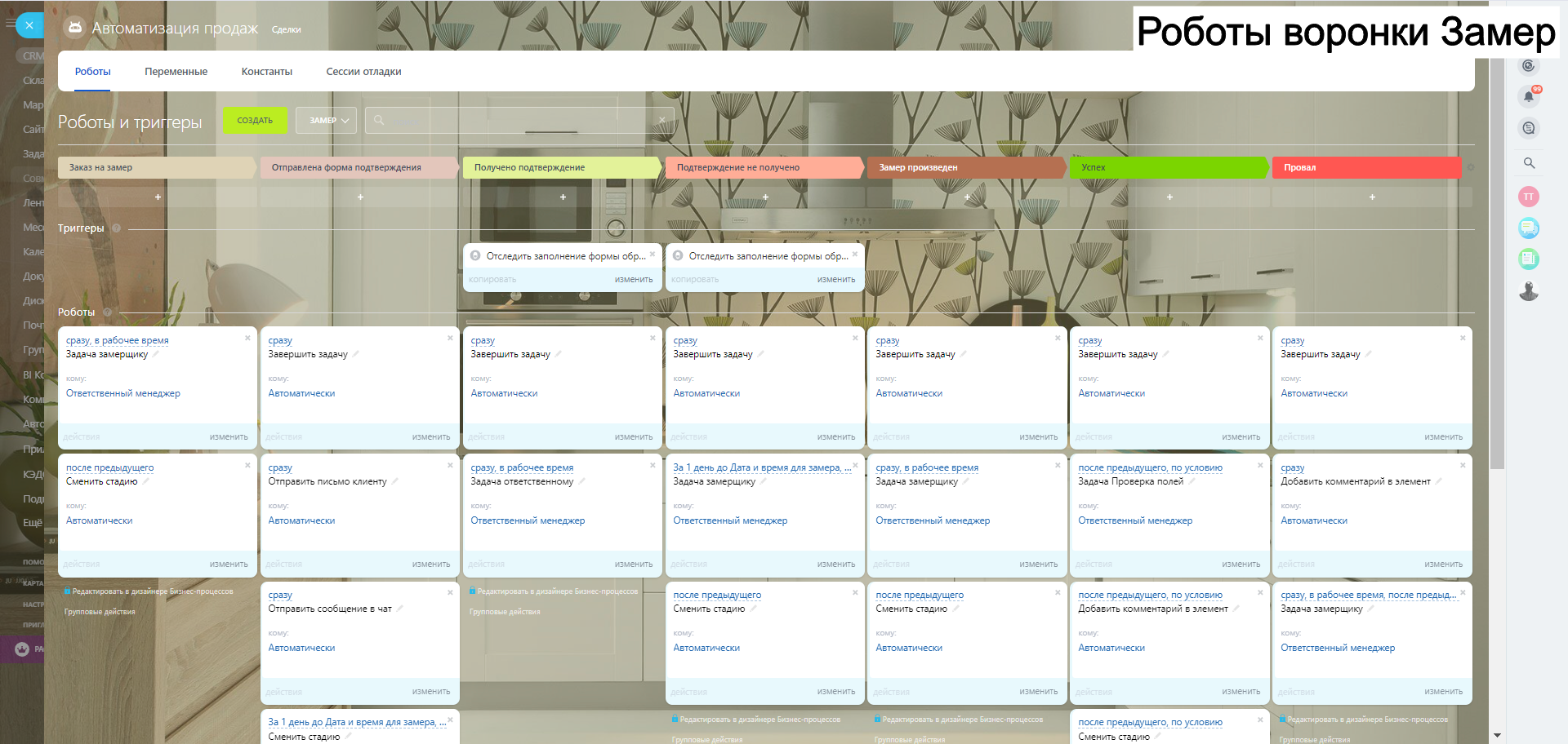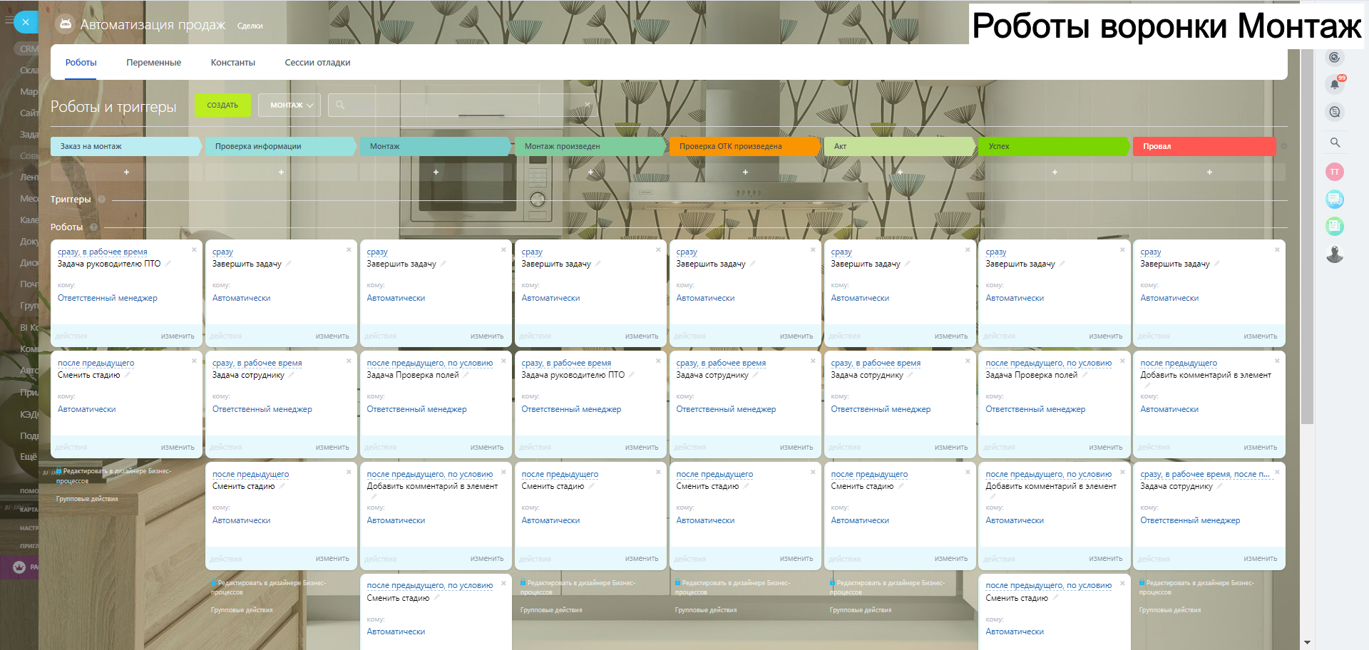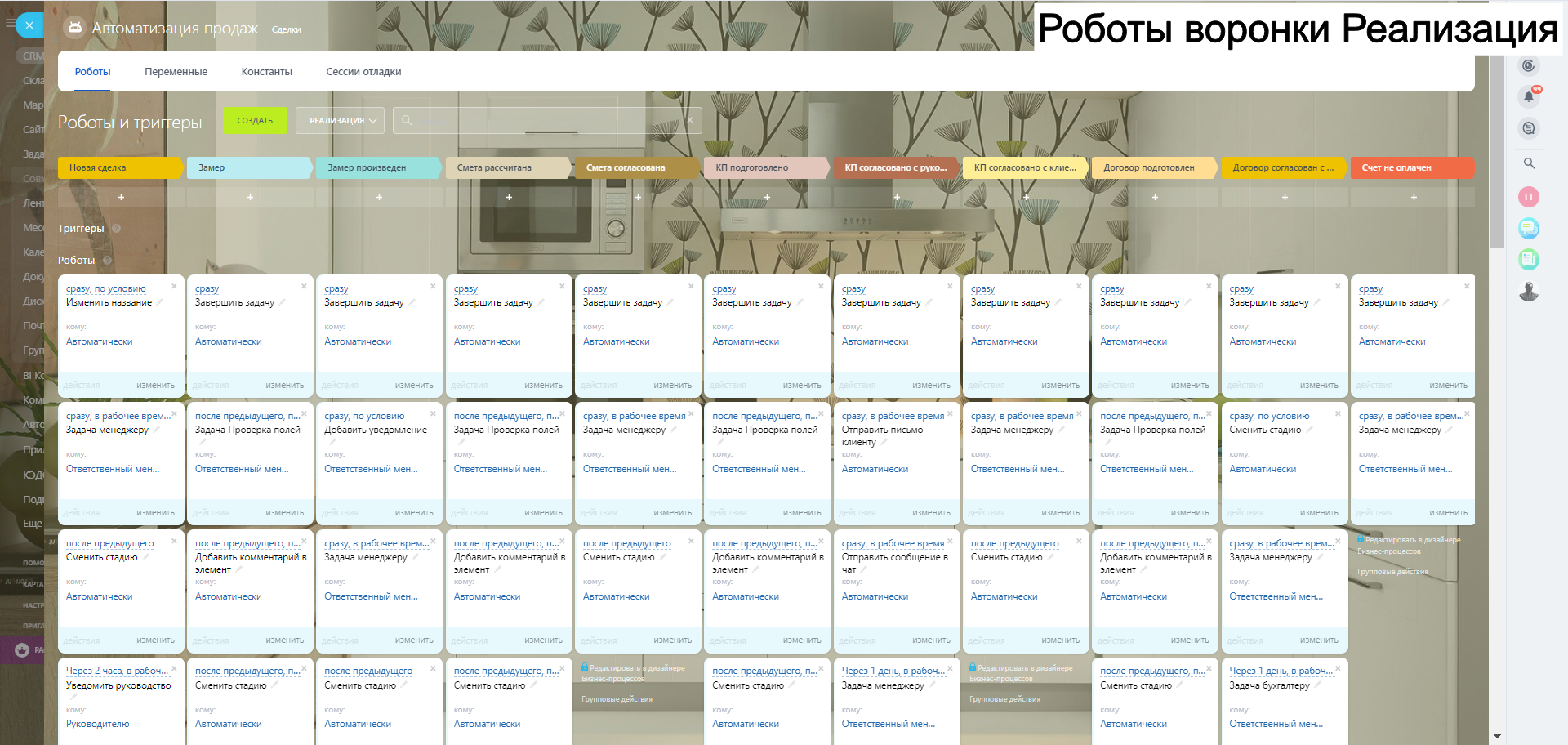 Содержит процессы лидогенерации, продажа товара с производства, производственная воронка, монтаж, процесс закупки, процесс замера