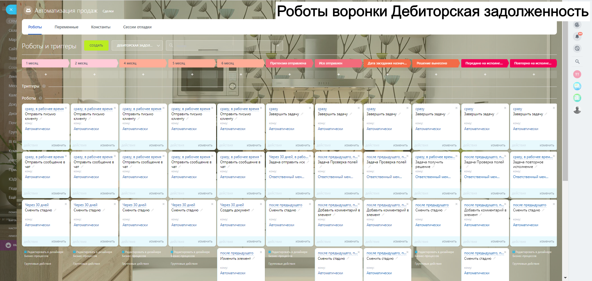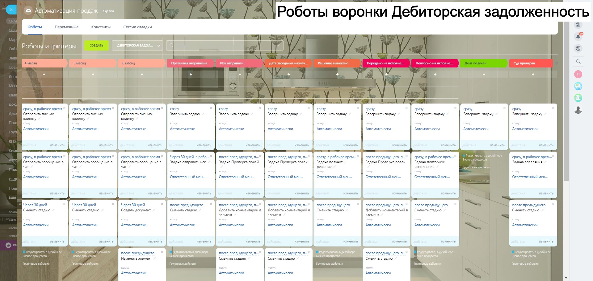 10. Автоворонку Дебиторская задолженность - для работы с клиентами по отсрочке и взысканий задолженности как финансовой так и закрывающих документов
