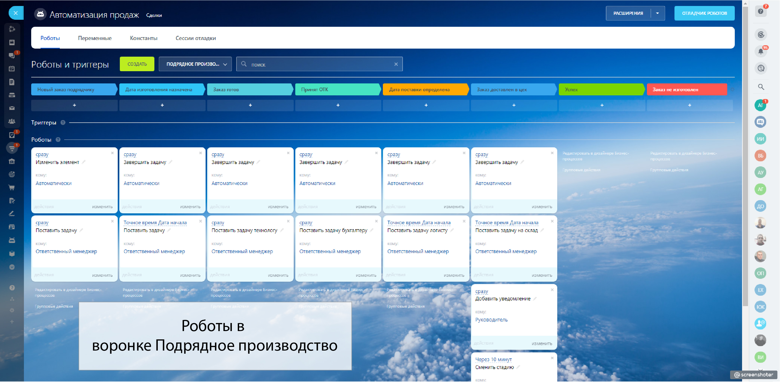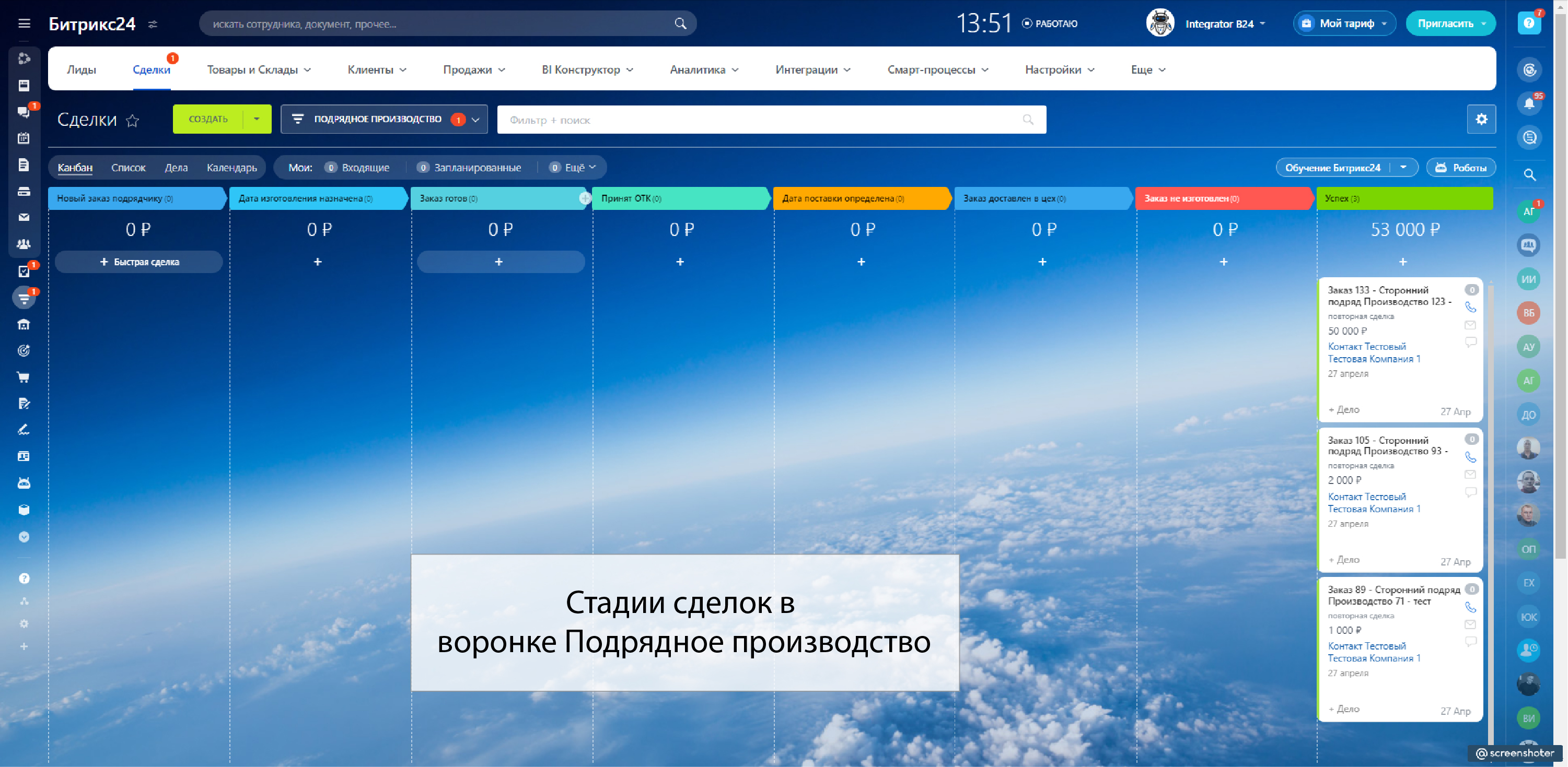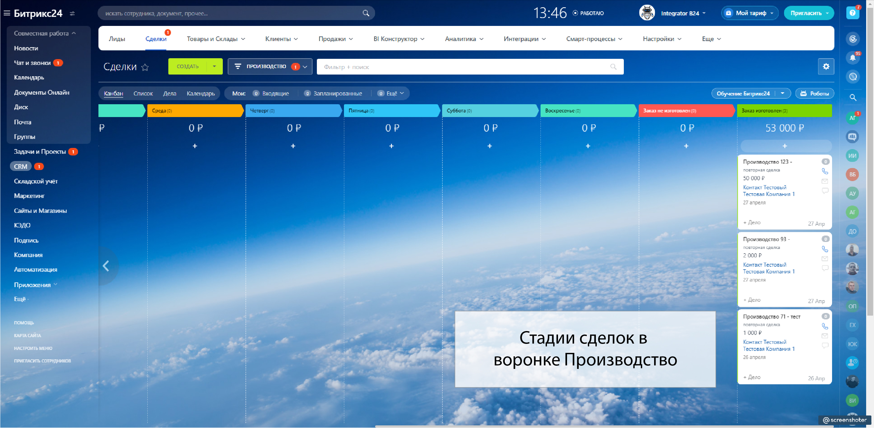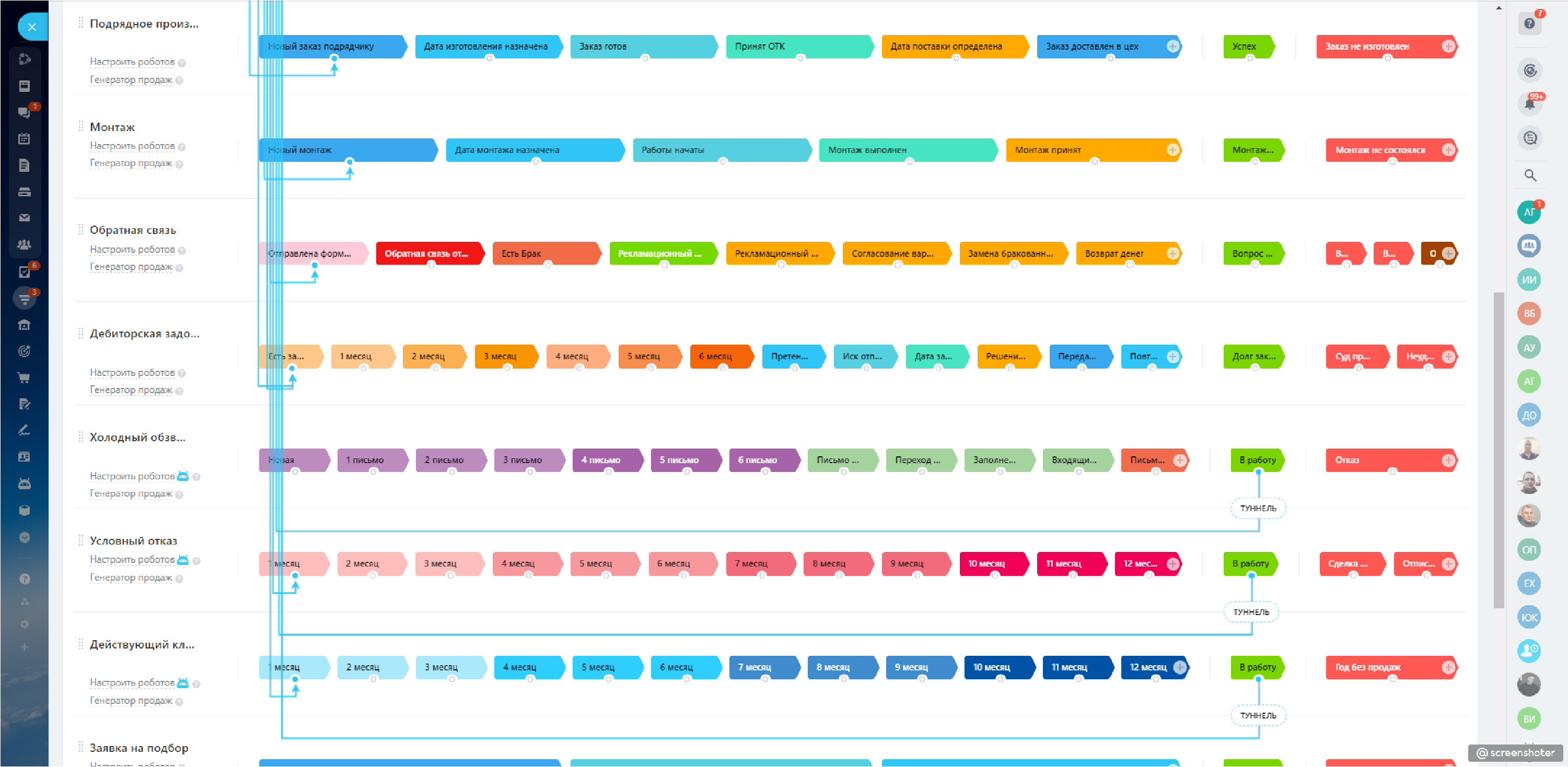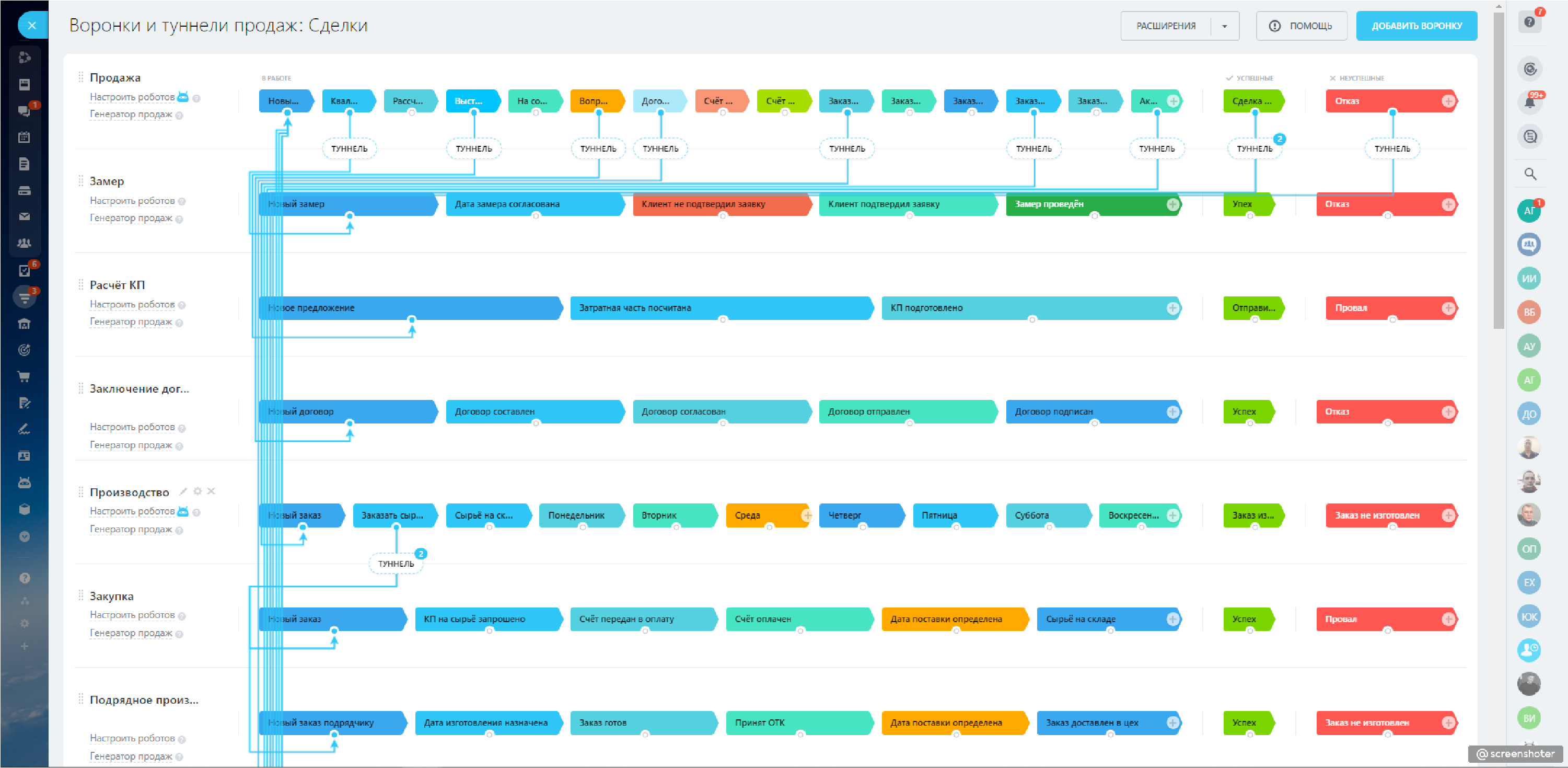 Готовая CRM для производственной компании отлаженное на множестве производств, содержащая процессы лидогенерации, продаж, продаж через замер, производственная воронка, монтаж, расчет и согласование коммерческого предложения, создание и согласование договора, воронка для подрядного производства, воронка для процесса закупки, воронка для получения обратной связи и рекламации, HR воронка.