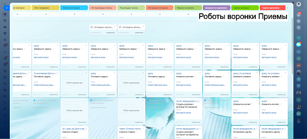 Готовая CRM-система для клиник эстетической медицины, косметологических кабинетов и медицинских центров. Она включает 5 воронок, охватывающих весь цикл работы с пациентом: от первого обращения до повторных визитов и обратной связи.