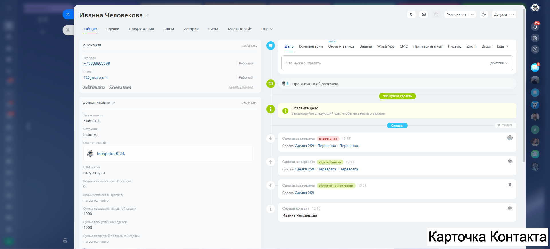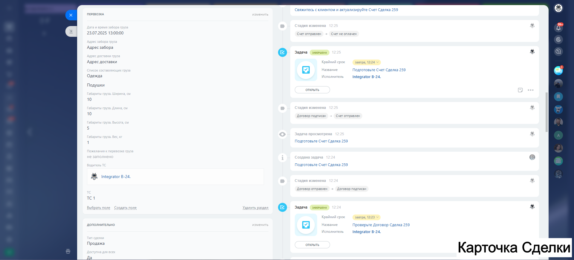 Все заявки попадают в CRM автоматически, либо создаются вручную. Вы сразу видите имя клиента, контакты, что его интересует, а также адреса забора и доставки груза.
