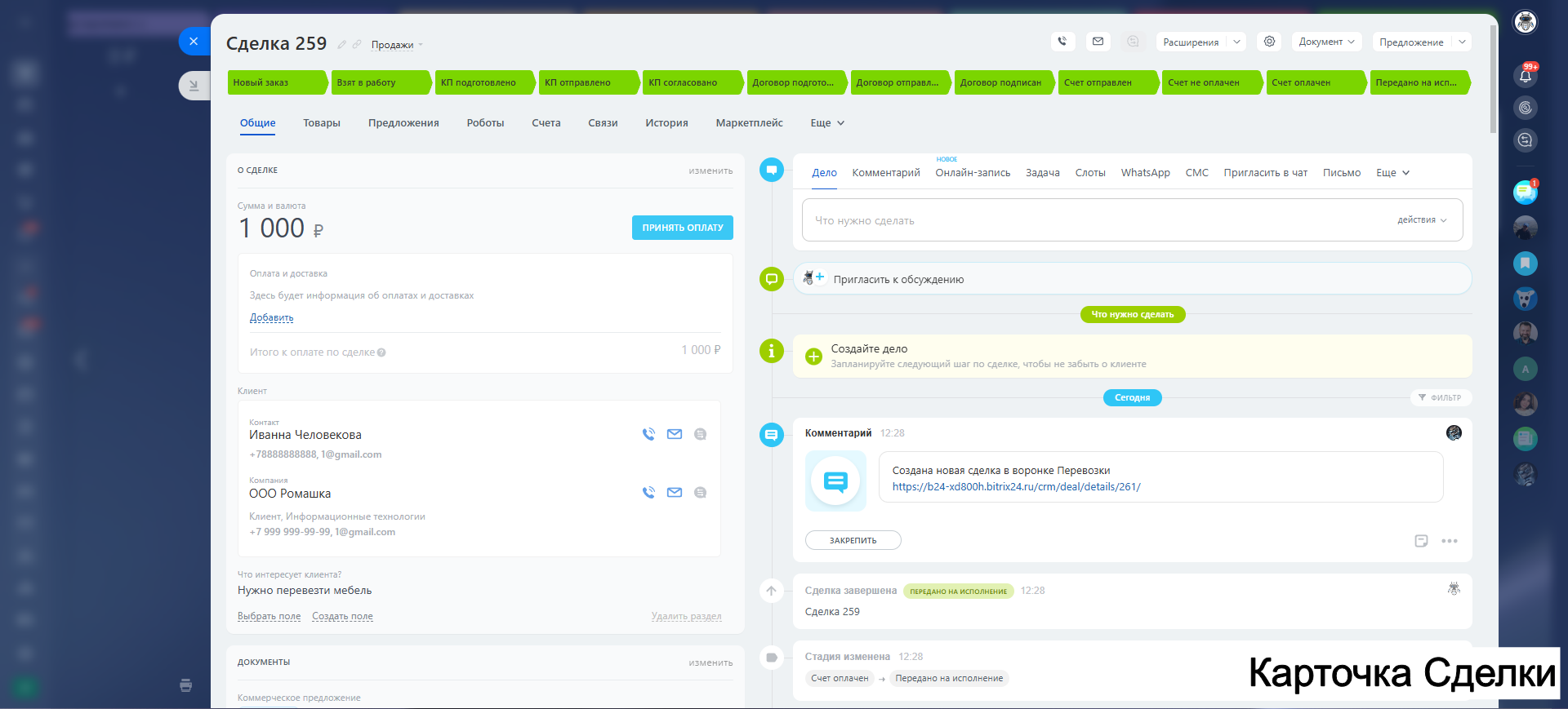 На этапе «Взят в работу» менеджер формирует КП, добавляет услуги и цены. Руководитель проверяет и отправляет предложение клиенту. Всё — прямо из карточки сделки.