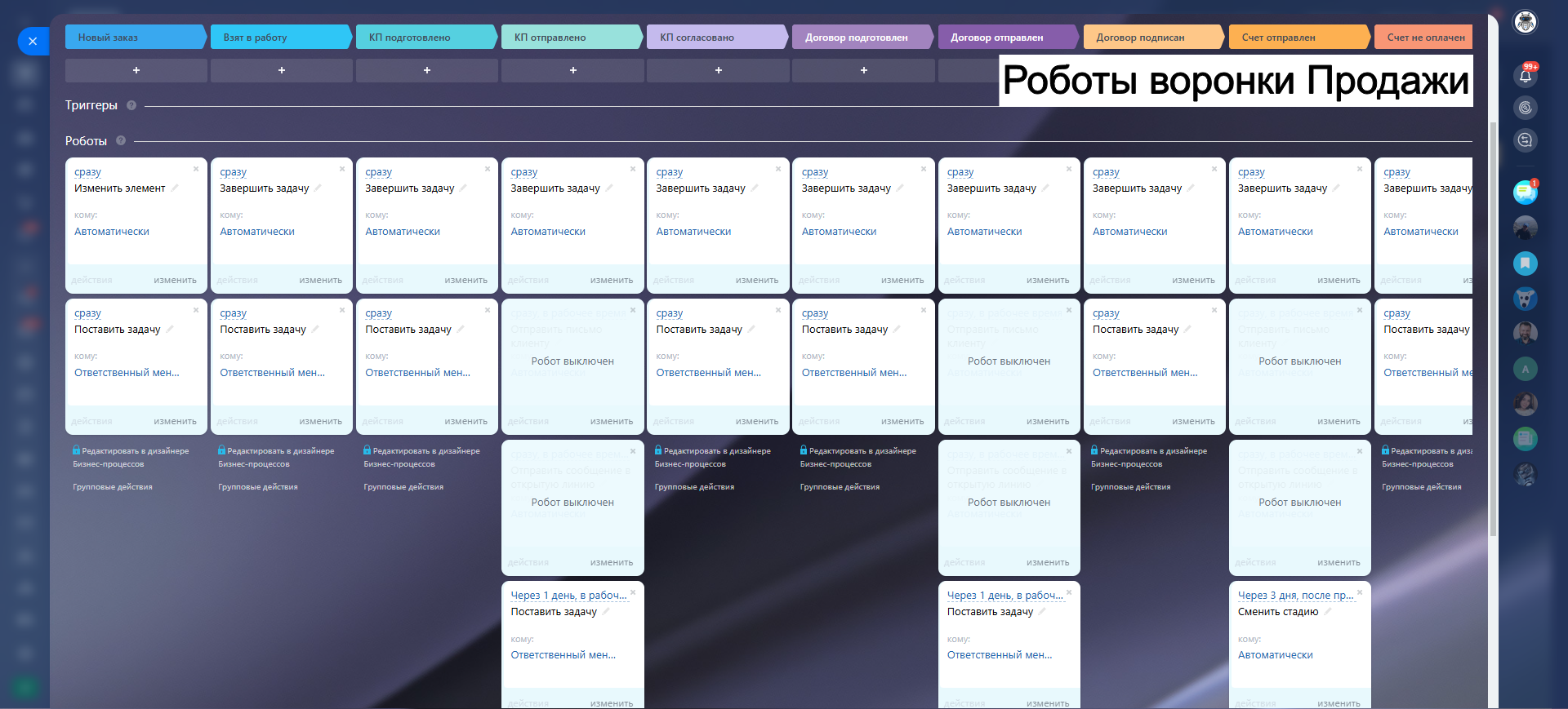 Согласованные КП превращаются в договоры и счета. Если клиент не оплачивает счёт в течение 3 дней, CRM напомнит менеджеру, чтобы он уточнил статус оплаты.