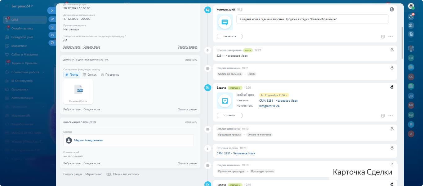 5. Процедура и оплата — формируются чек, акт, запись переходит в “успех”.