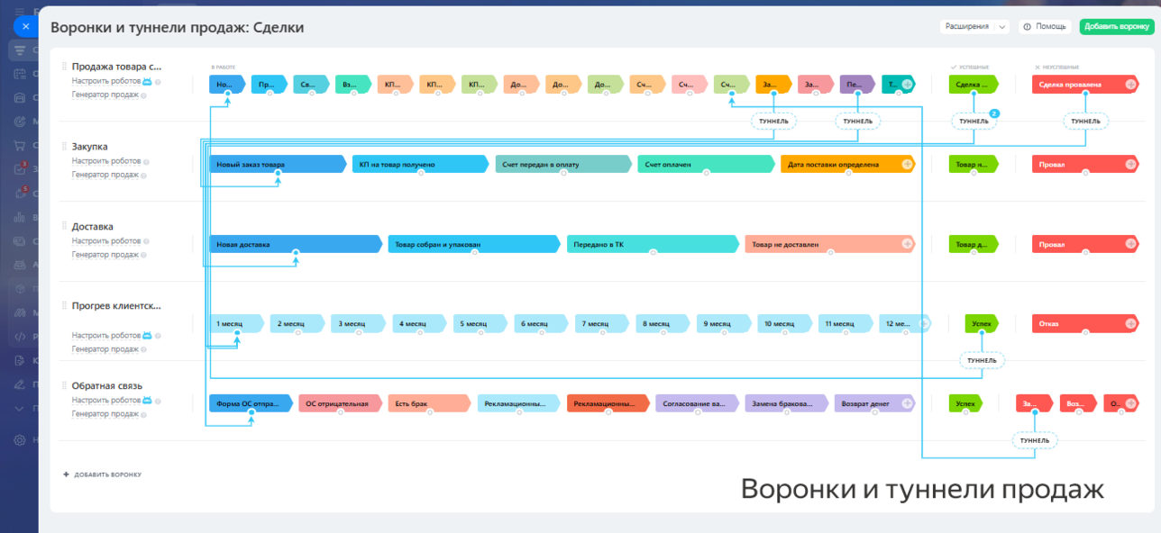 Готовое решение: 5 автоматизированных воронок продаж, закупок, доставки и обратной связи. Всё, что нужно для стабильной и прозрачной работы бизнеса — в одном понятном инструменте.