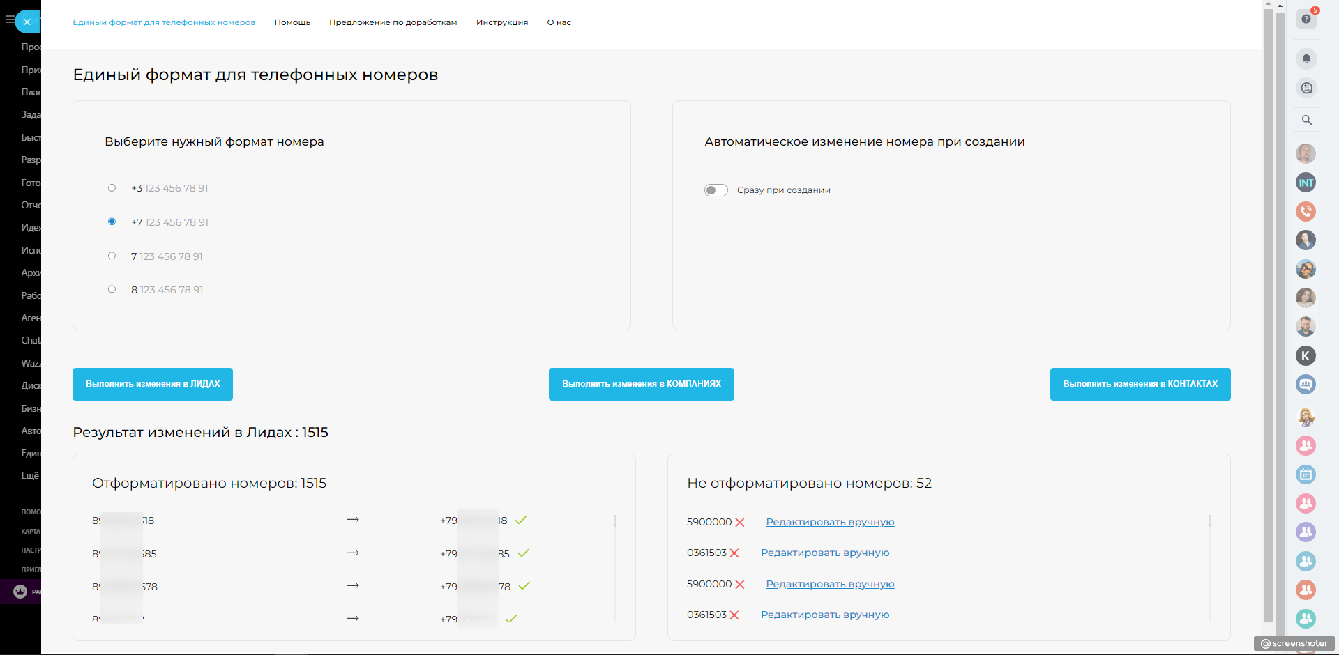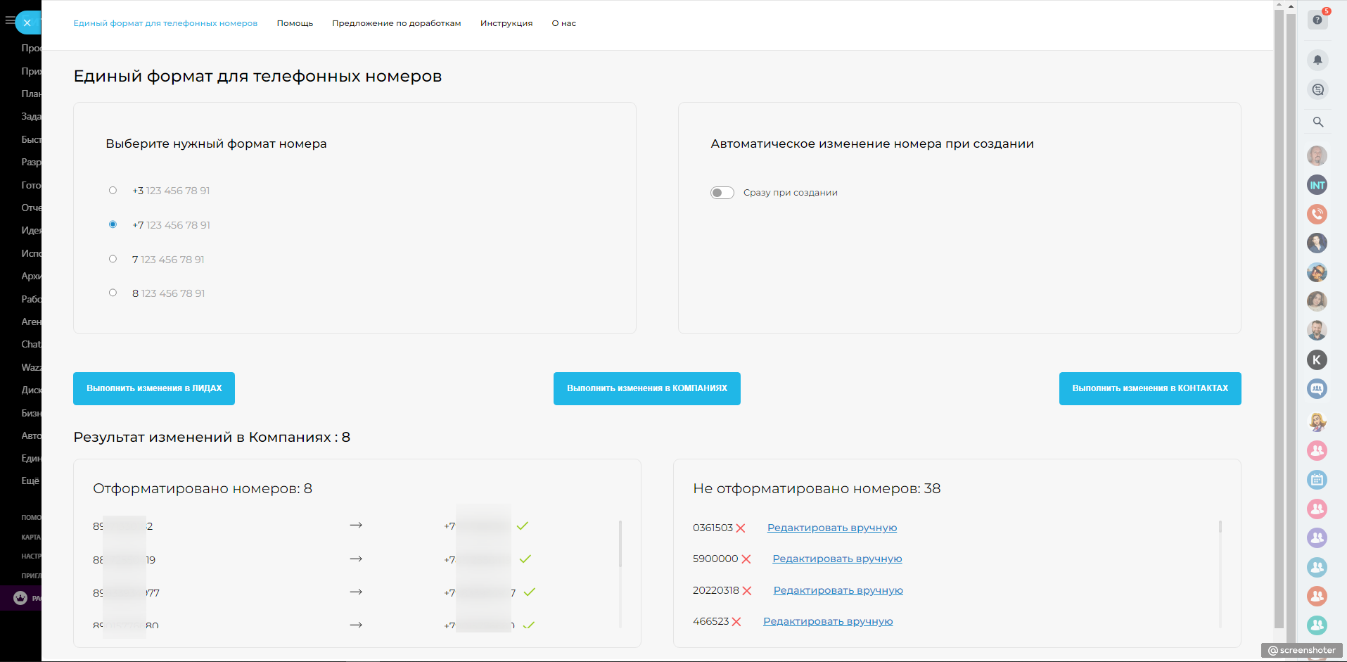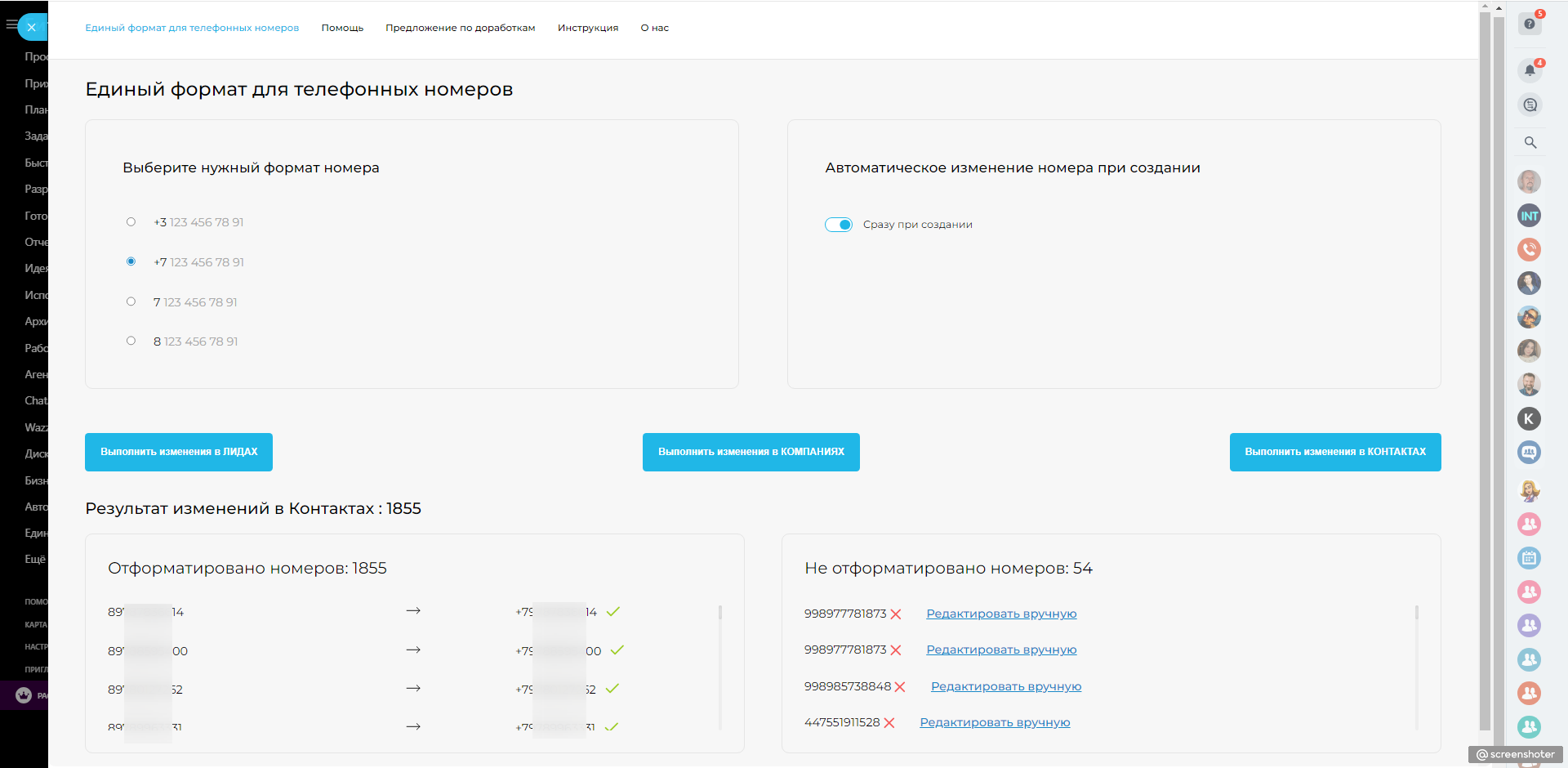 Единый формат номеров телефонов - приложение для ручного и автоматического поиска и изменения номеров телефонов, которое приводит все номера телефонов в Лидах, Контактах и Компаниях к одному виду: +7 … и +3..., и наводит порядок в телефонных номерах в клиентской базе.
