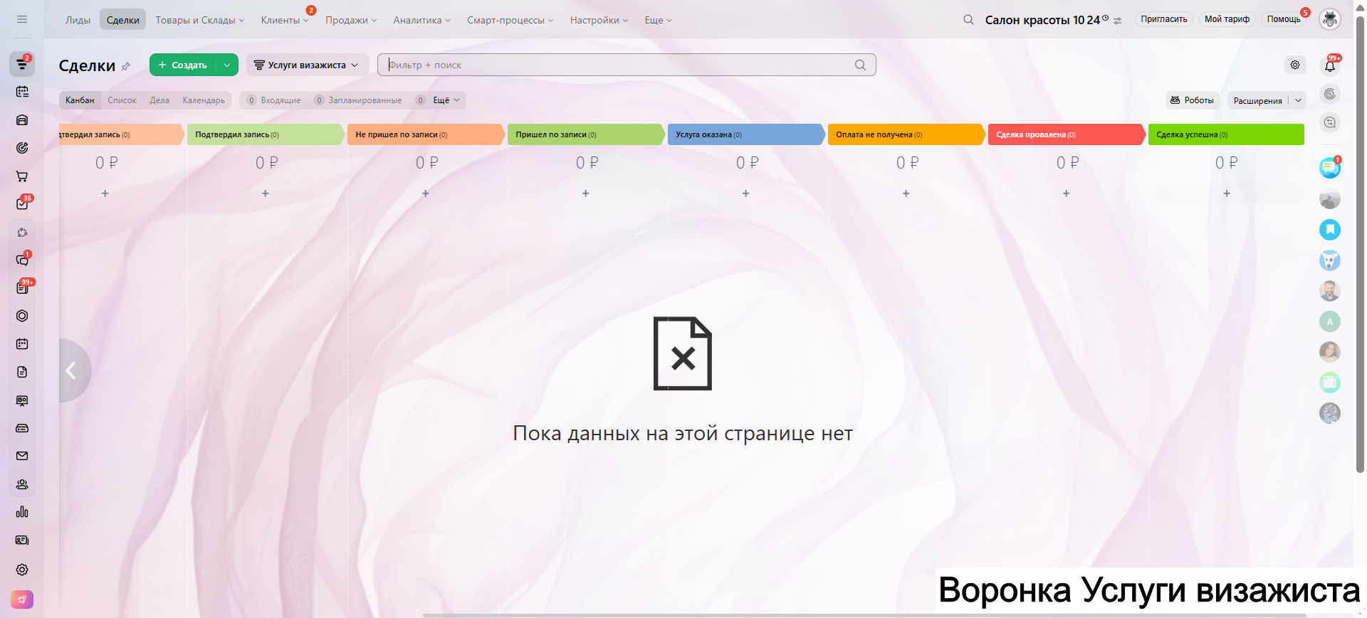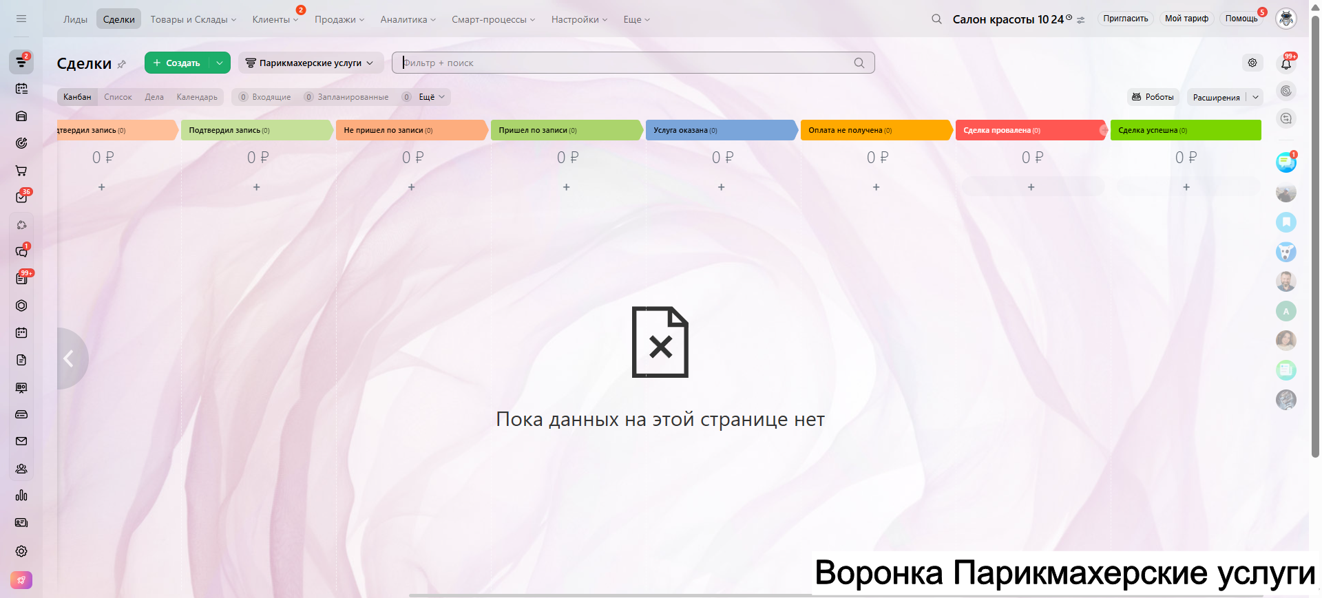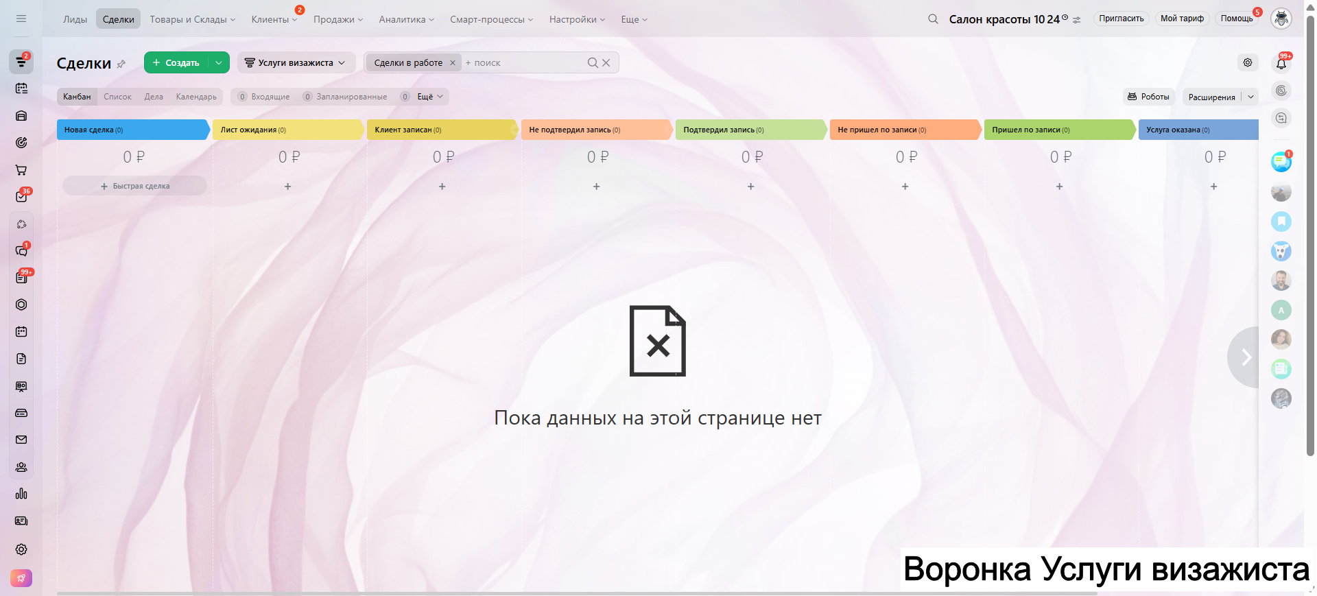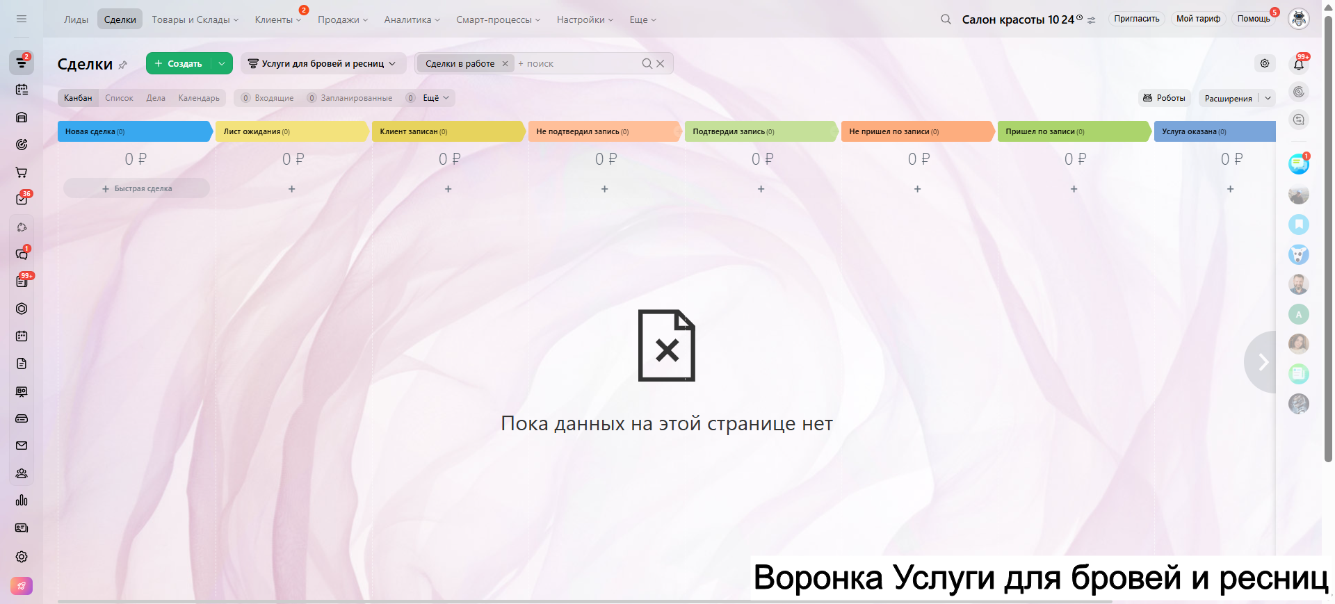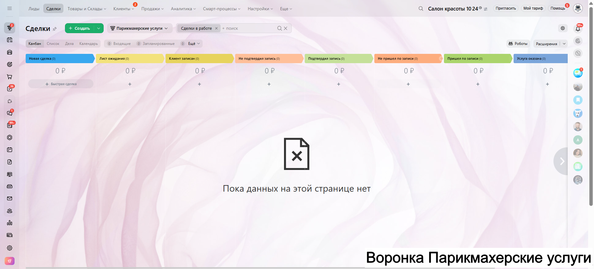 Видео инструкция по работе с готовой CRM для салона красоты в RuTube: https://rutube.ru/video/a06b4ef58924b4aa085482bf07d6df21/
