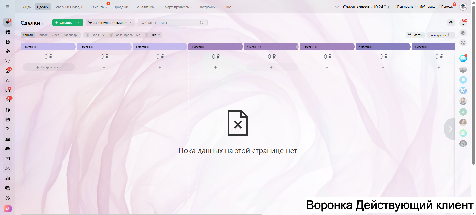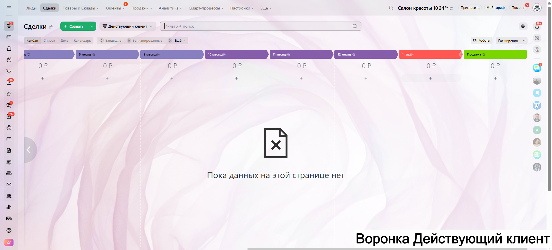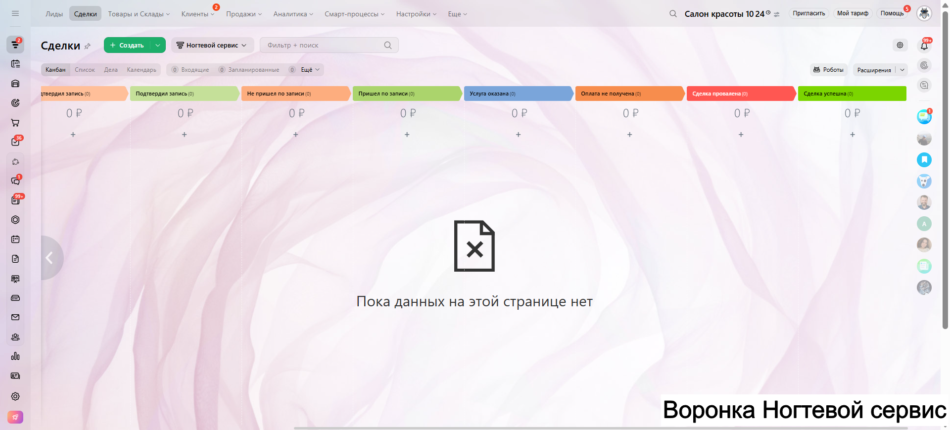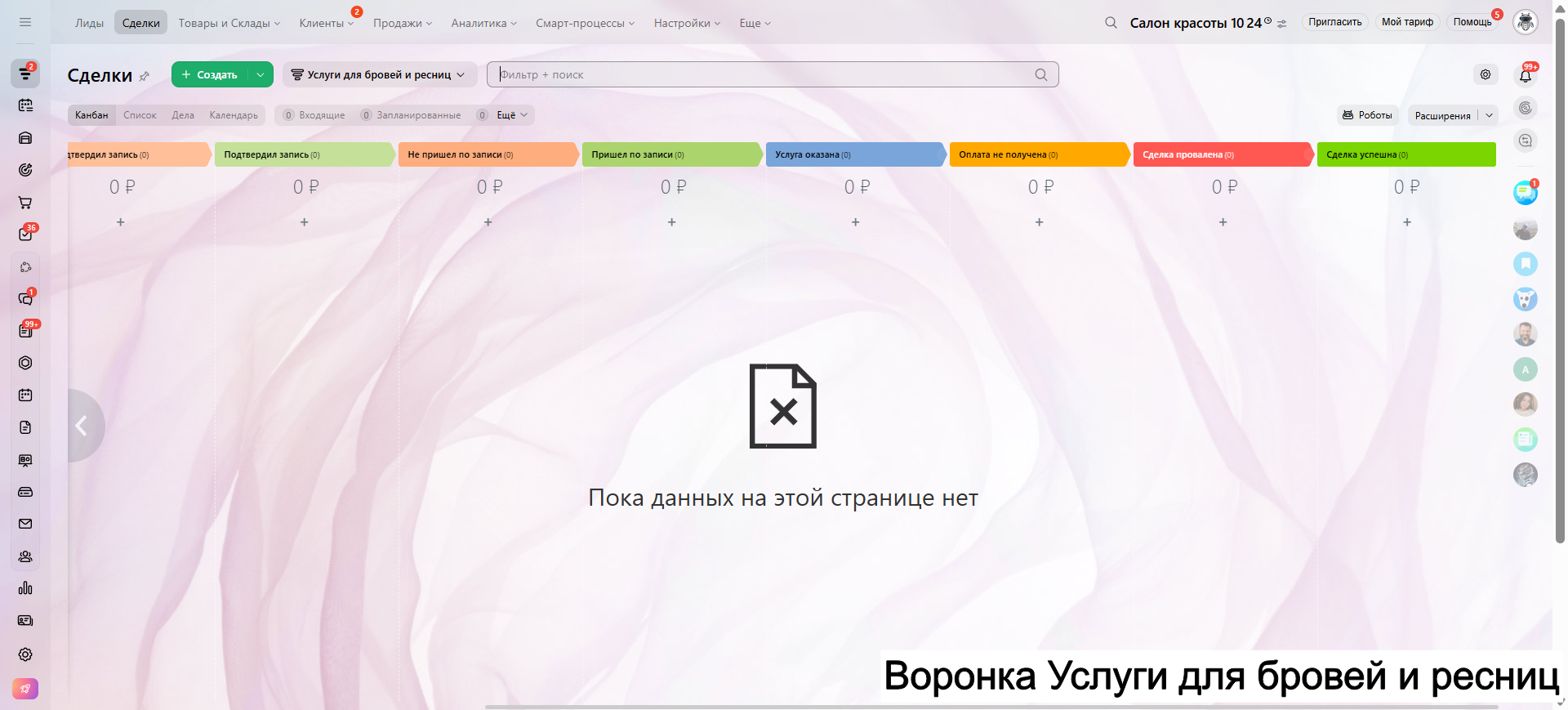 Видео инструкция по работе с готовой CRM для салона красоты в RuTube: https://rutube.ru/video/a06b4ef58924b4aa085482bf07d6df21/