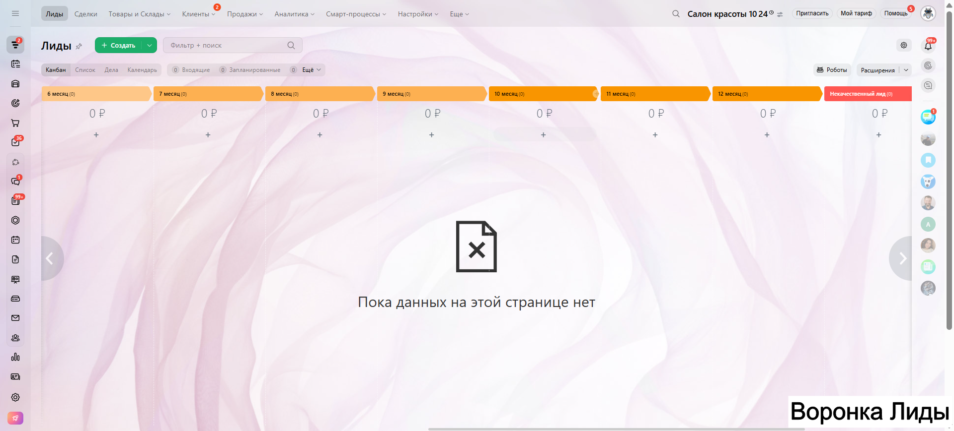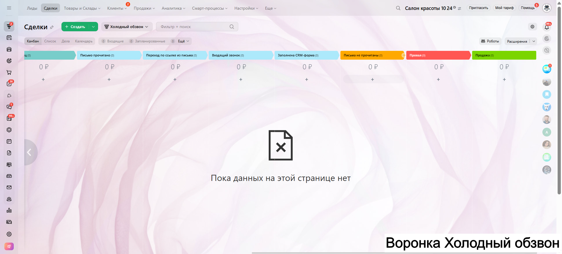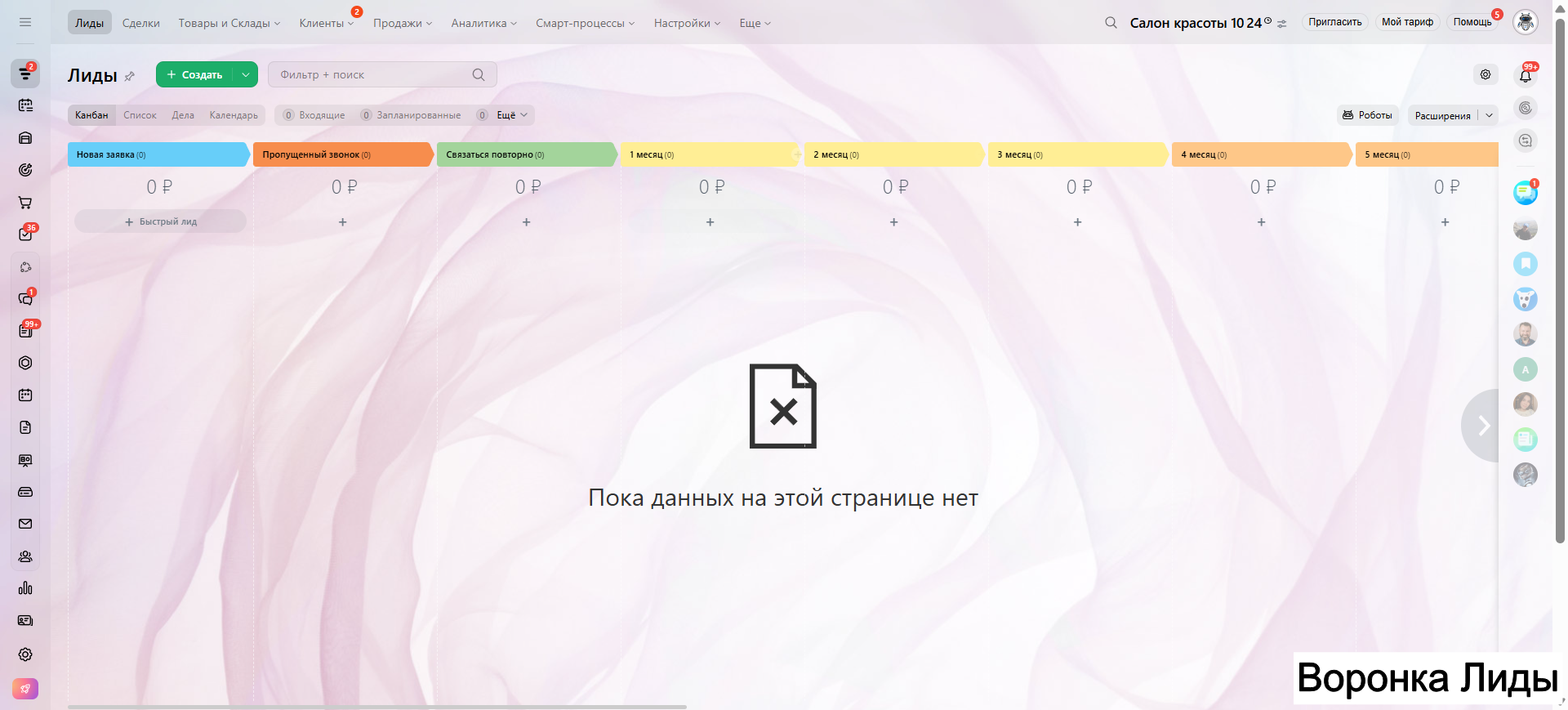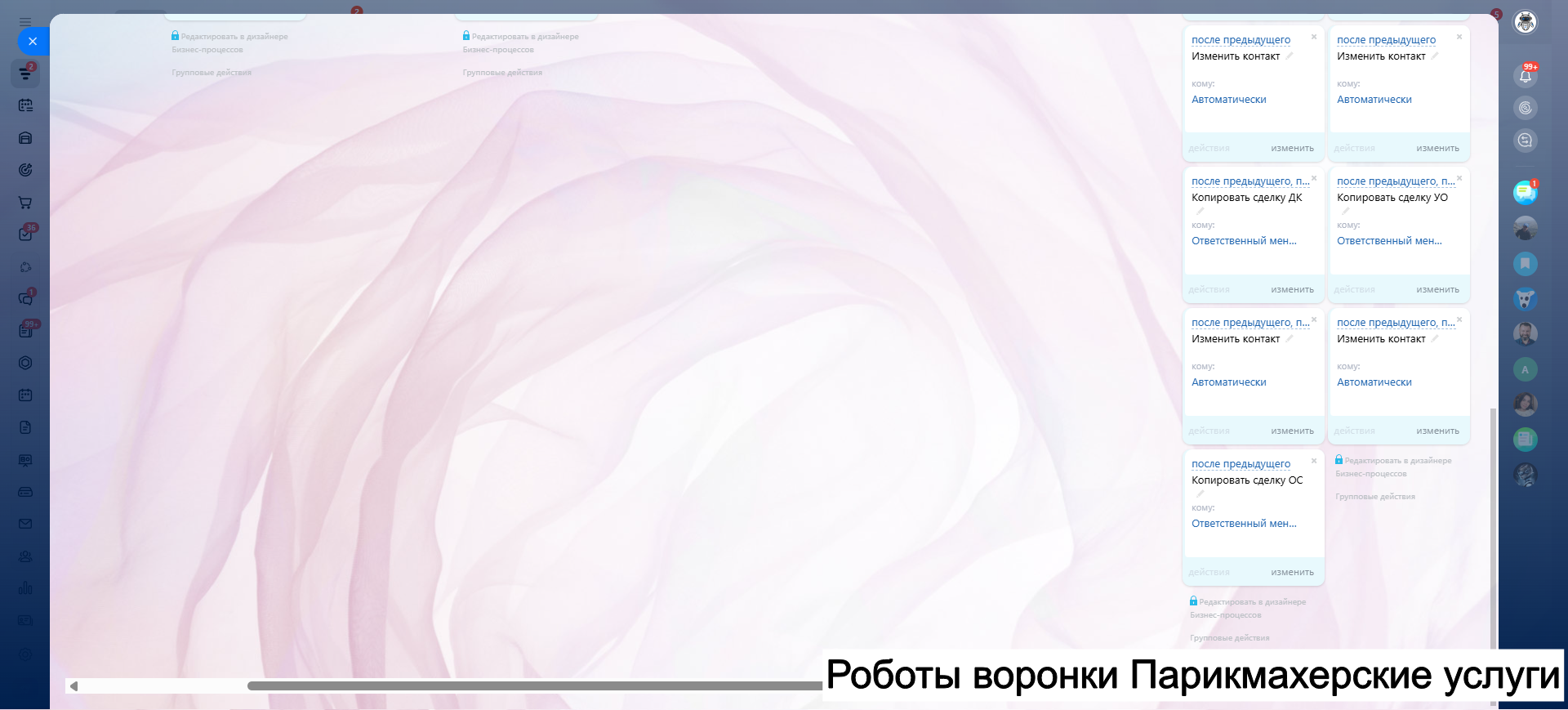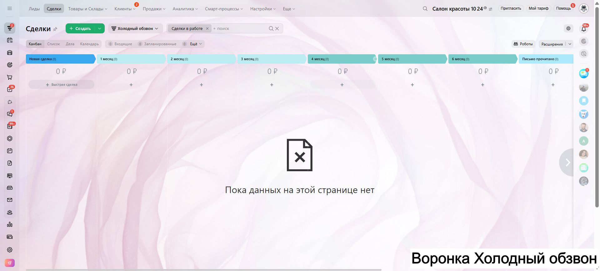 Видео инструкция по работе с готовой CRM для салона красоты в RuTube: https://rutube.ru/video/a06b4ef58924b4aa085482bf07d6df21/