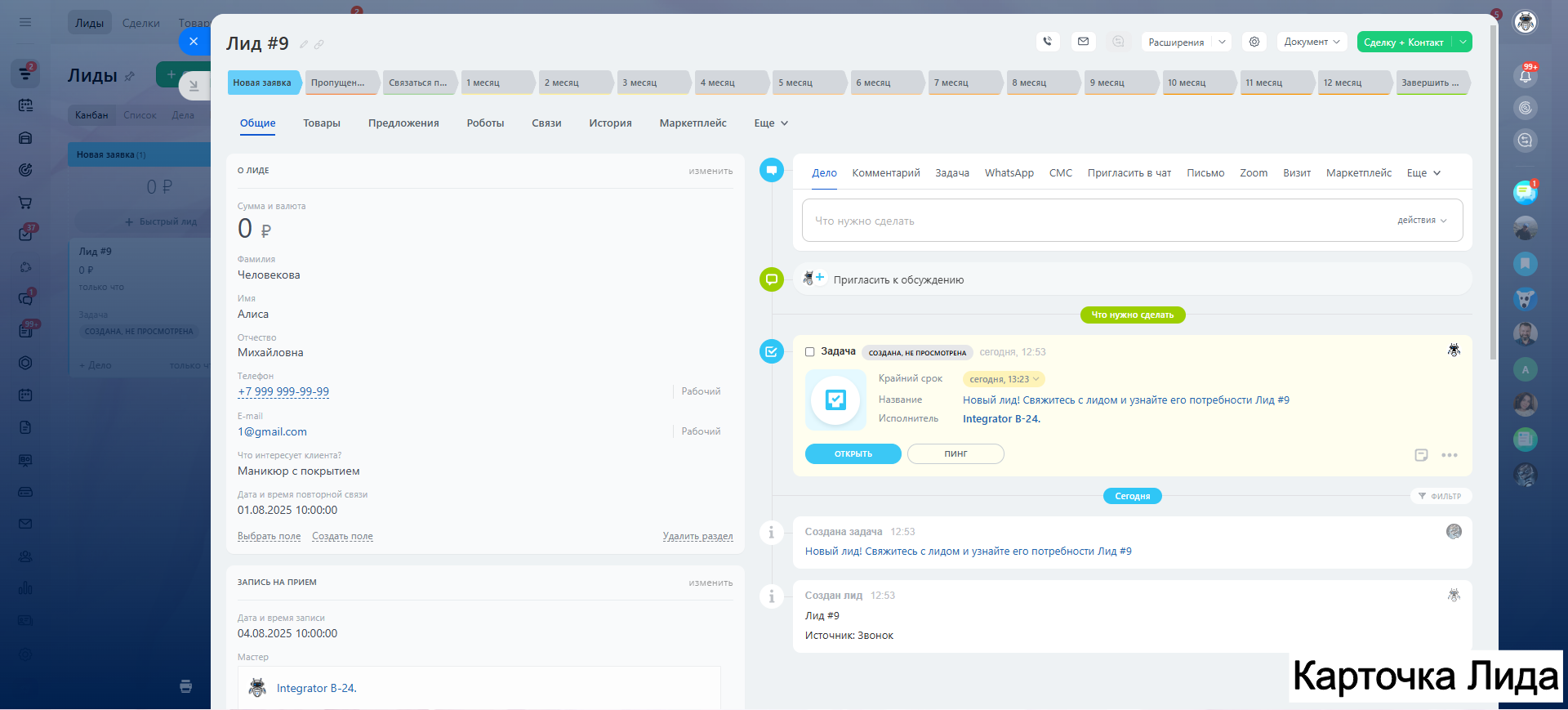 - Клиент обращается — CRM создаёт лид
