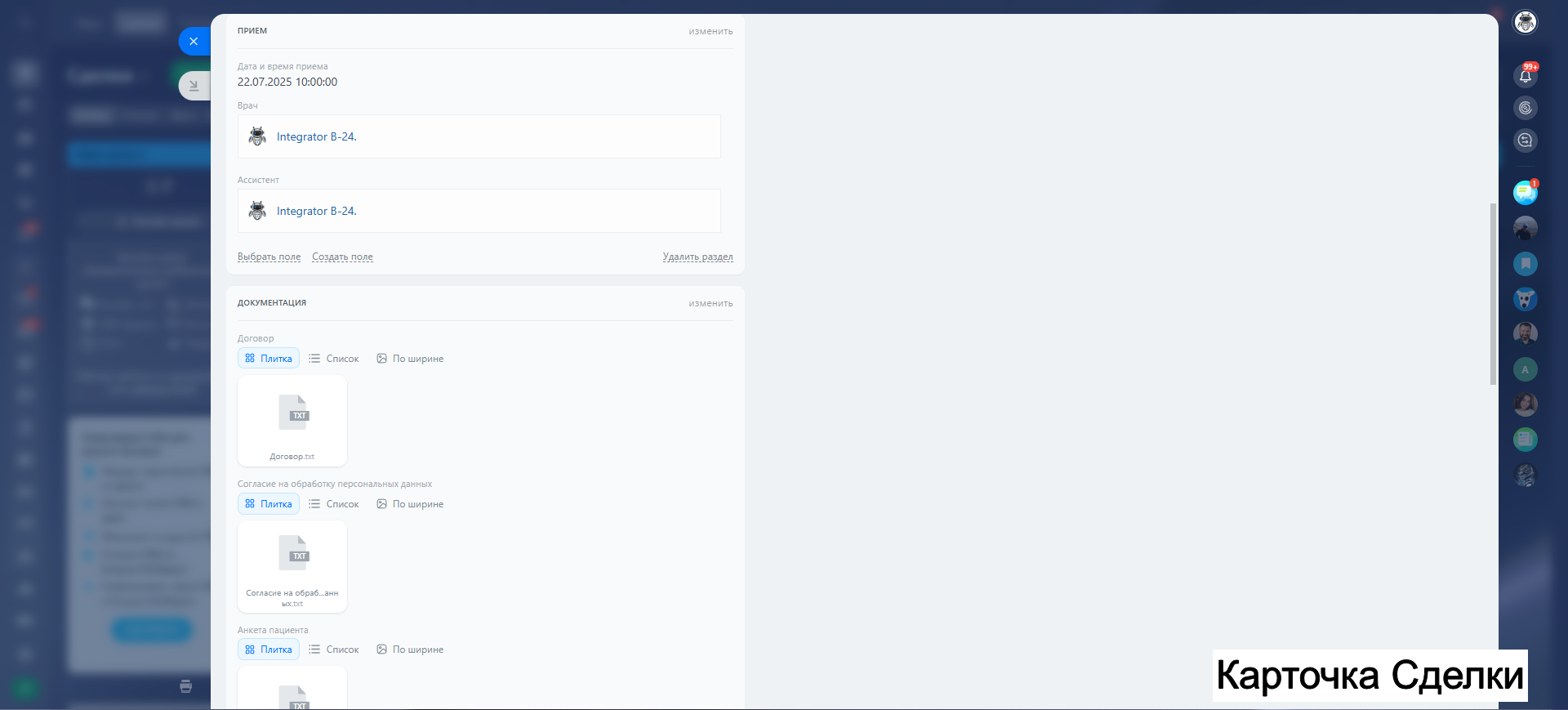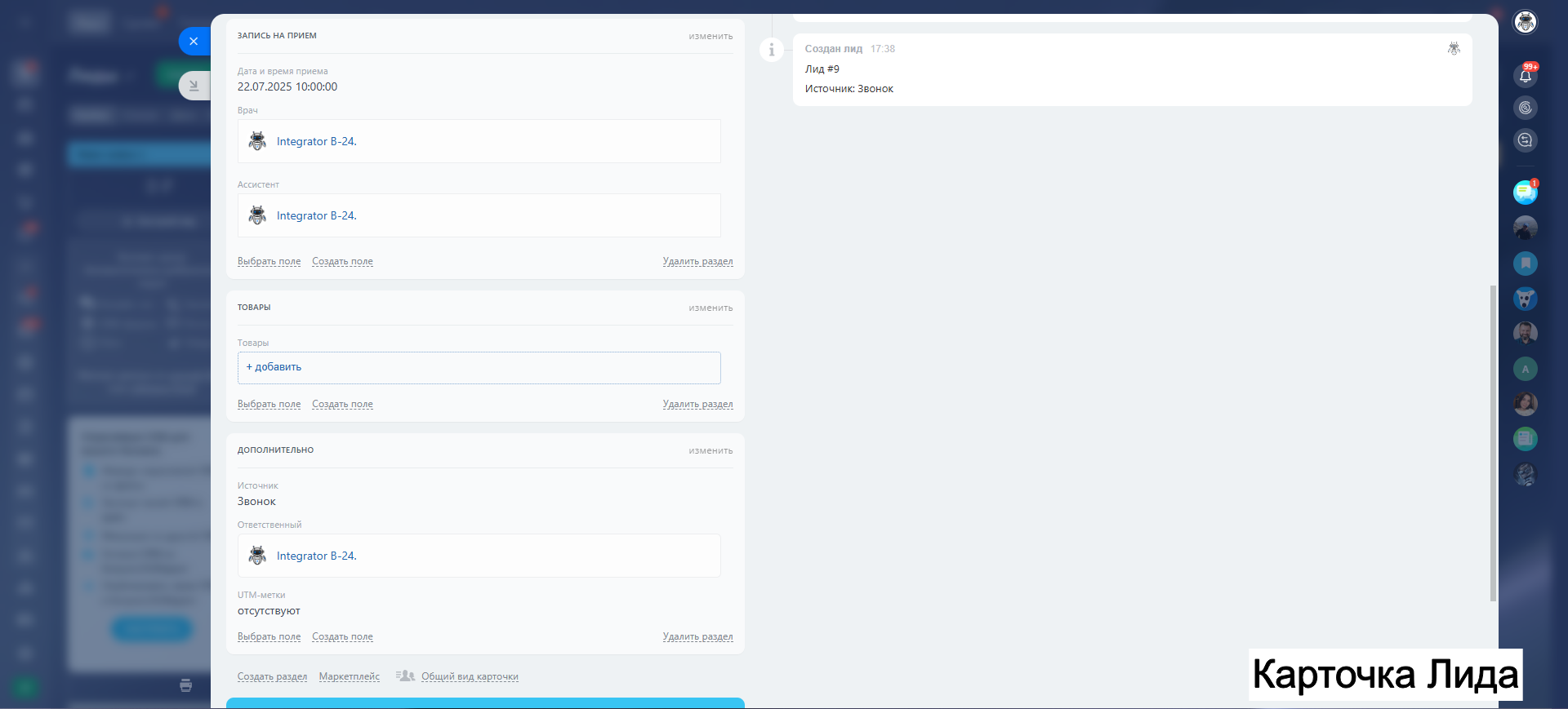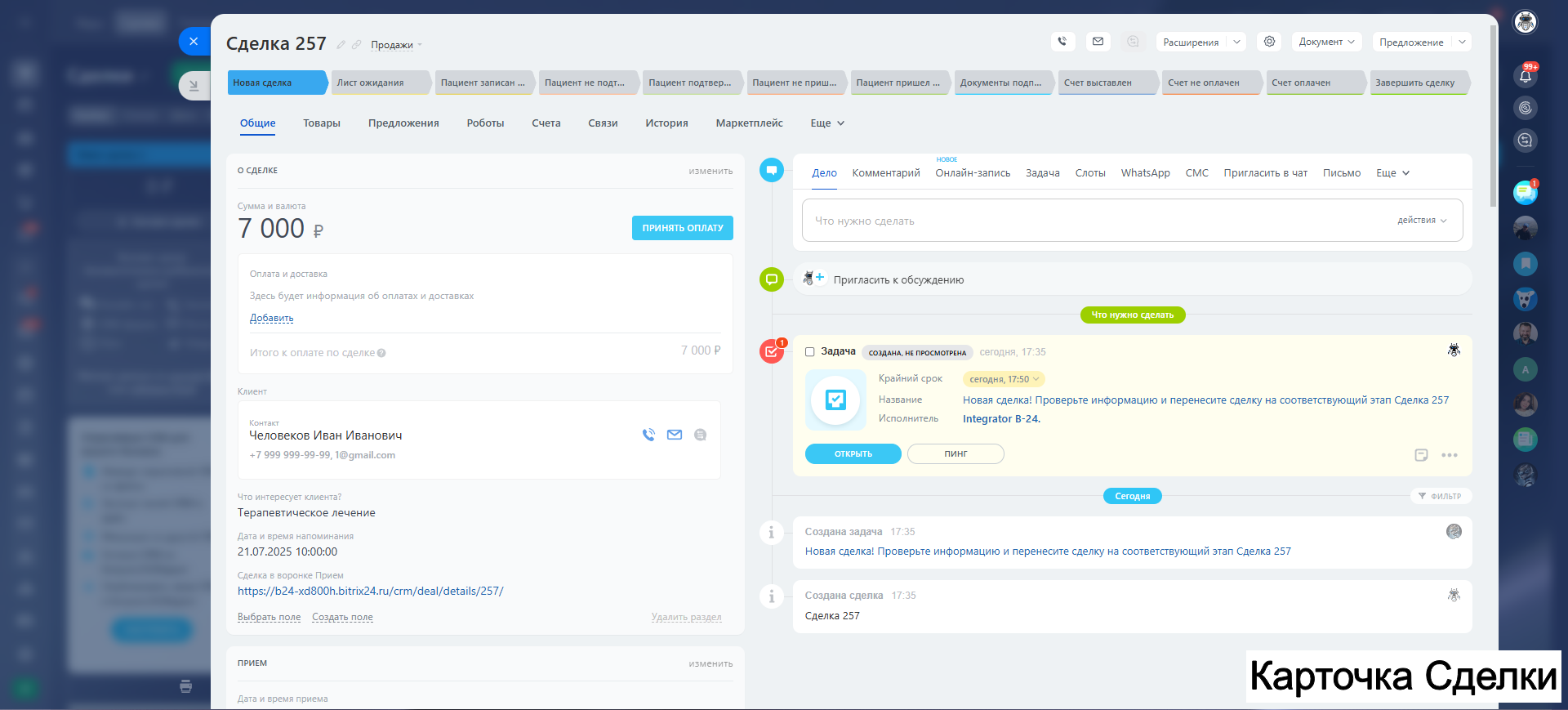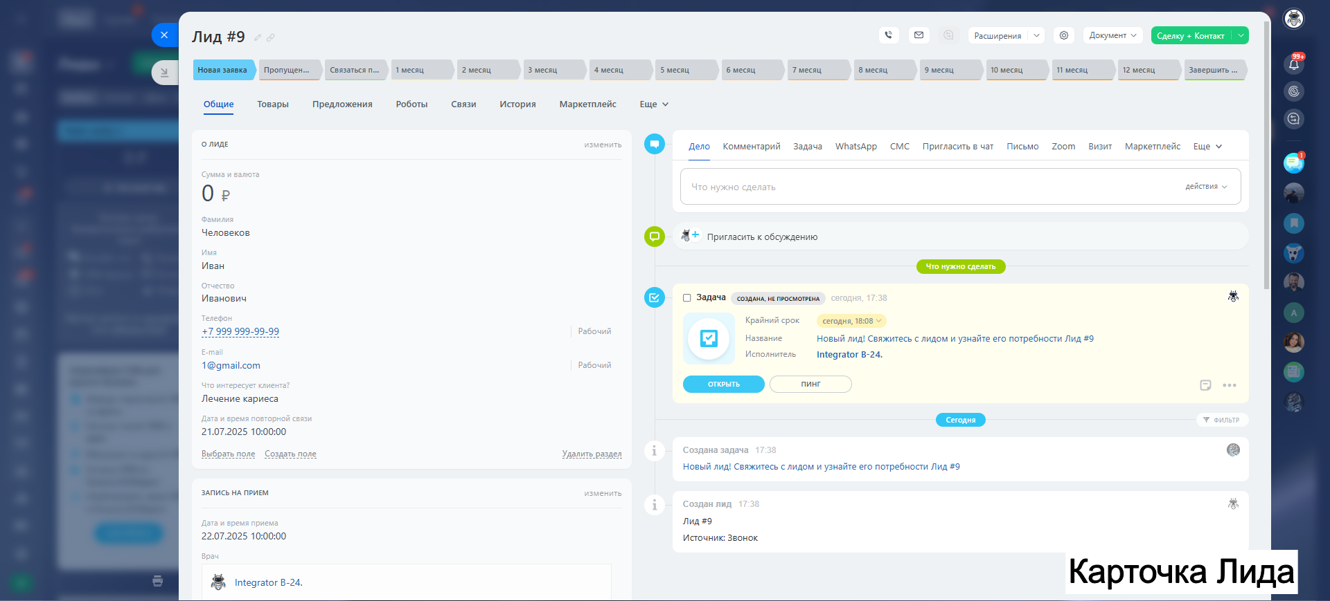 - Пациент оставил заявку на сайте — CRM сразу создала лид и поставила задачу администратору.