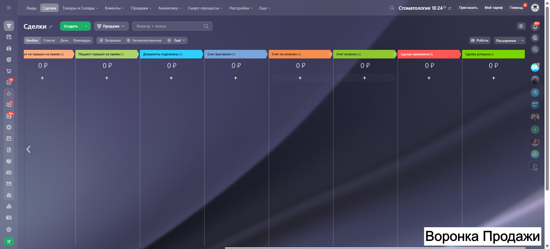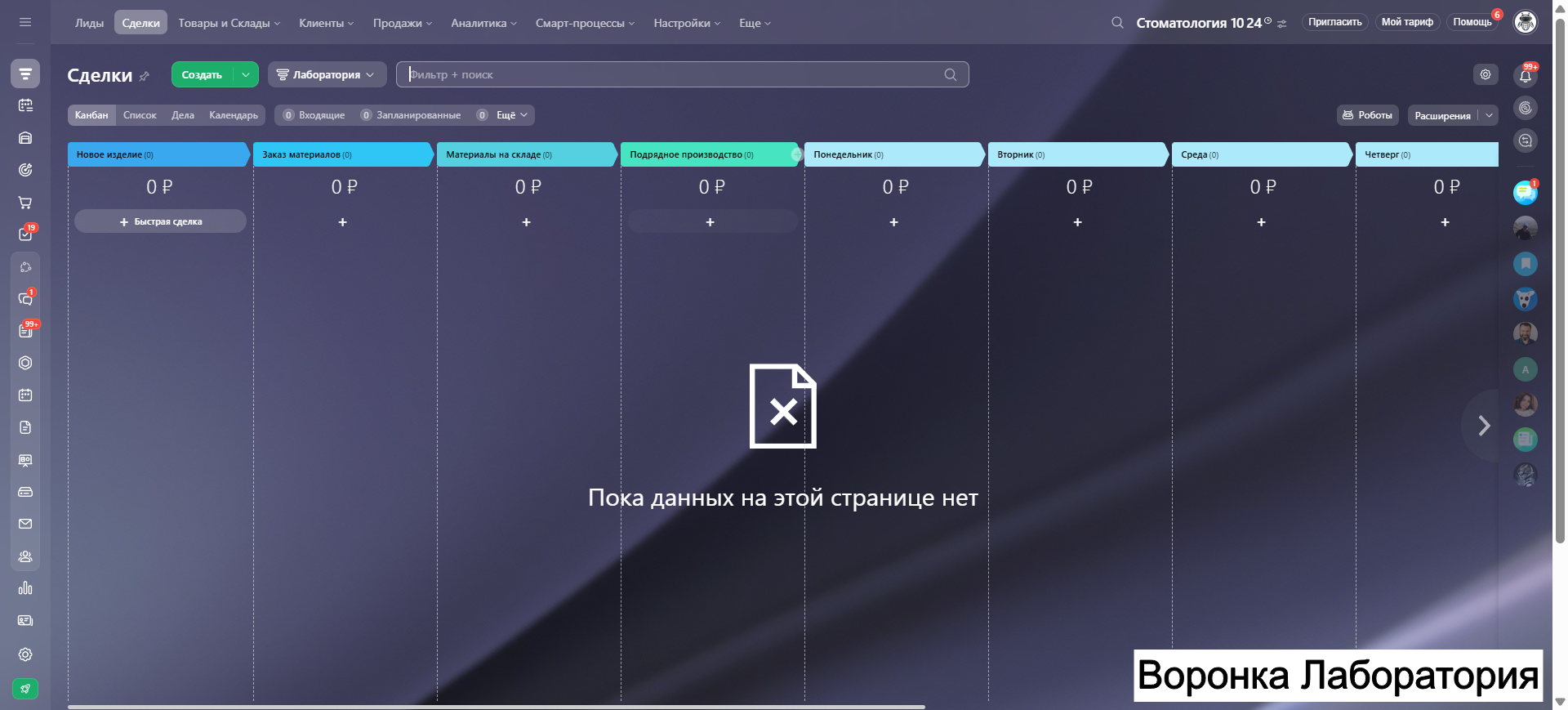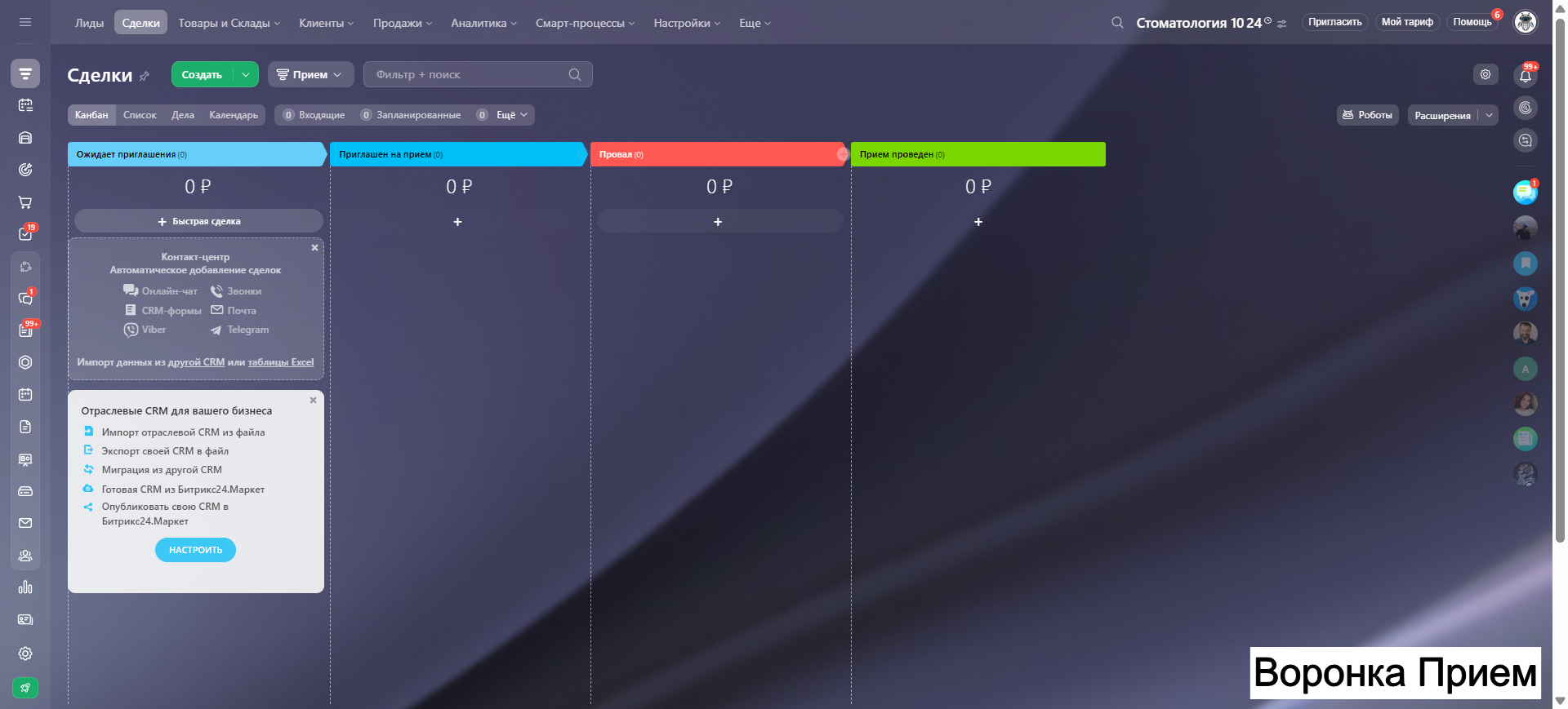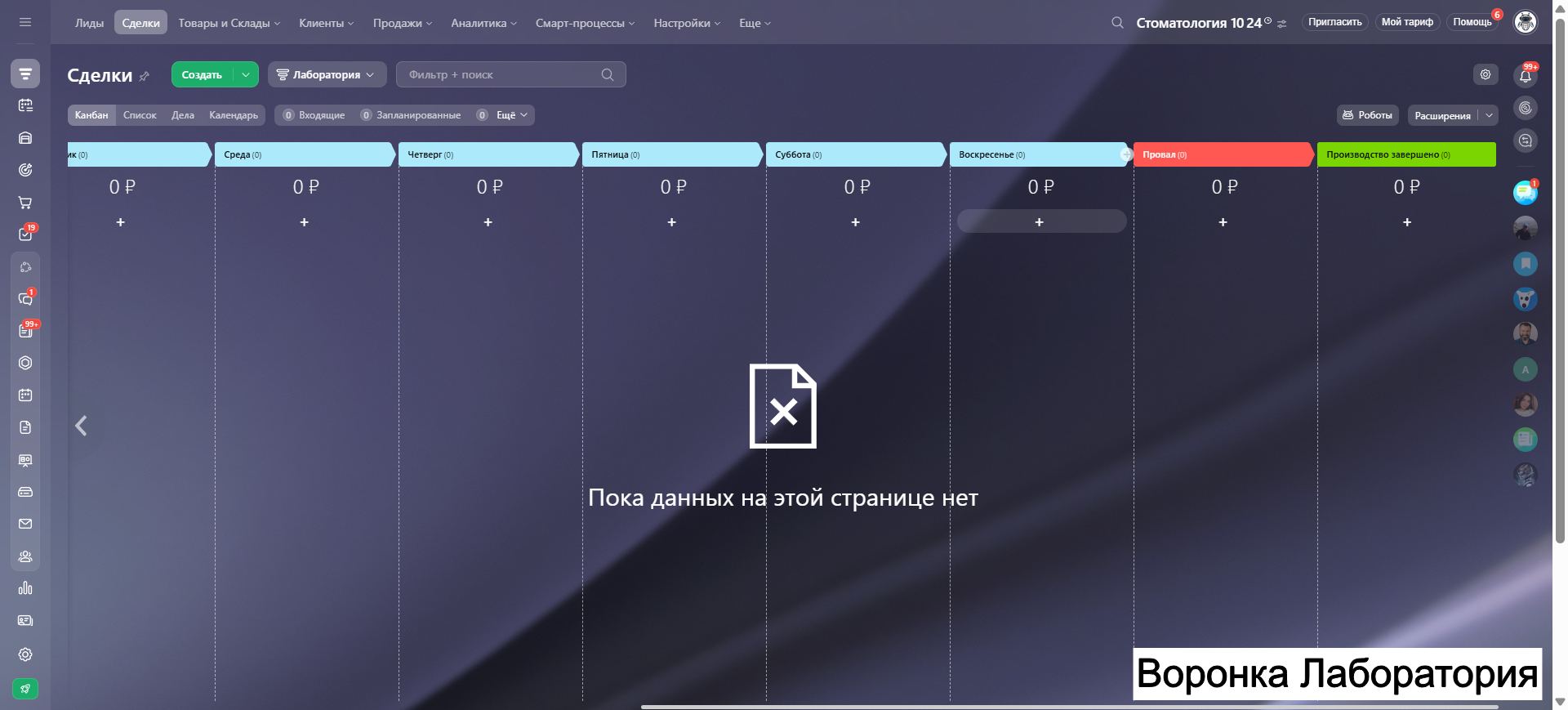 Готовая CRM для стоматологии — это комплекс из 10 воронок, созданных специально для автоматизации приёма пациентов, обработки звонков, выставления счетов, обратной связи и лабораторных заказов.