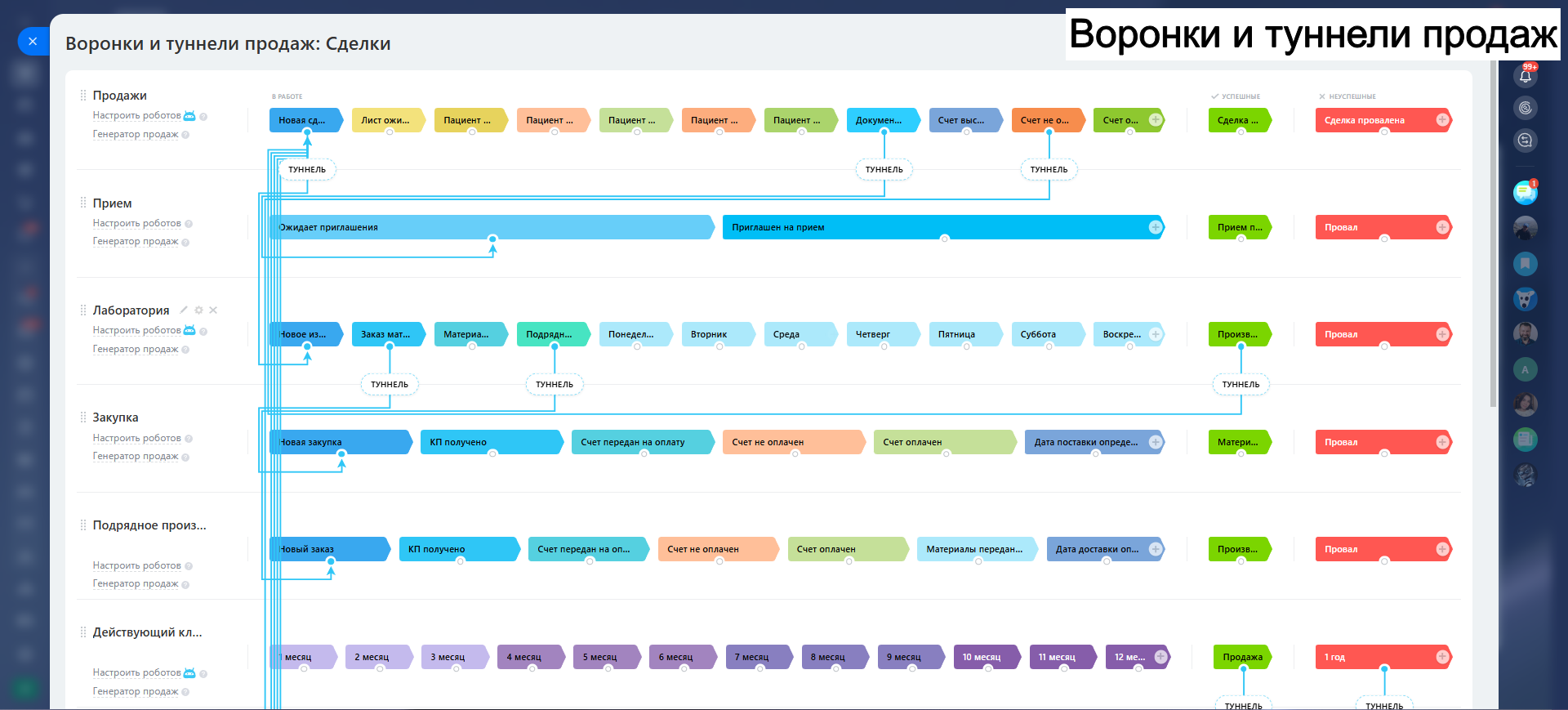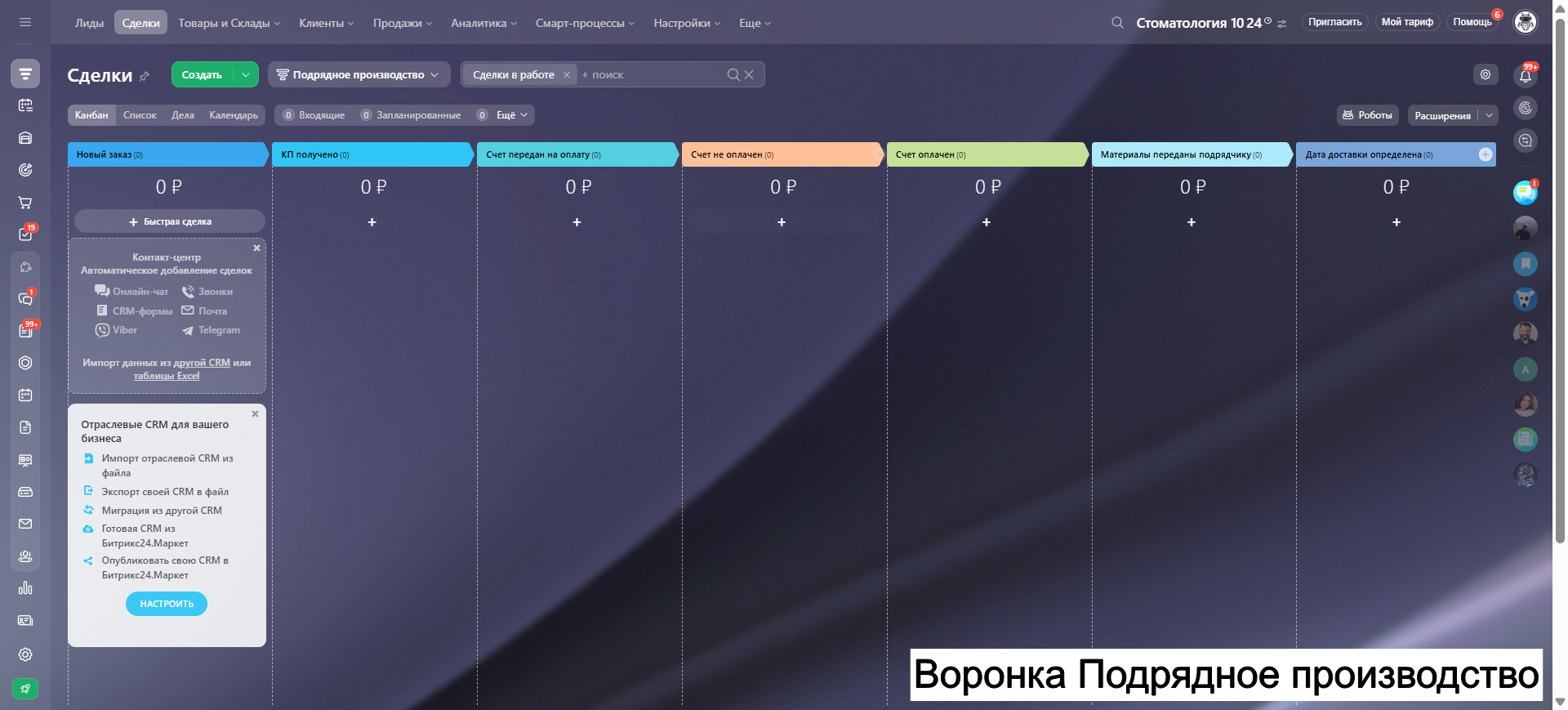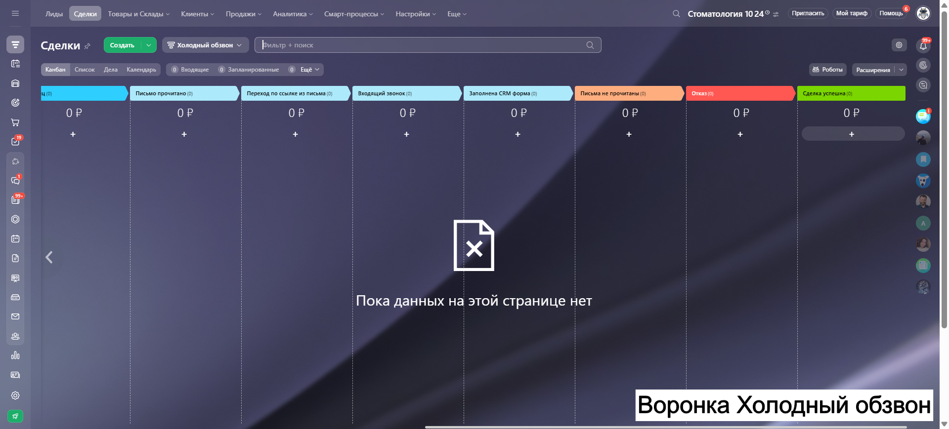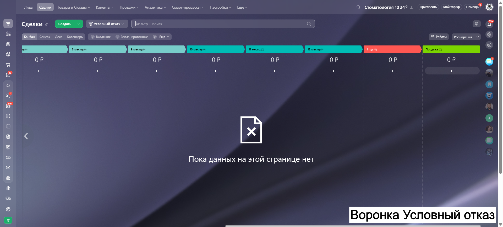 Готовая CRM для стоматологии — это комплекс из 10 воронок, созданных специально для автоматизации приёма пациентов, обработки звонков, выставления счетов, обратной связи и лабораторных заказов.