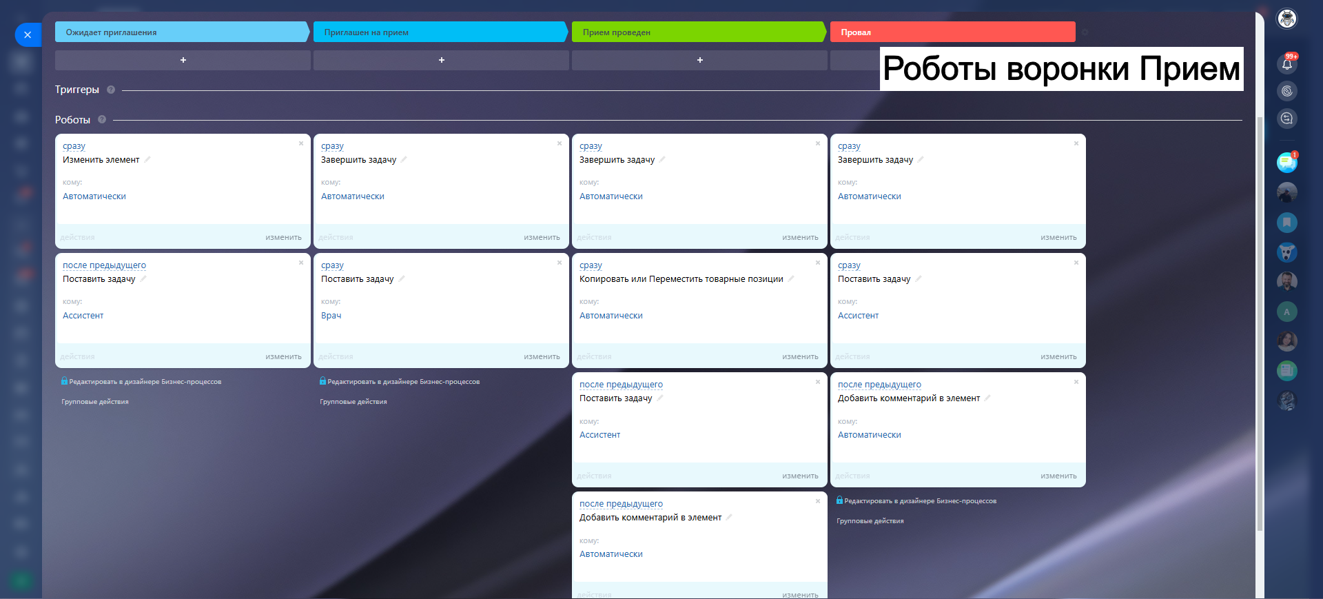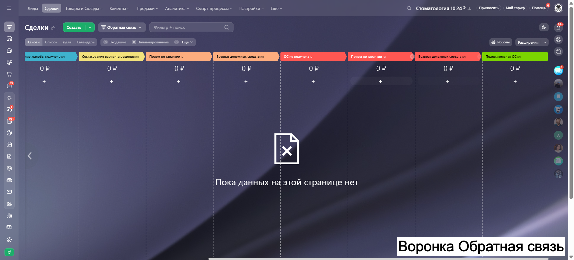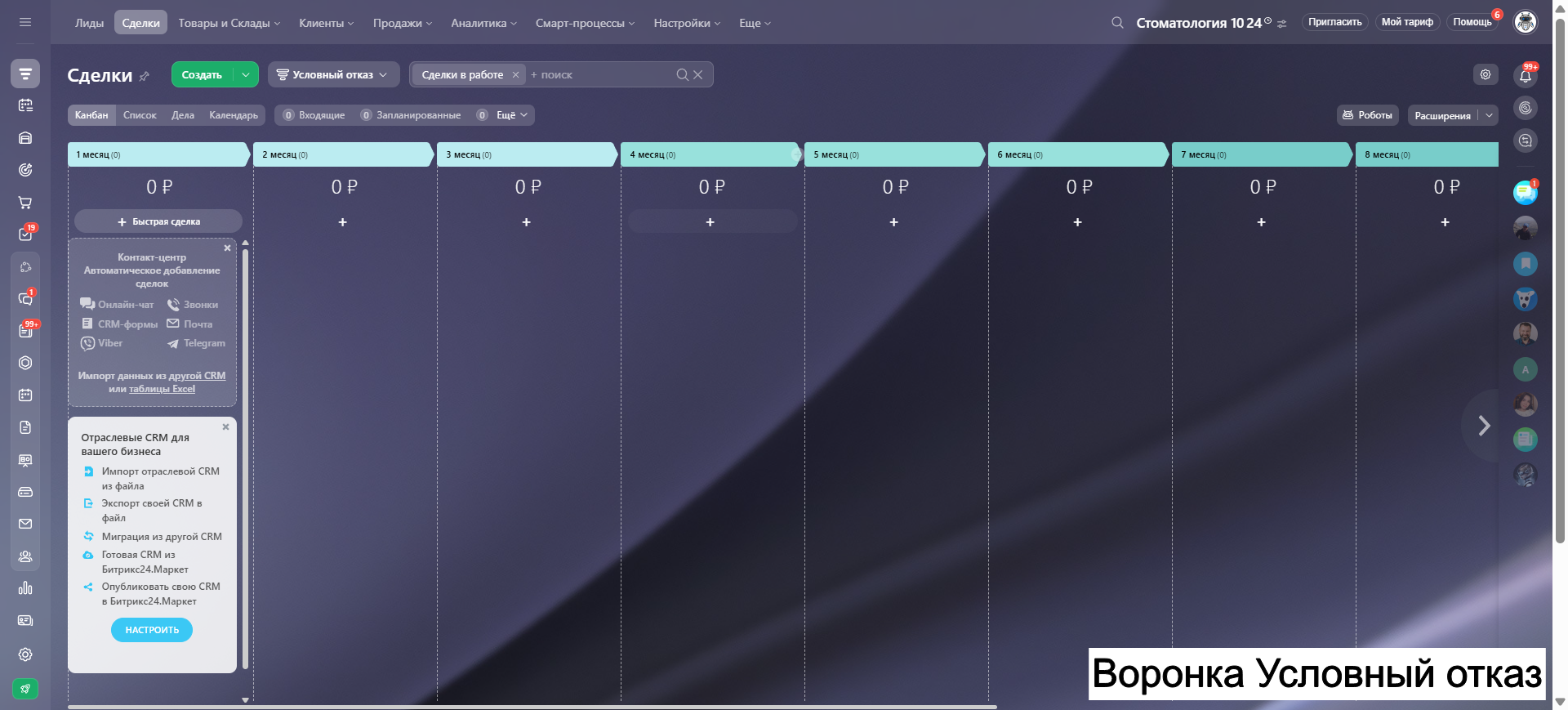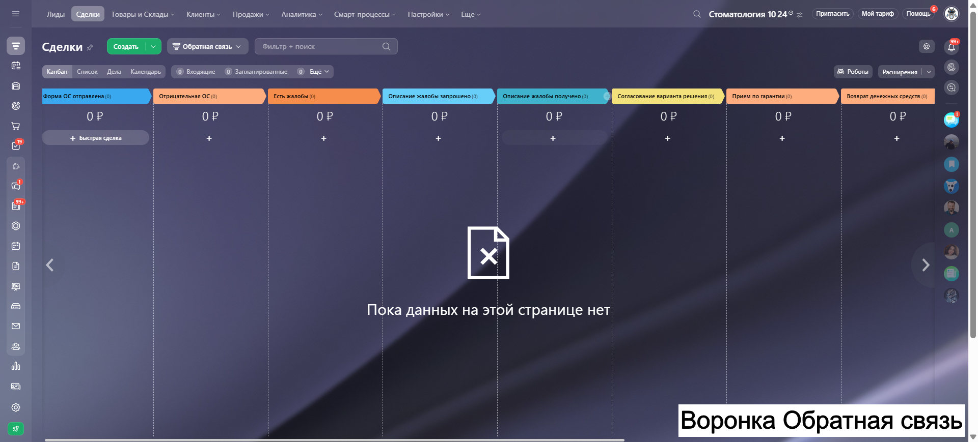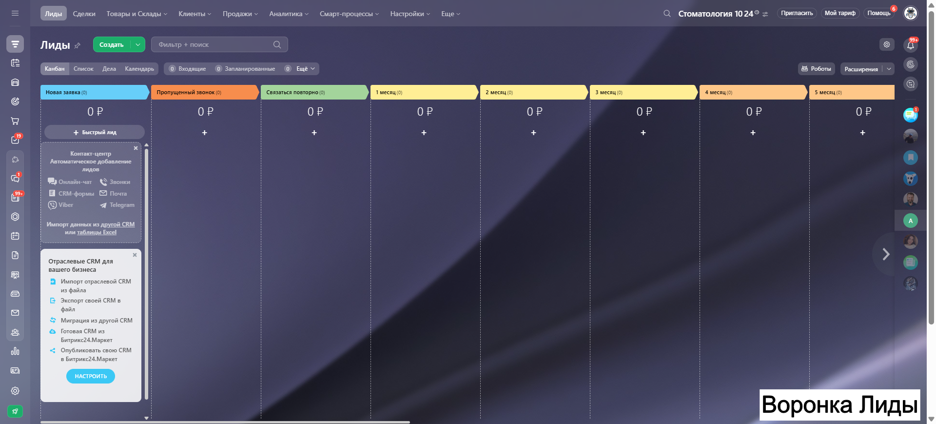 Готовая CRM для стоматологии — это комплекс из 10 воронок, созданных специально для автоматизации приёма пациентов, обработки звонков, выставления счетов, обратной связи и лабораторных заказов.