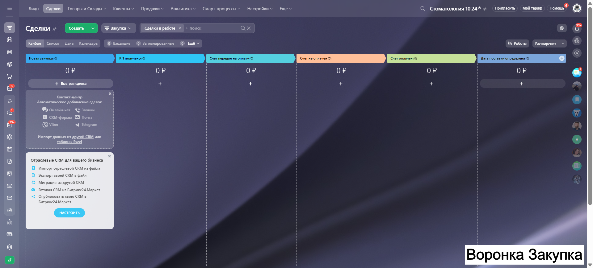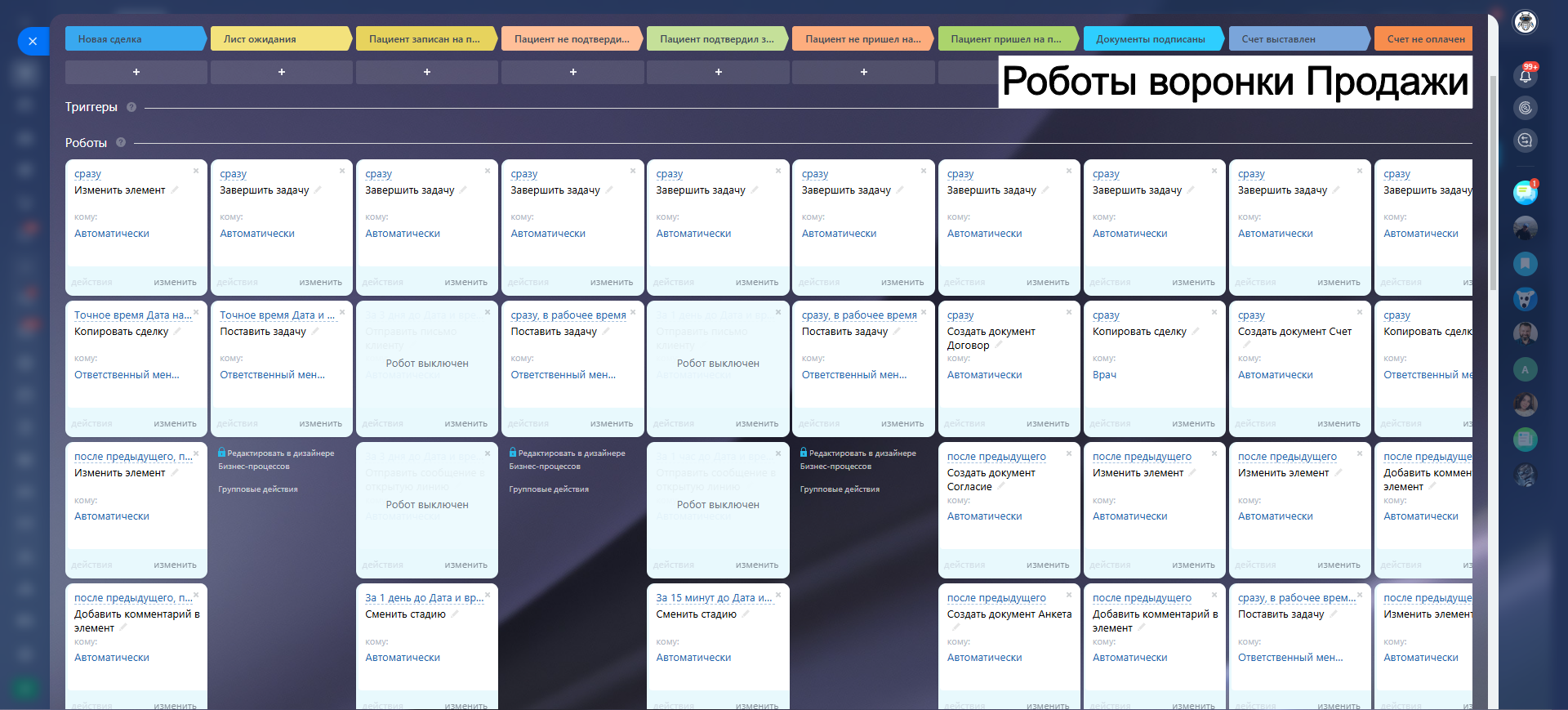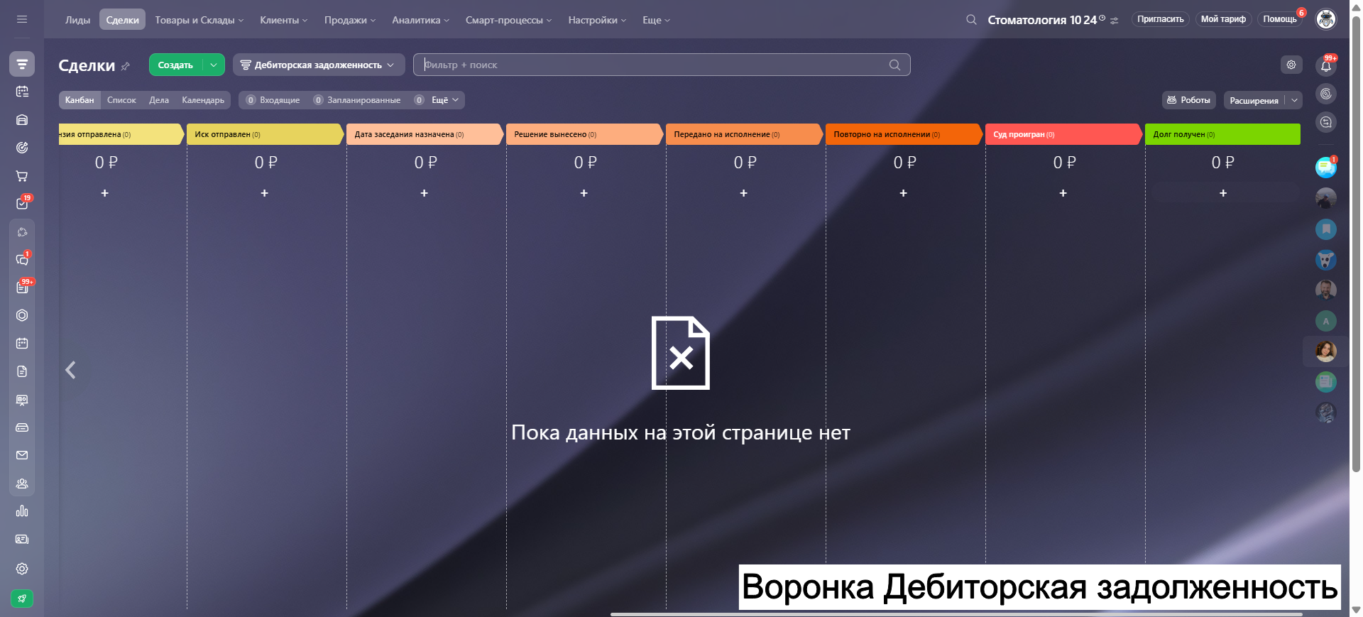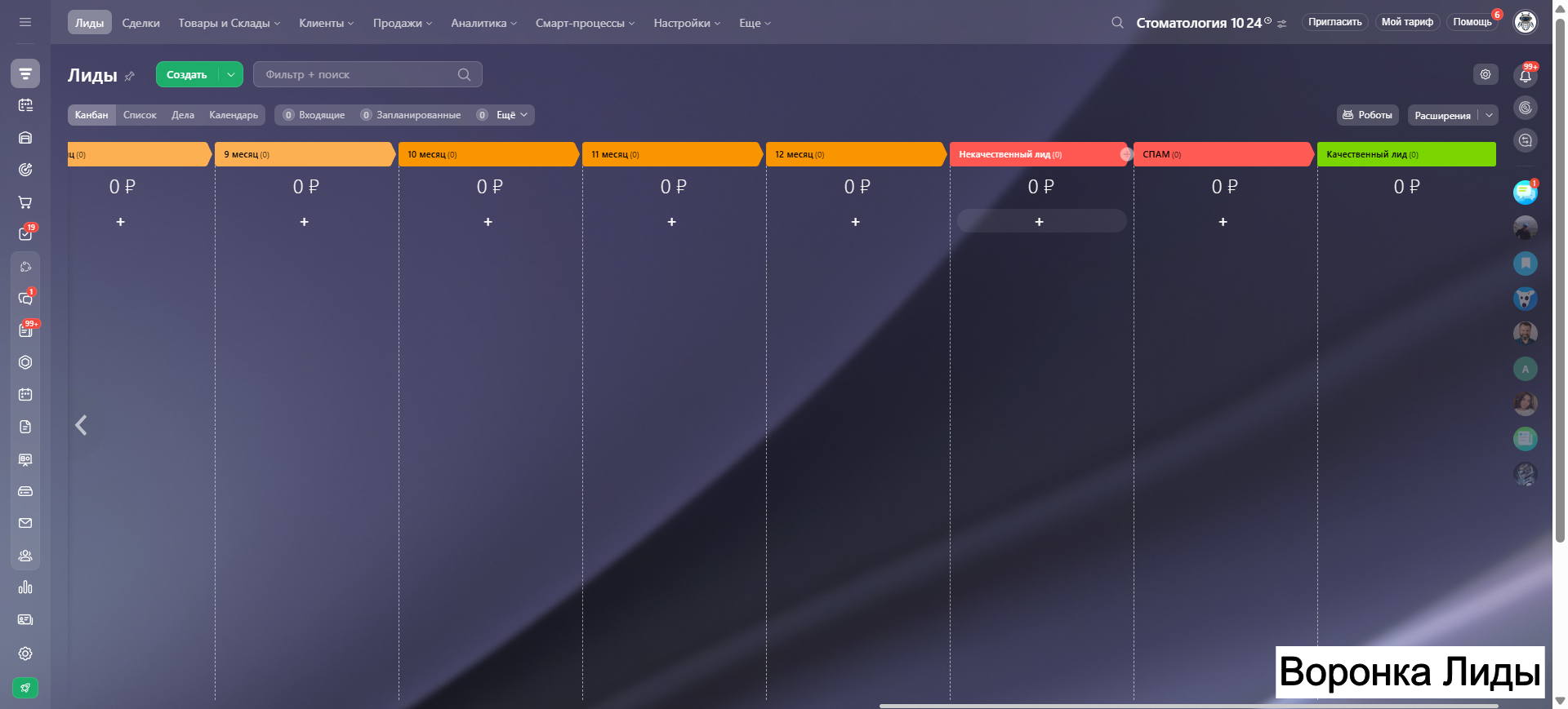 Готовая CRM для стоматологии — это комплекс из 10 воронок, созданных специально для автоматизации приёма пациентов, обработки звонков, выставления счетов, обратной связи и лабораторных заказов.