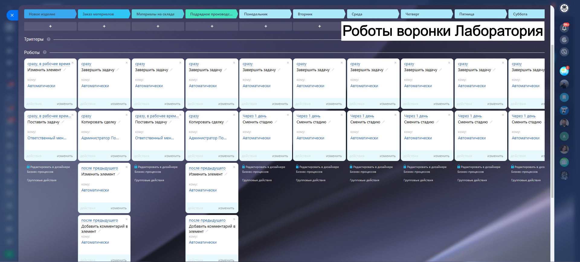 - Лаборатория и закупки. Управление материалами, заказами у подрядчиков, сроками производства.
