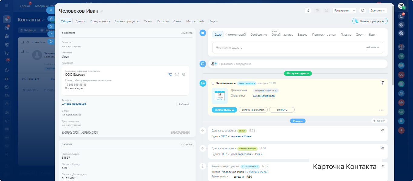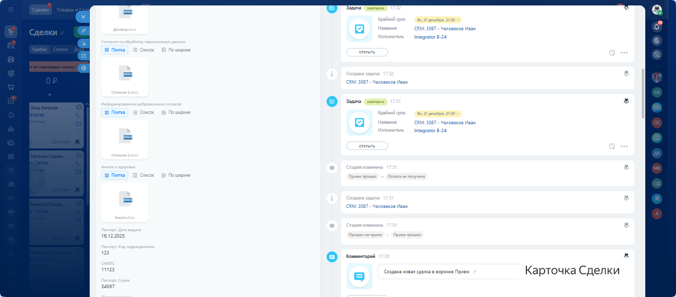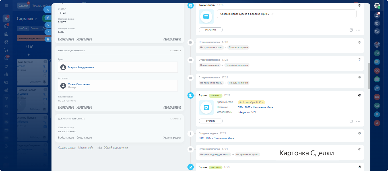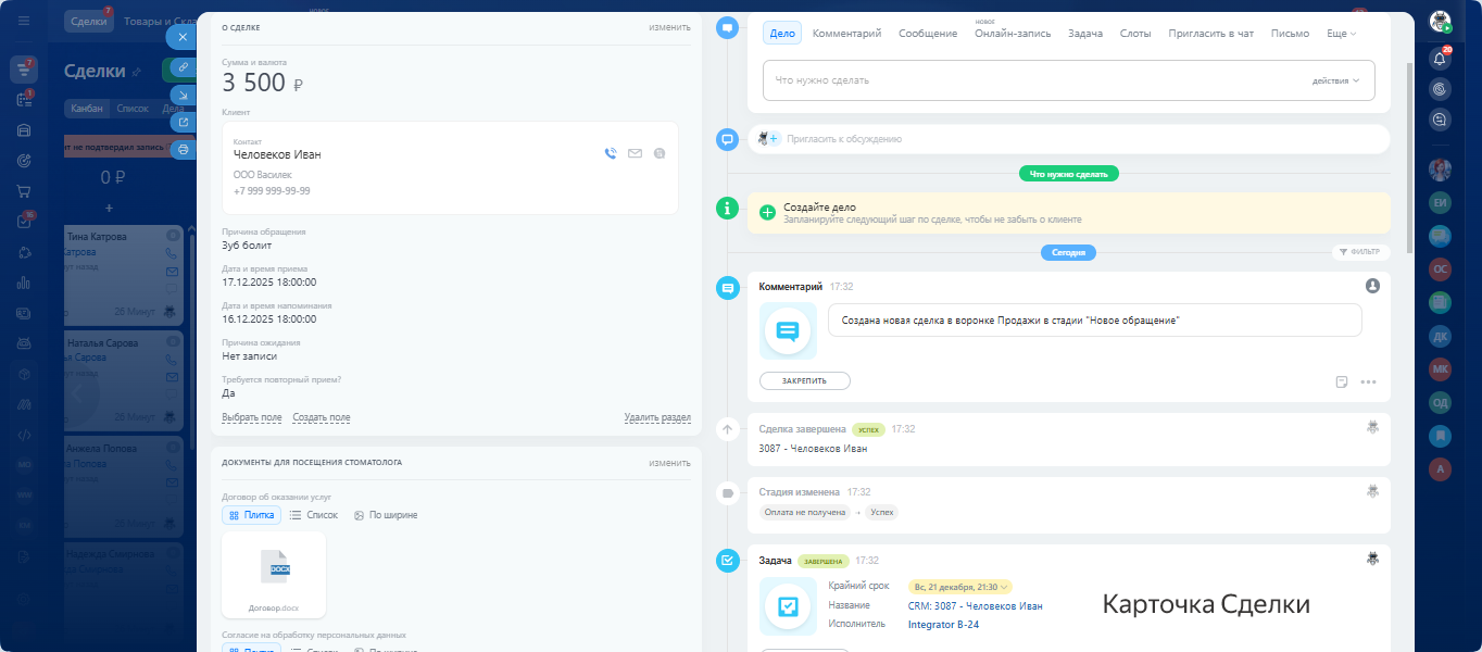 - Пациент обращается — CRM создаёт сделку