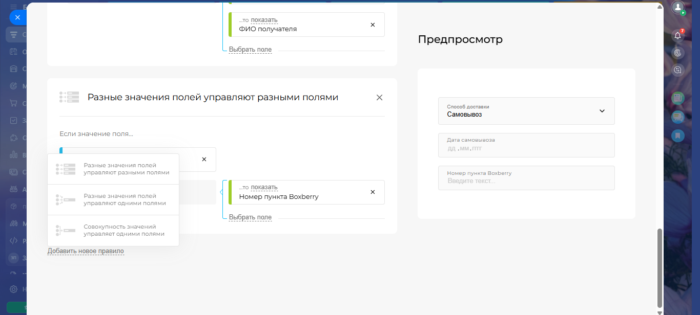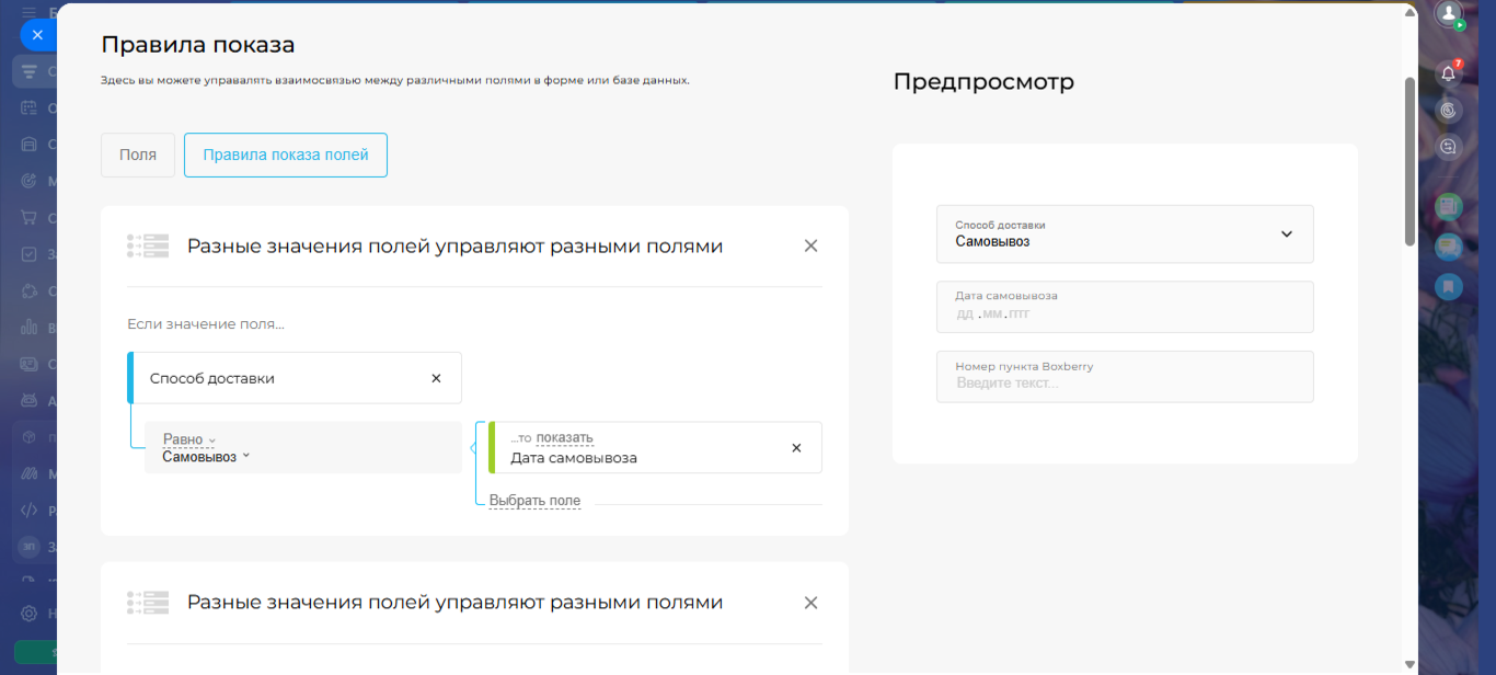2. Настраиваете правила (например: «Если способ доставки = Курьер → показать "Адрес доставки"»).