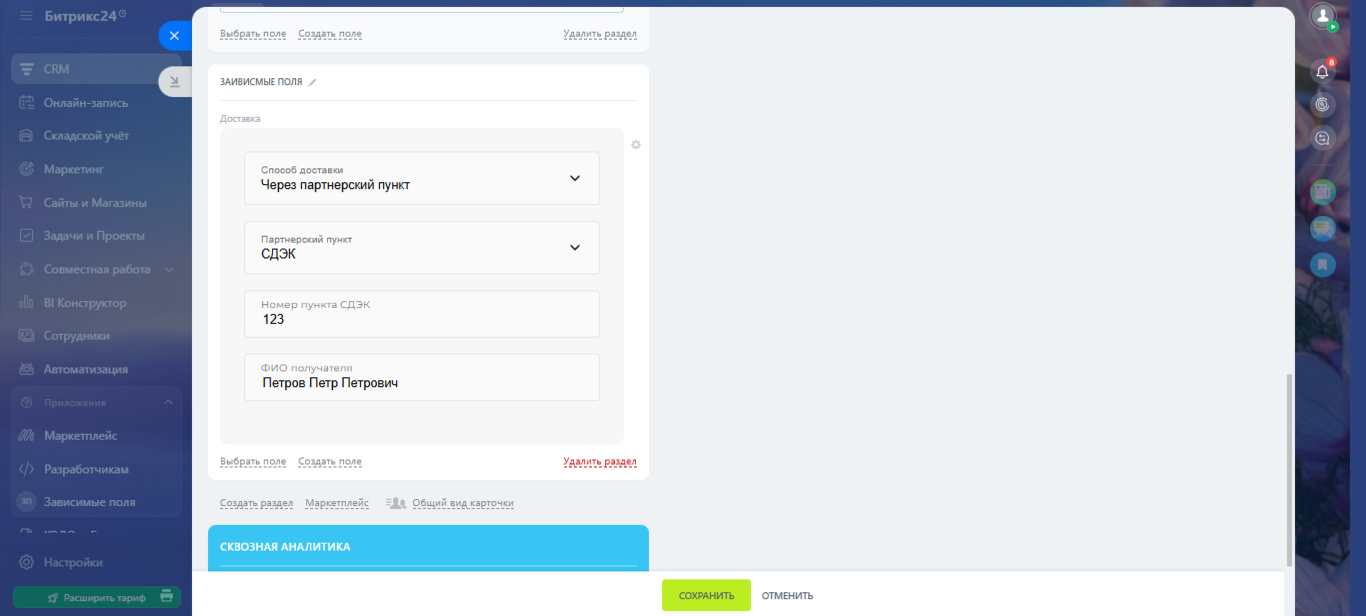 В стандартной CRM все поля отображаются сразу, что создает путаницу и увеличивает время заполнения. Например, если клиент выбирает «Самовывоз», ему не нужны поля «Адрес доставки», но система все равно их показывает.