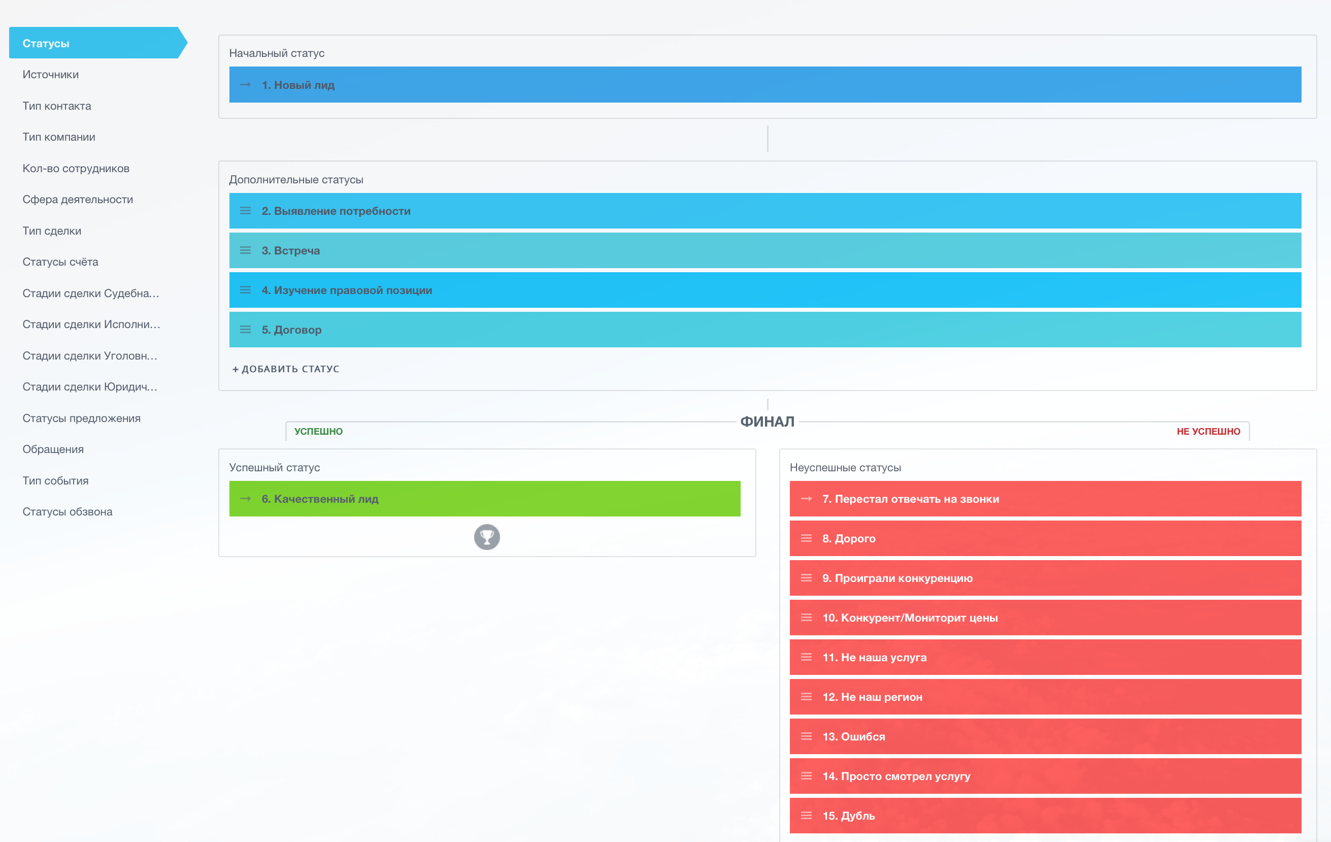 Негативные стадии для разделов лид и сделки: