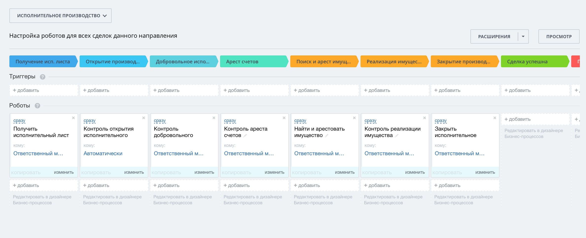 Направление сделки «Исполнительное производство» состоит из следующих этапов: