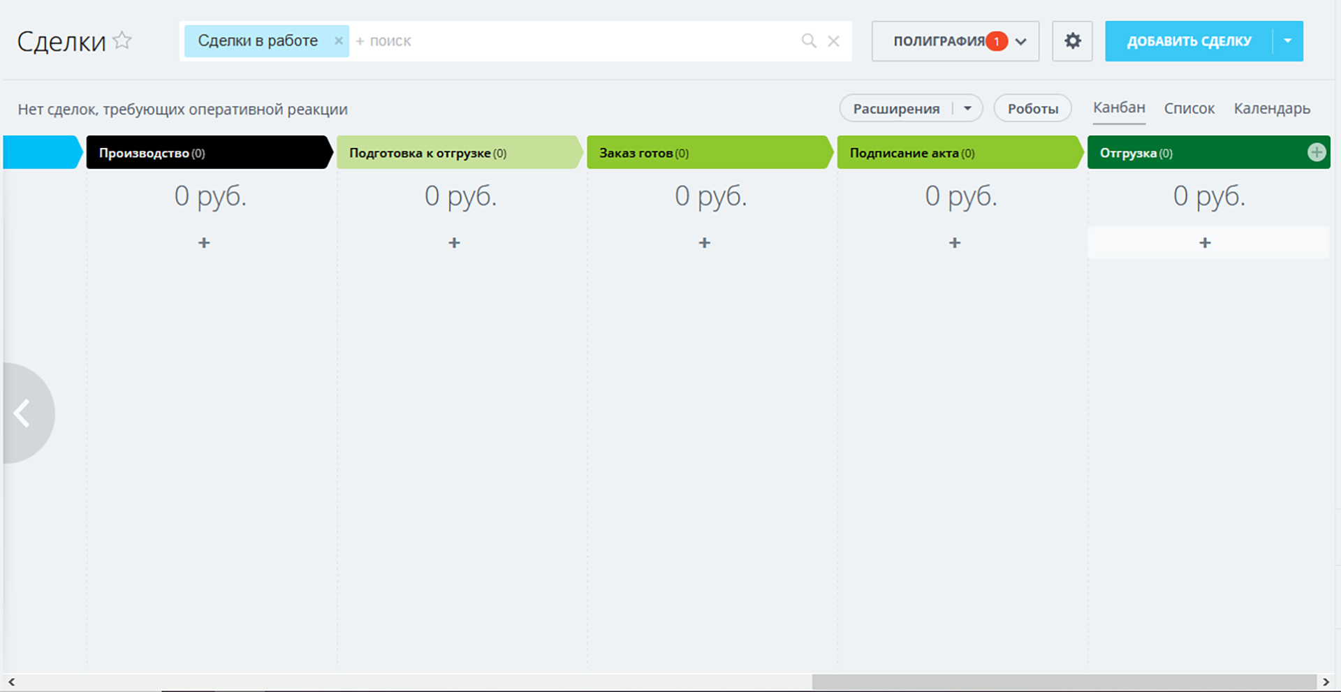 В случае успешного закрытия сделки в данном направлении, карточка сделки будет перемещена в воронку «Полиграфия»: