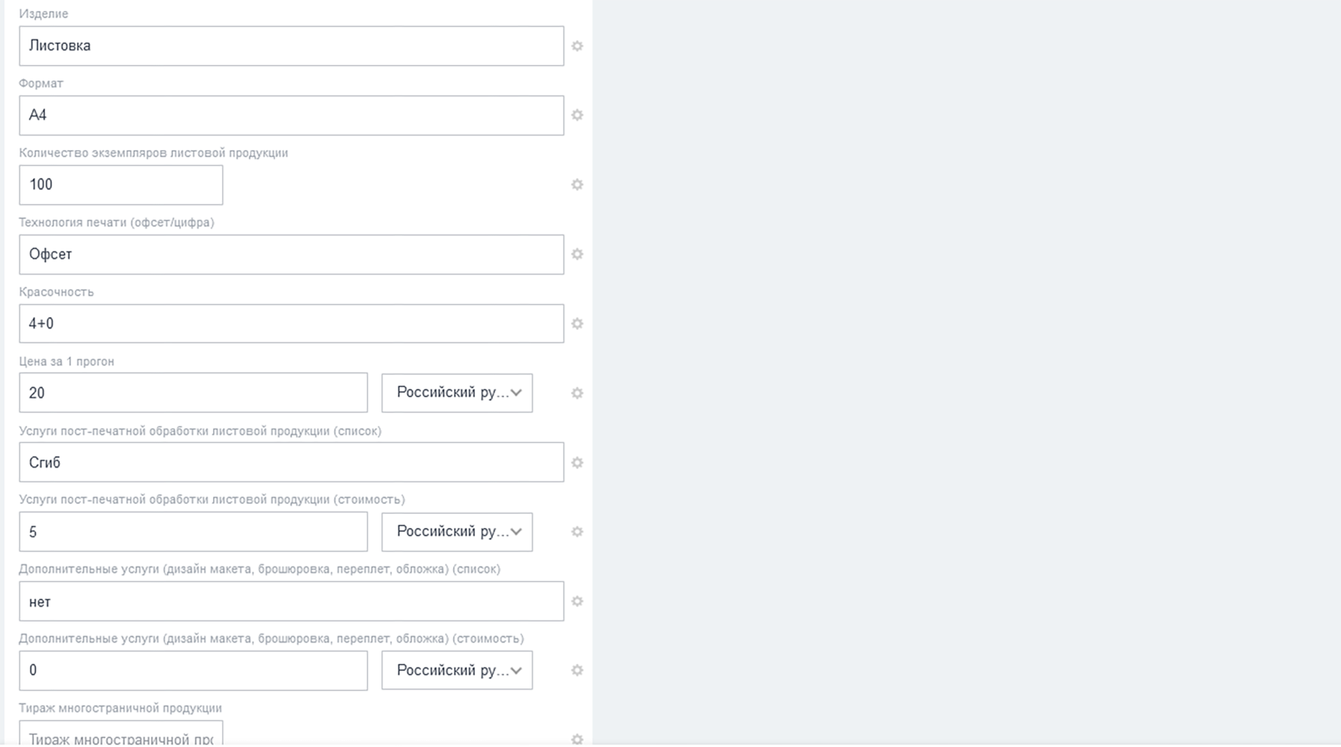 - Услуги пост-печатной обработки продукции (стоимость). Тип «деньги».