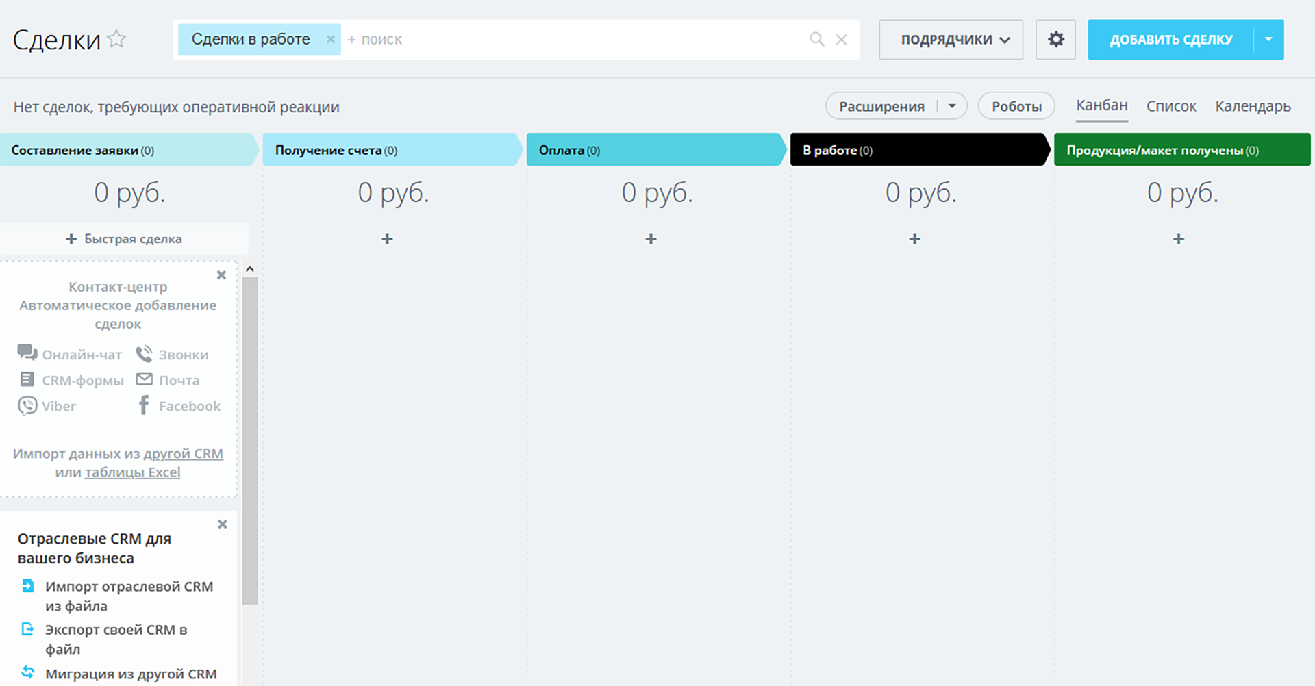 - 3 направления сделок: «Полиграфия», «Подрядчики» и «Прогрев».