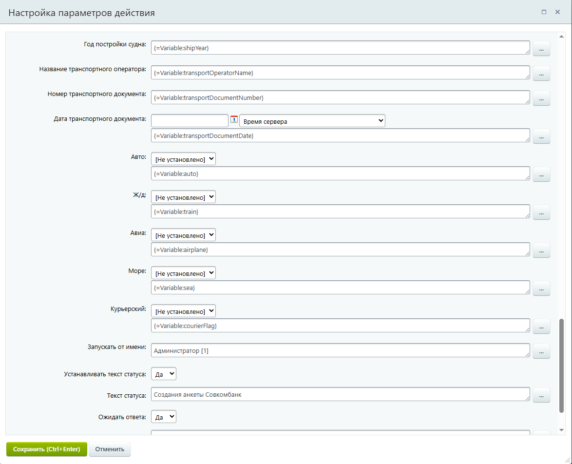 2. С помощью действия «Создание анкеты…» оправить анкету в сервис. В ответ будет получен id анкеты. Сохраните его в переменной или поле элемента для получения статуса этой анкеты.