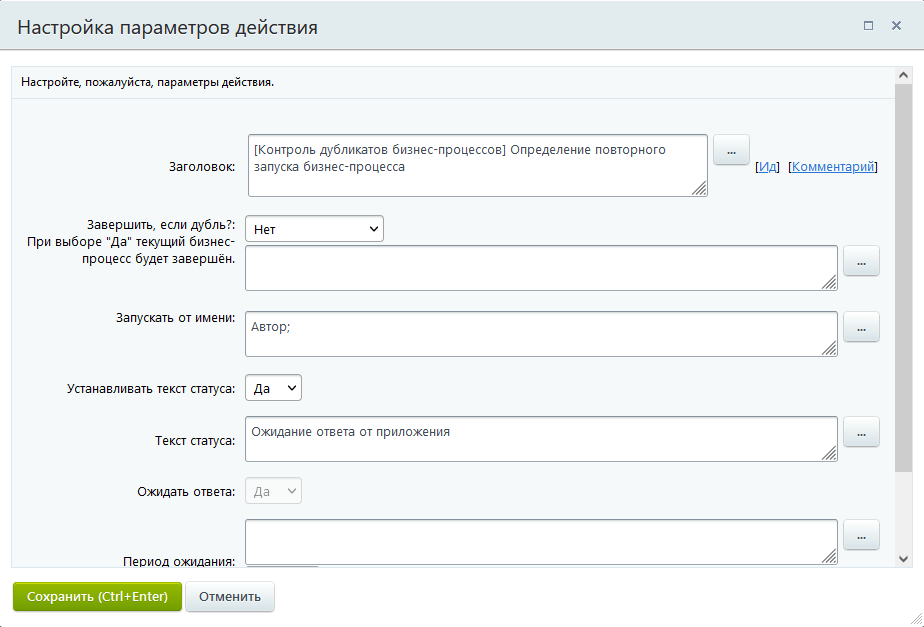 Данное Действие проверяет, запущен ли по текущей сущности бизнес-процесс из этого же шаблона, и в зависимости от настроек либо возвращает результат проверки ("Да" или "Нет" - это позволяет реализовать различные сценарии дальнейшей работы), либо останавливает текущий процесс. По умолчанию выставлена настройка, когда Действие возвращает результат проверки, но не останавливает текущий бизнес-процесс.