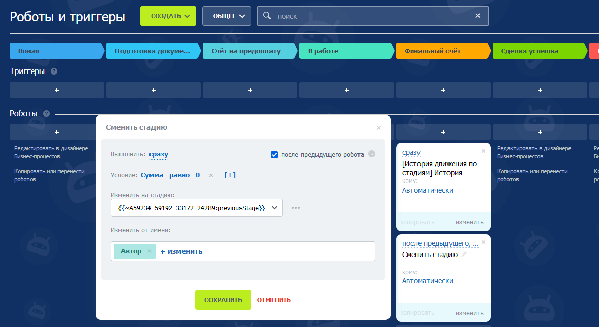 Данное приложение решает эту проблему, определяя предыдущую стадию, на которой находился Лид, Сделка, счёт или элемент смарт-процесса. Этот результат можно передать в стандартное действие "Изменение документа" и автоматически "откатить" некорректное перемещение.