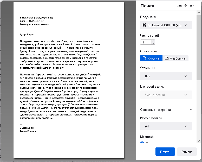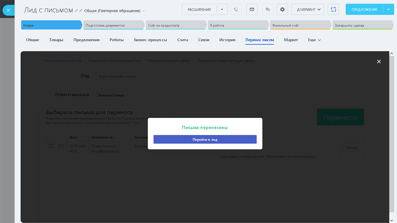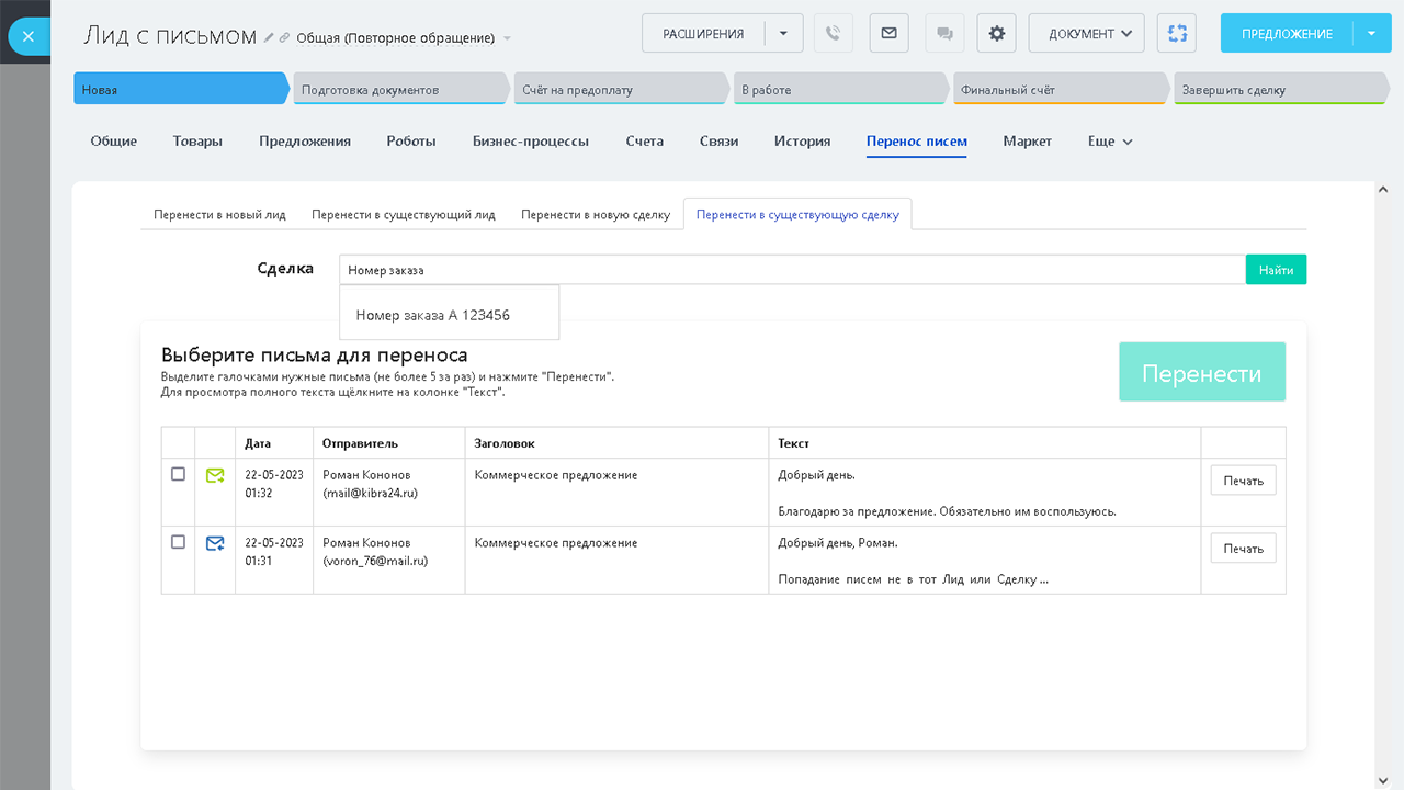 Перенос писем между Лидами или Сделками (с возможностью создания новых), а также их распечатка.