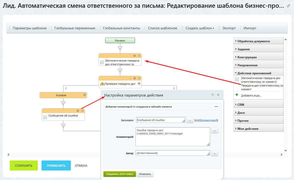 • Экономите время — настройка занимает минуты: добавьте действие в бизнес-процесс и включите автозапуск при изменении ответственного.
